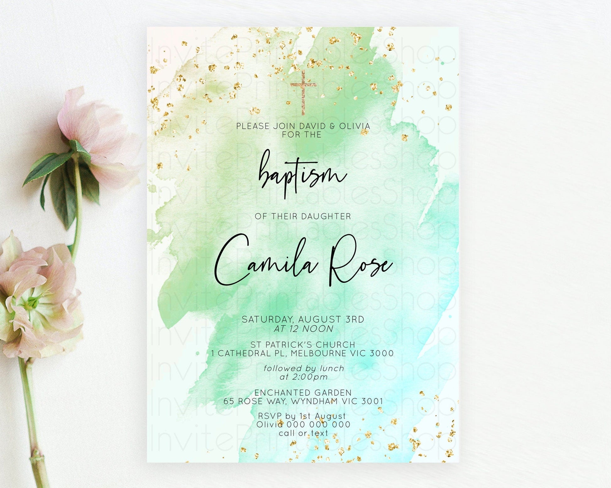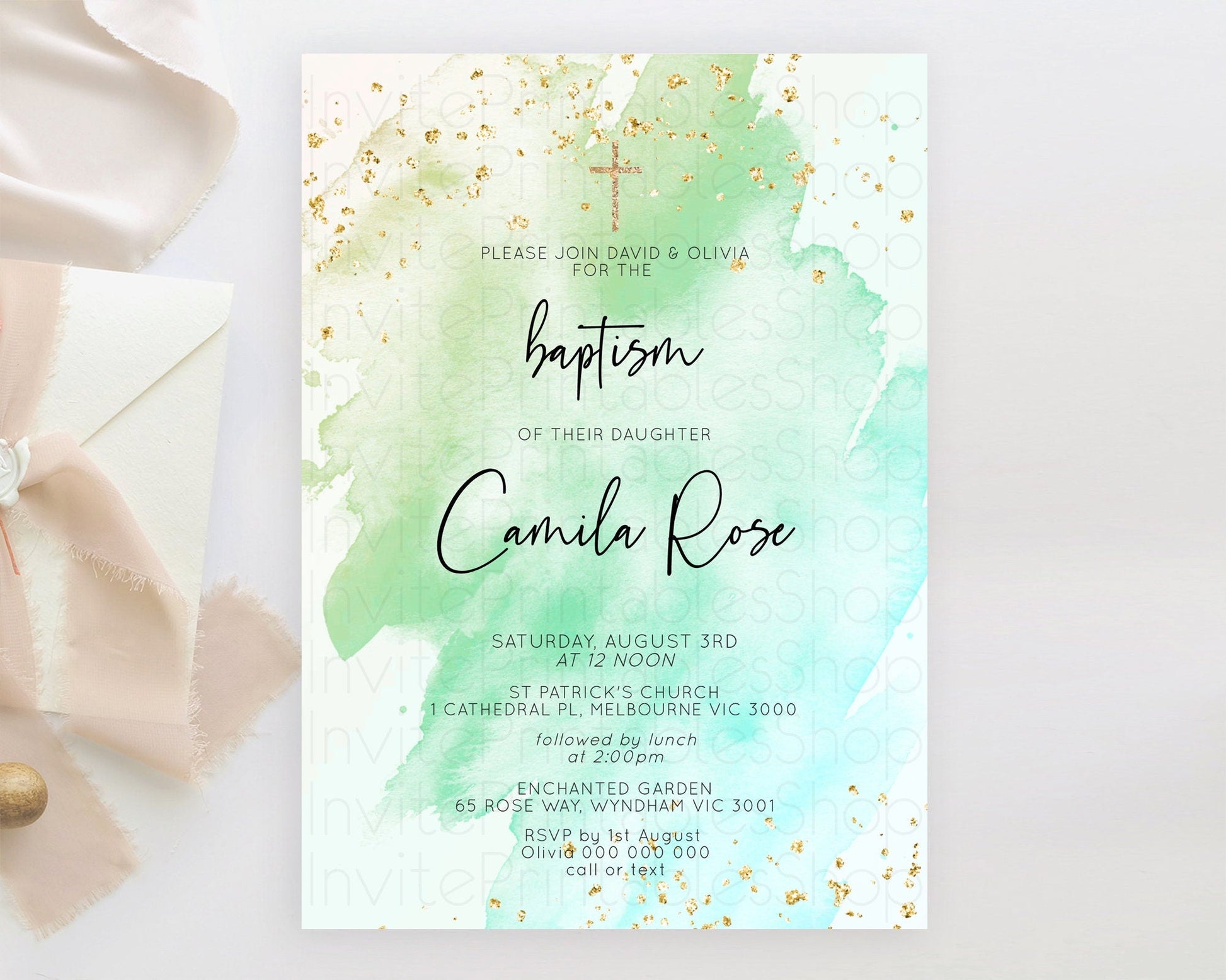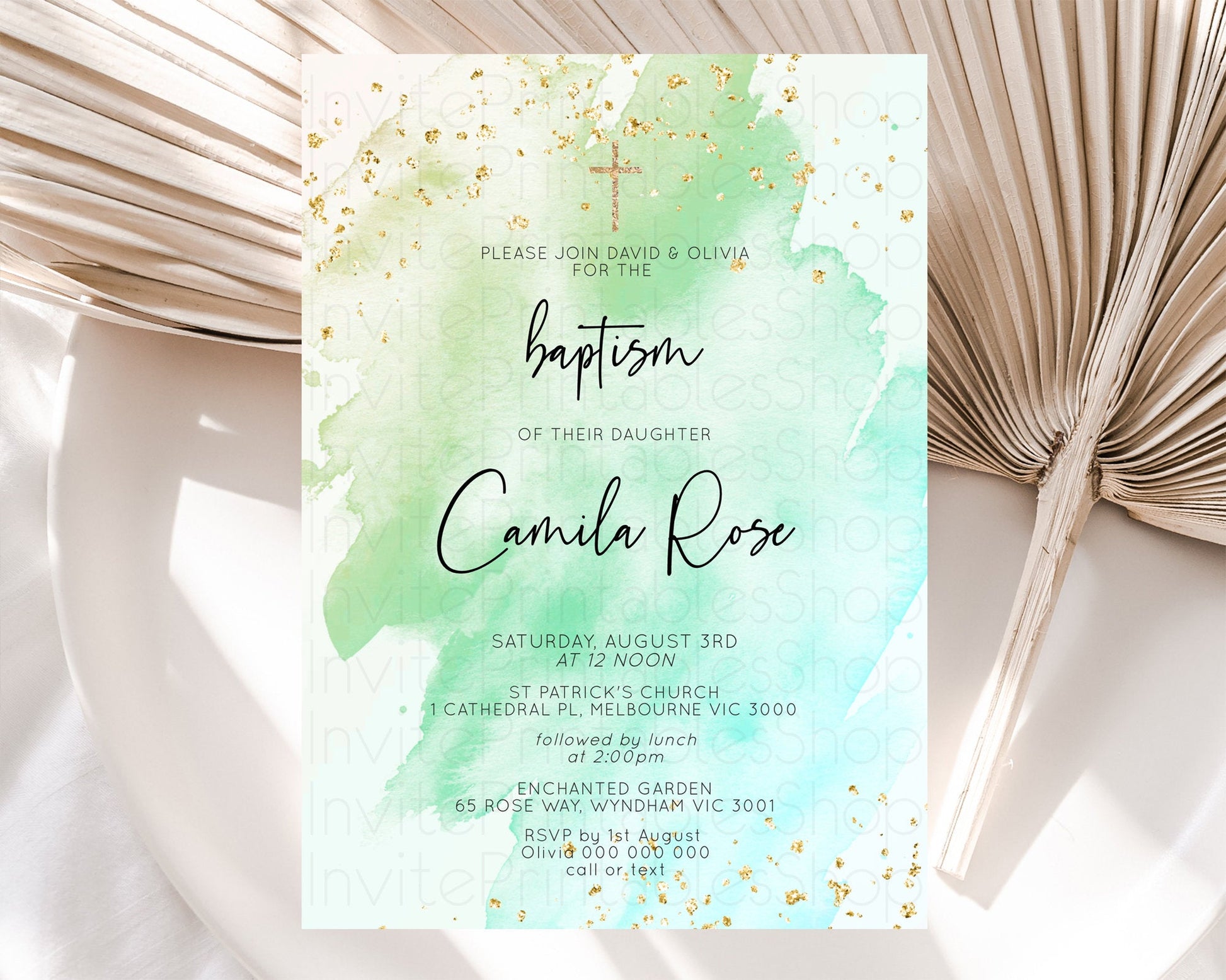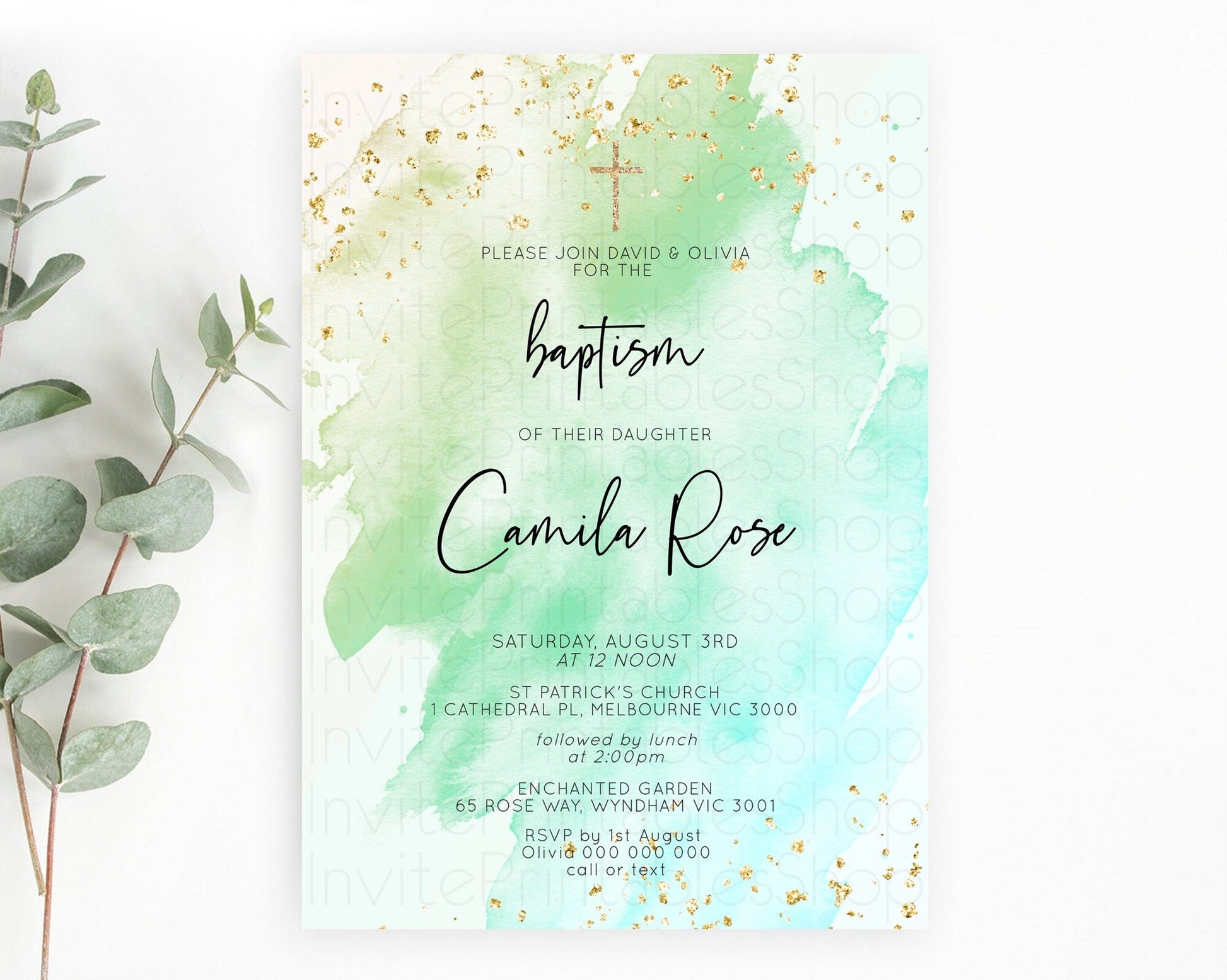 Green Watercolor Baptism Invitation