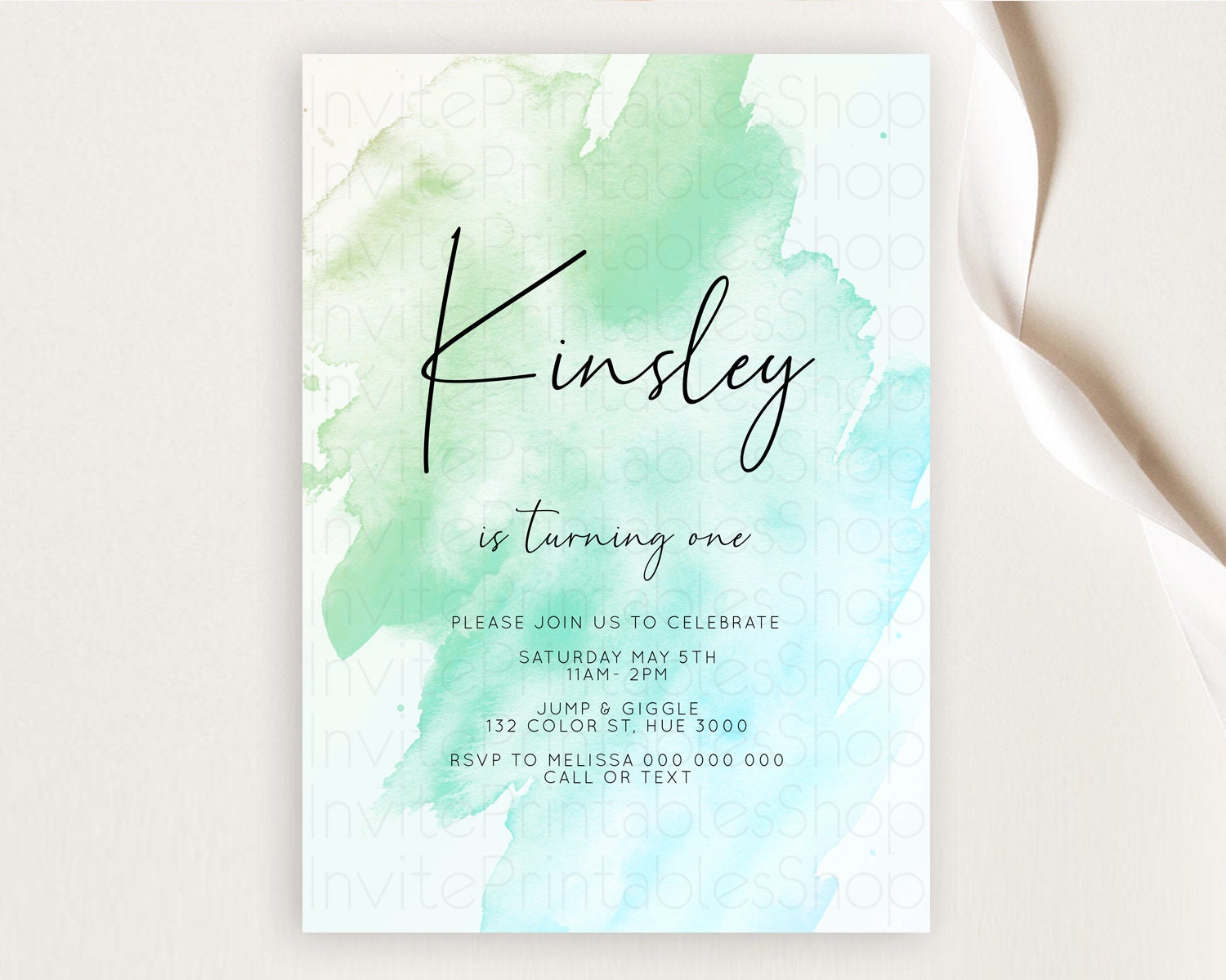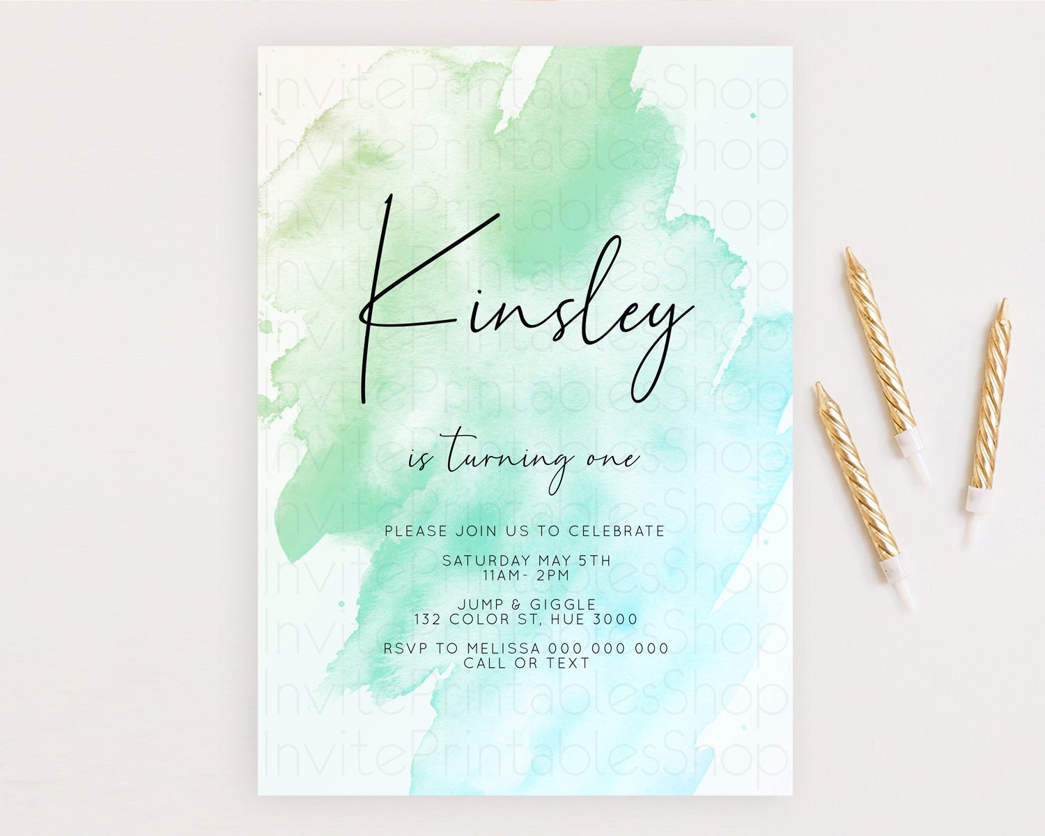 Green Birthday Invitation green Watercolor Invitation Pastel green Watercolor Invitation green Splash Gold Invitation First Birthday D10166
