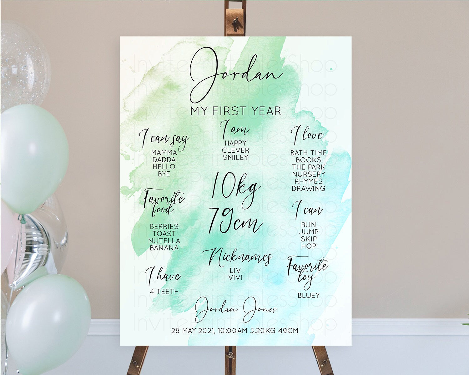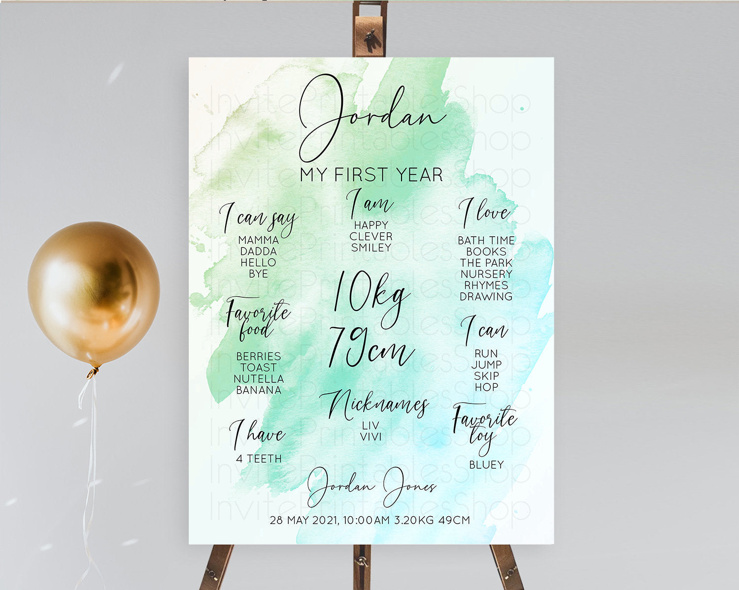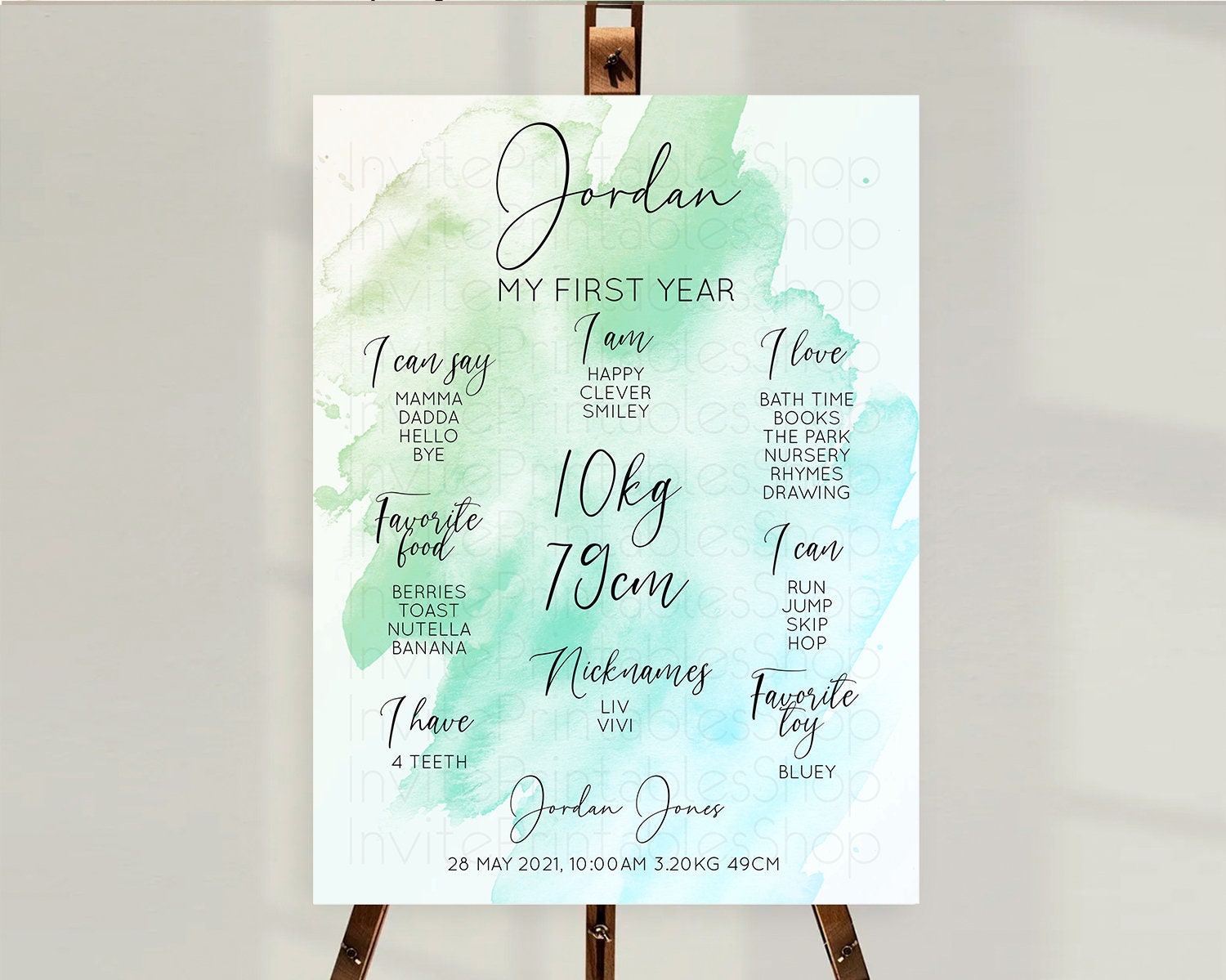 Green First Birthday Milestone Poster Green Watercolor Milestone Board Pastel Green Watercolor Splash Milestone Board 1st Birthday D10166