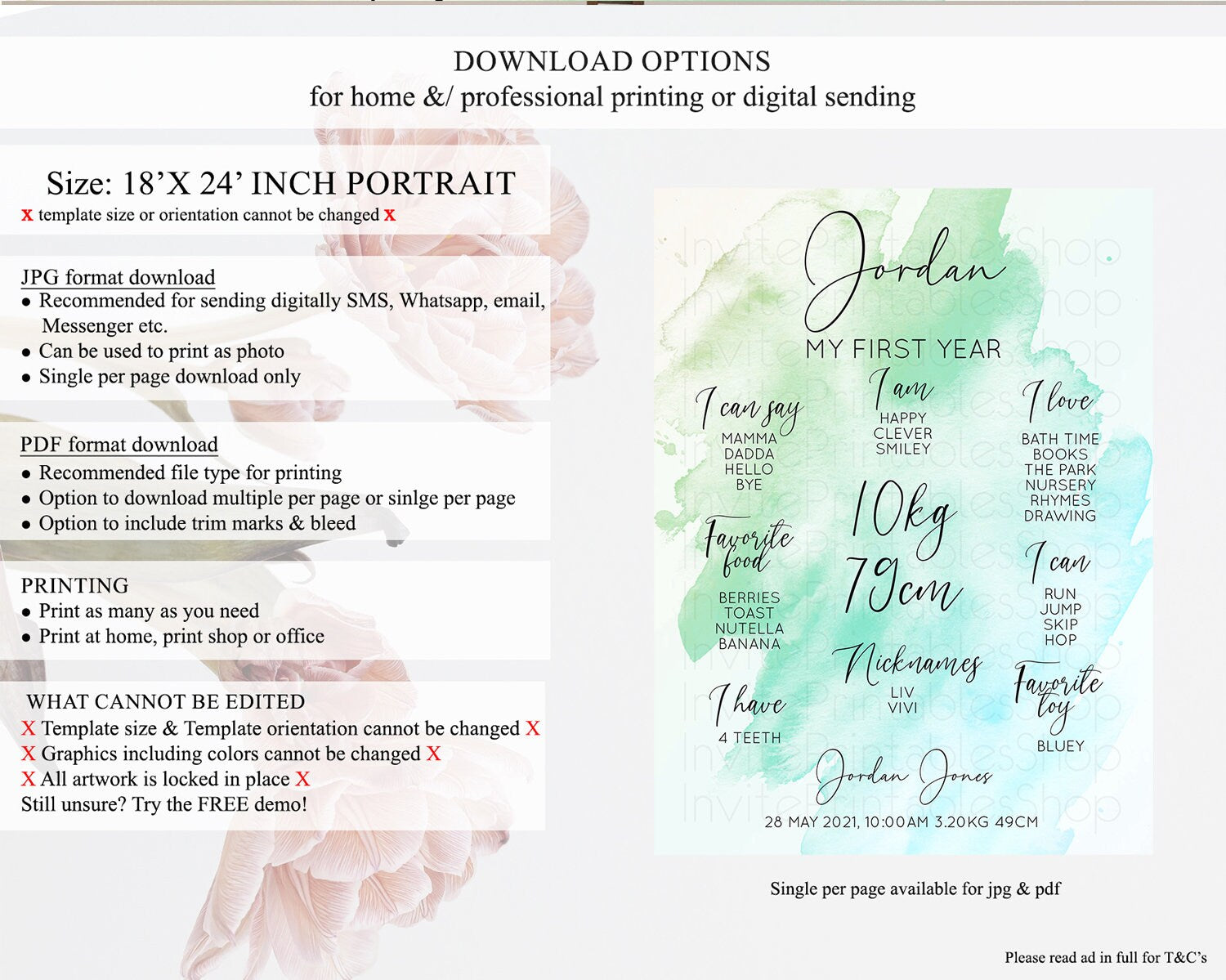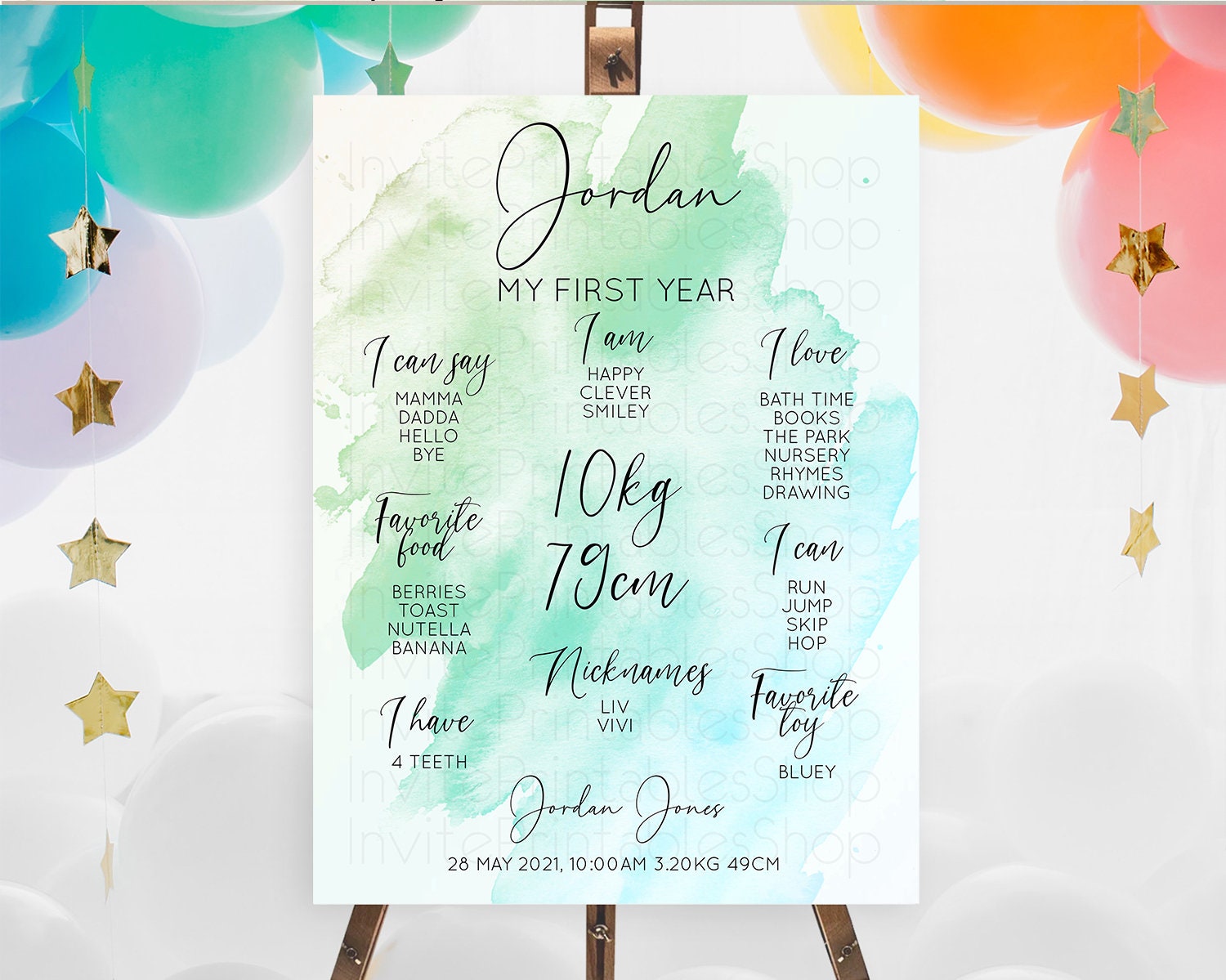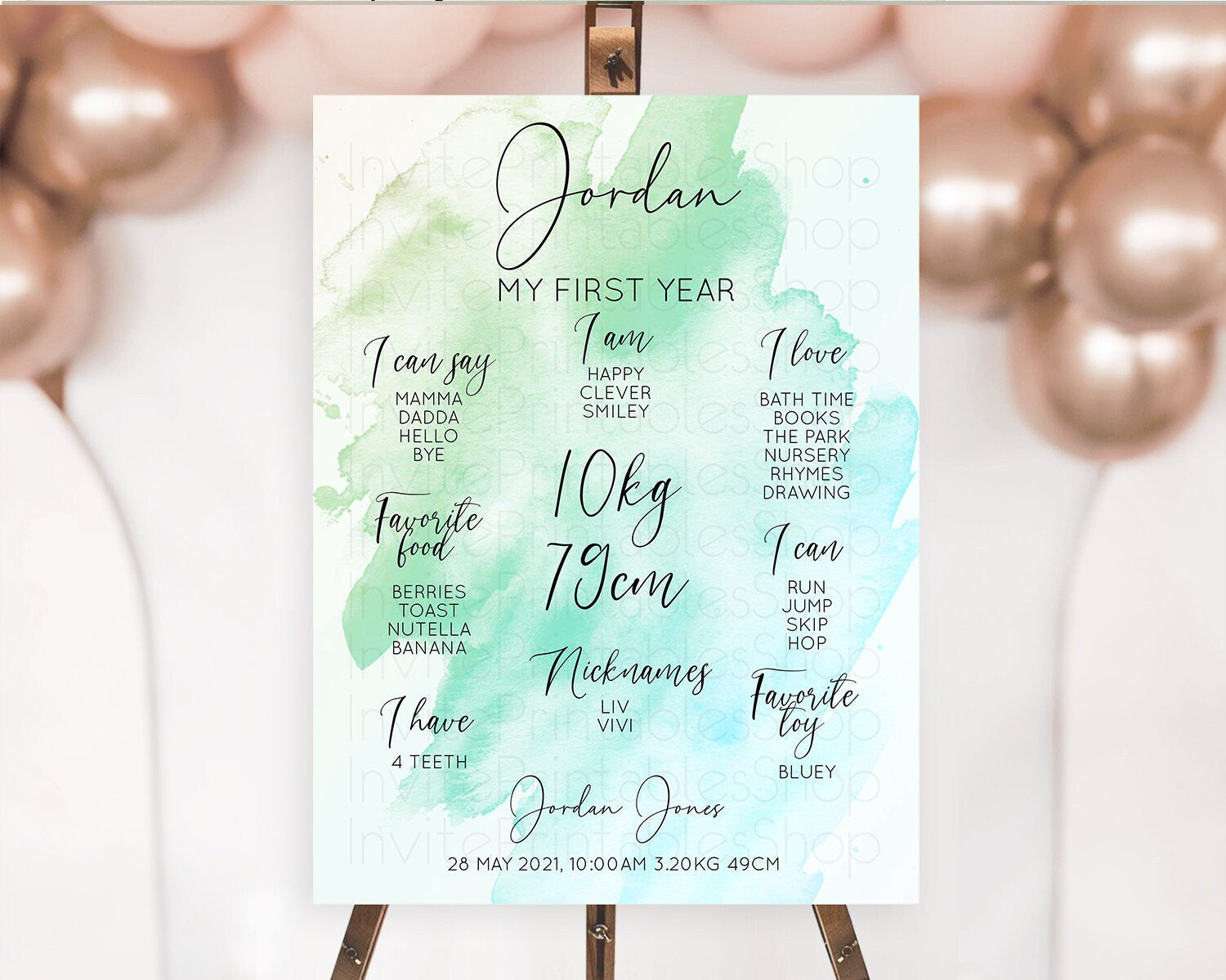 Green First Birthday Milestone Poster Green Watercolor Milestone Board Pastel Green Watercolor Splash Milestone Board 1st Birthday D10166