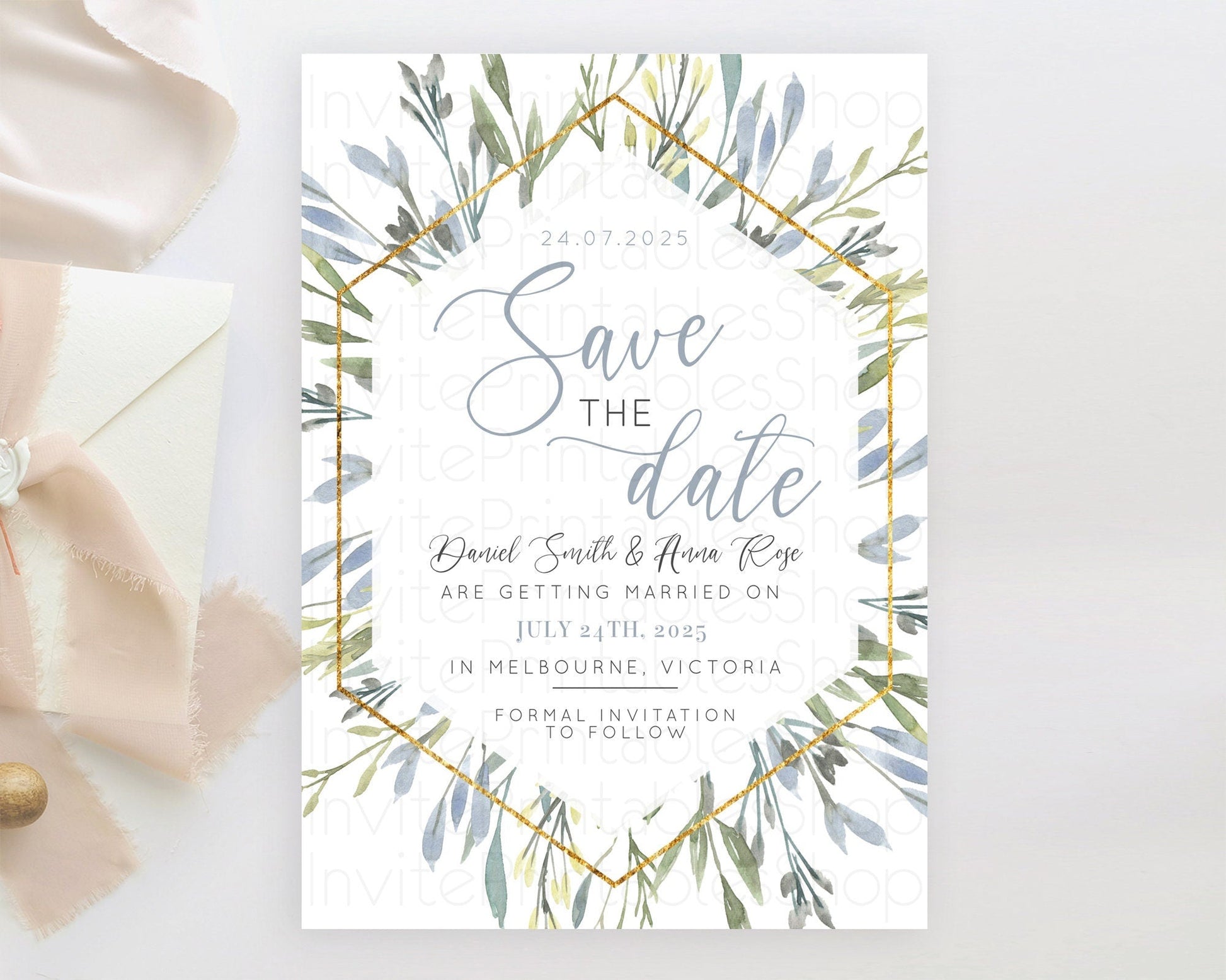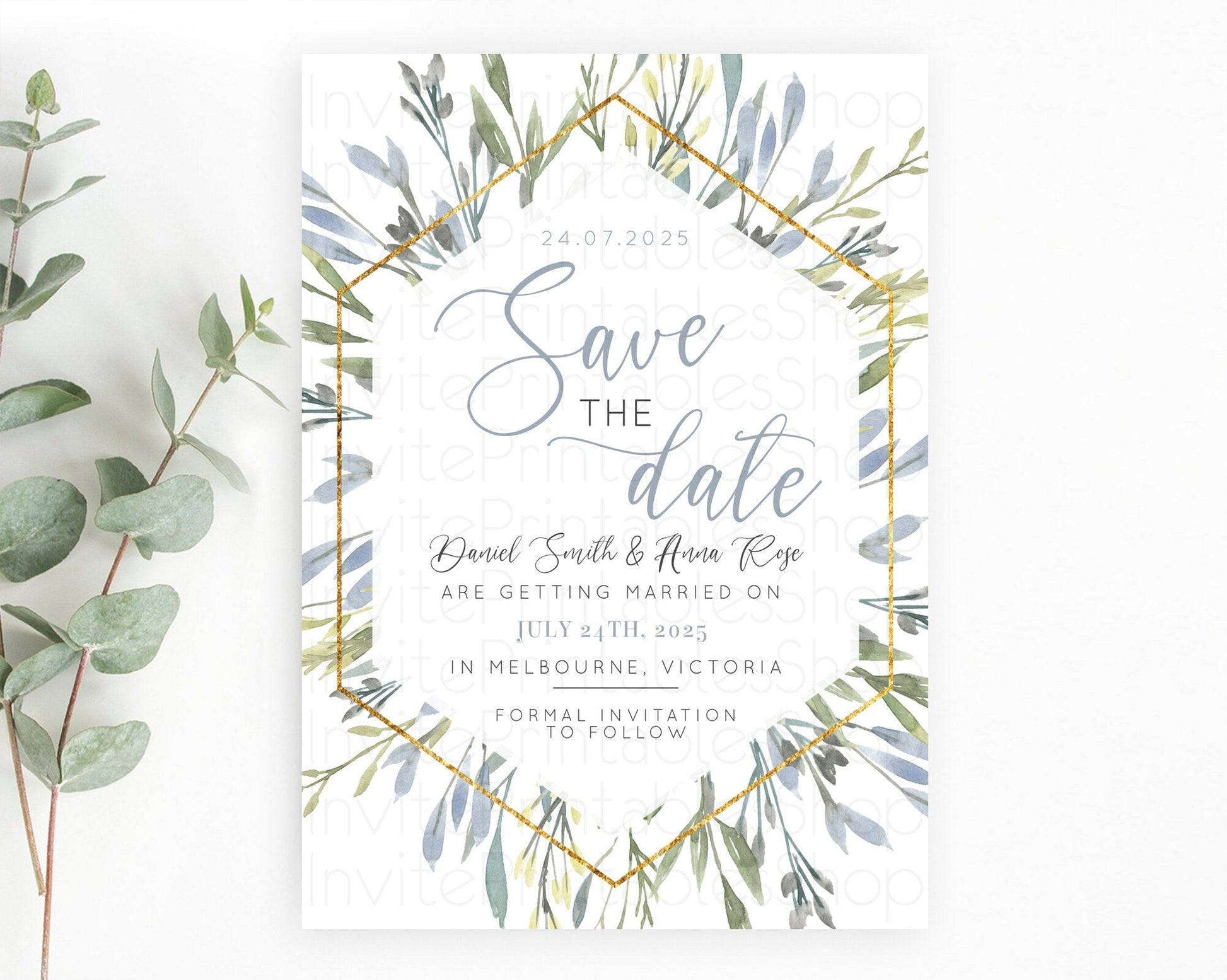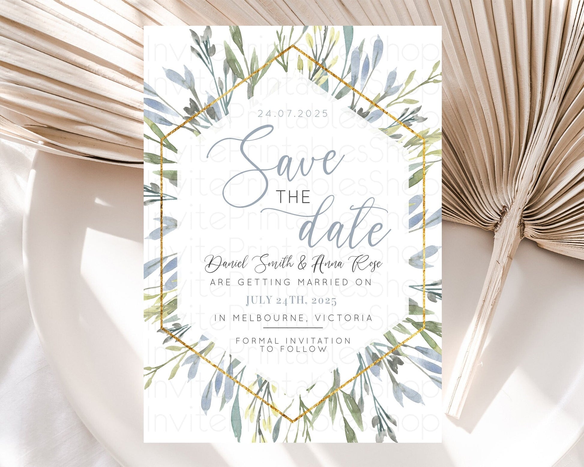 Green Leafy Save The Date Template Eucalyptus Fern Leaves Watercolor Boho Garden Leaf Branch Party 1st Birthday Baptism Baby Shower D10532