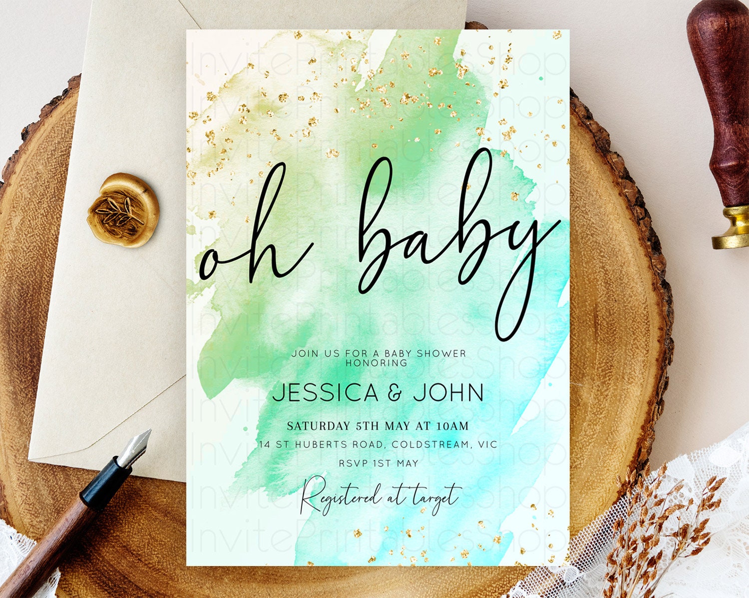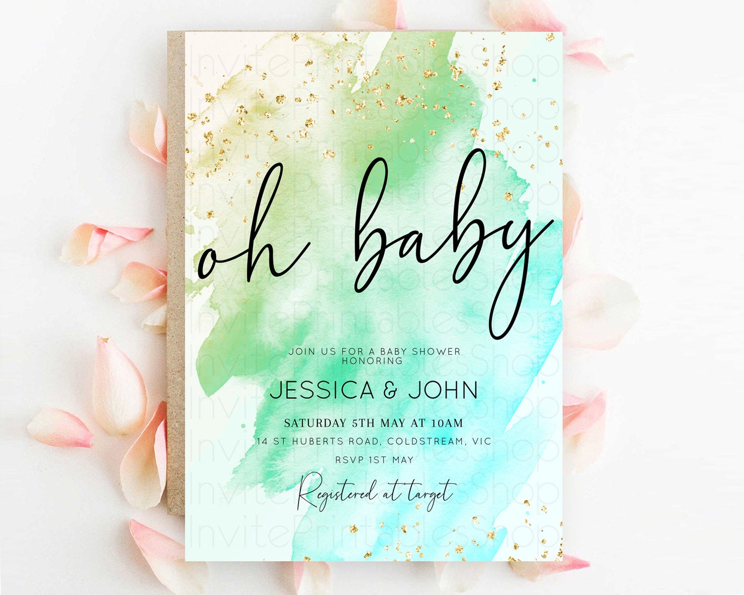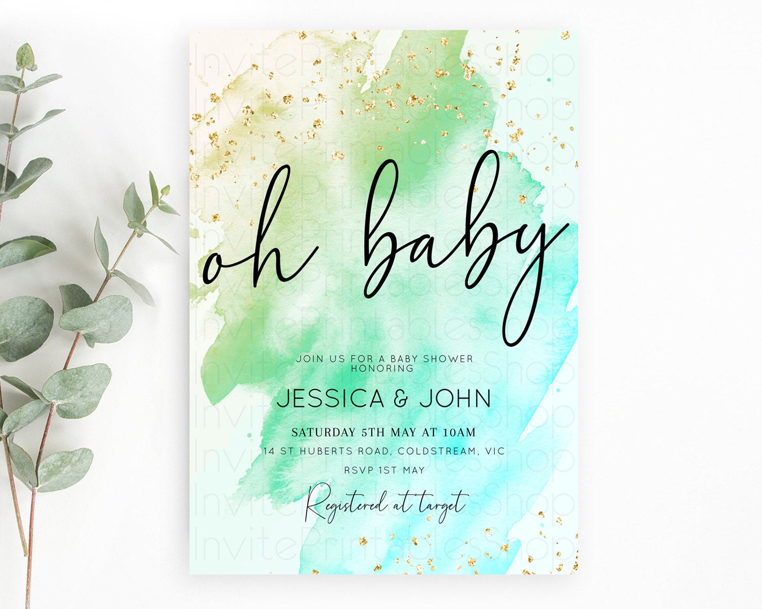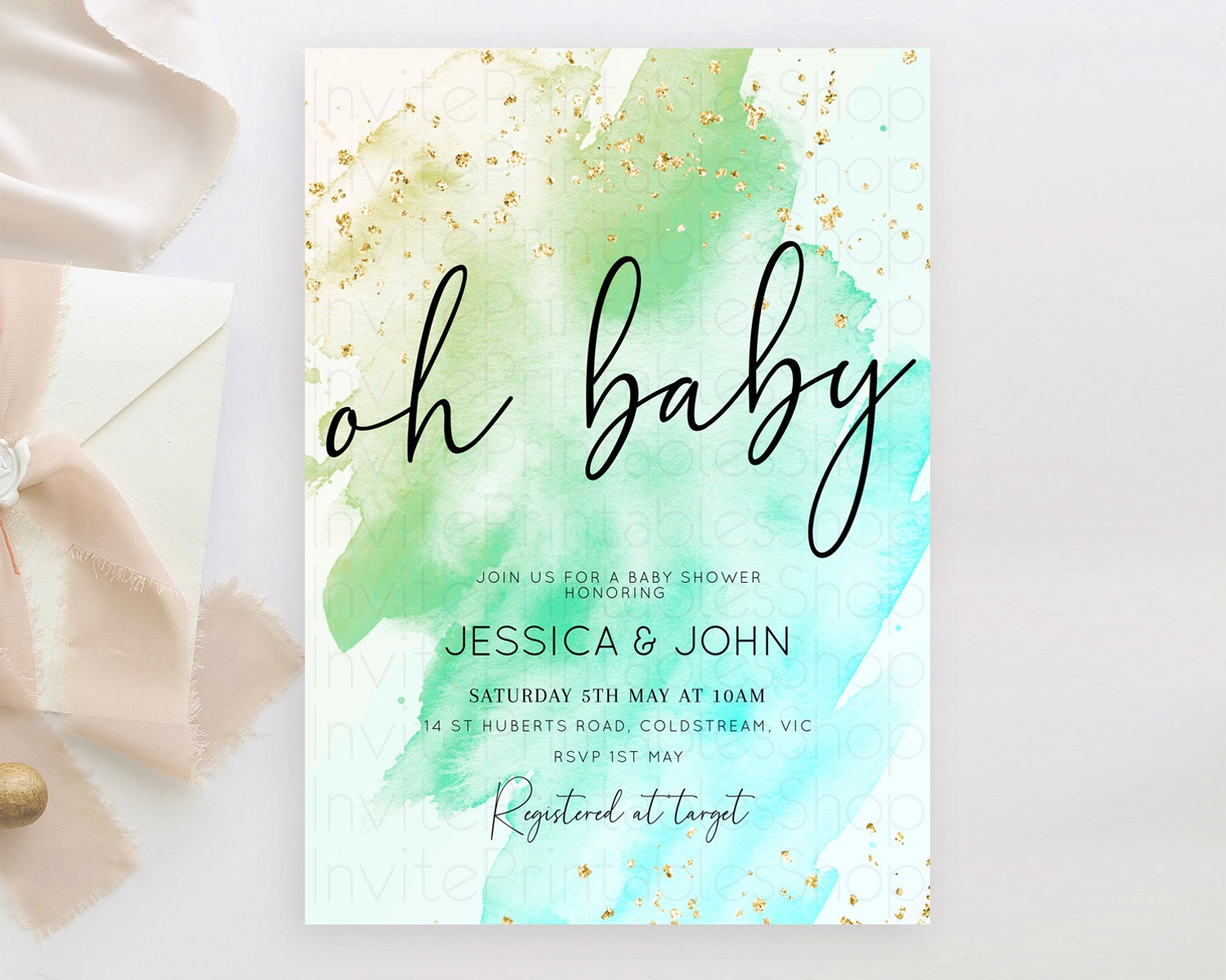 Green Watercolor Baby Shower Invitation: Pastel Green Ombre with Gold Sprinkle Accents, Watercolor Splash - 'Oh Baby' Theme D10170