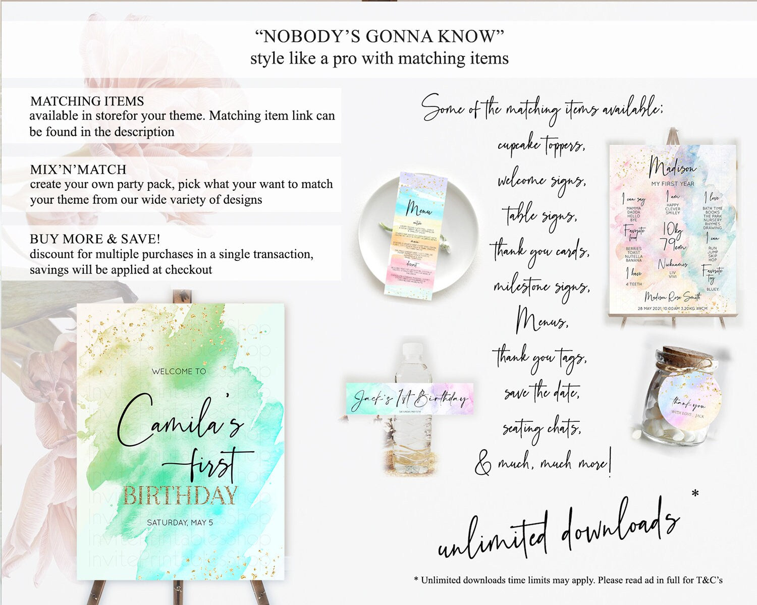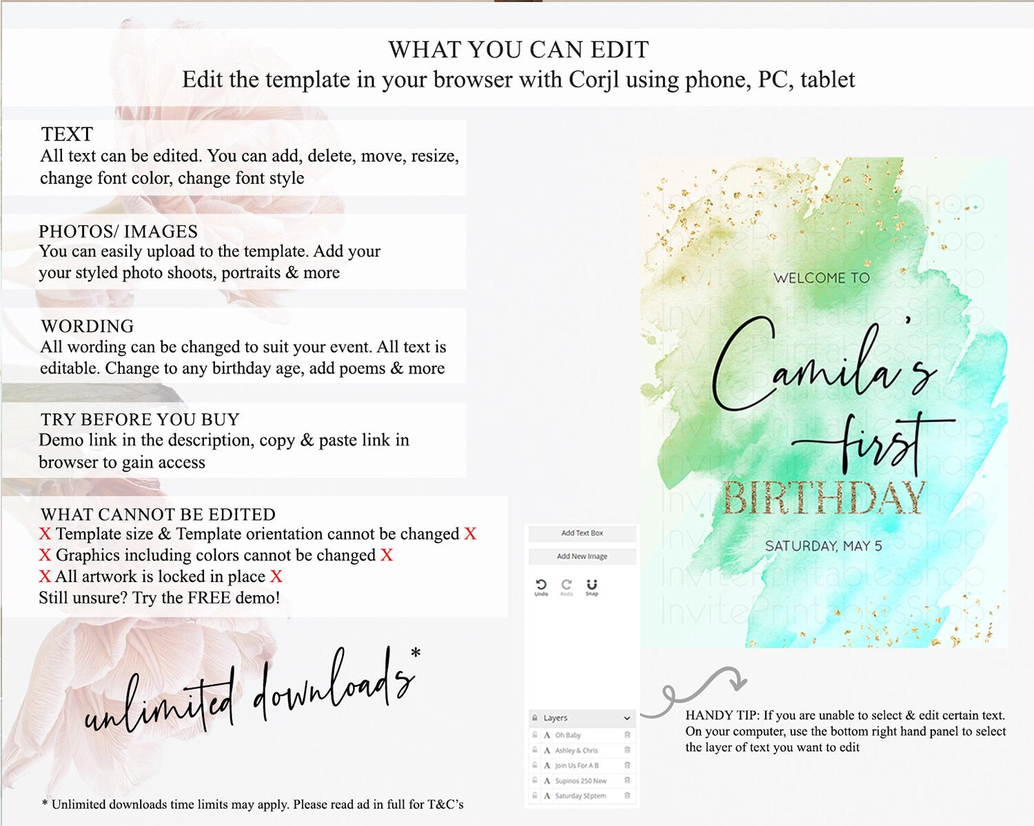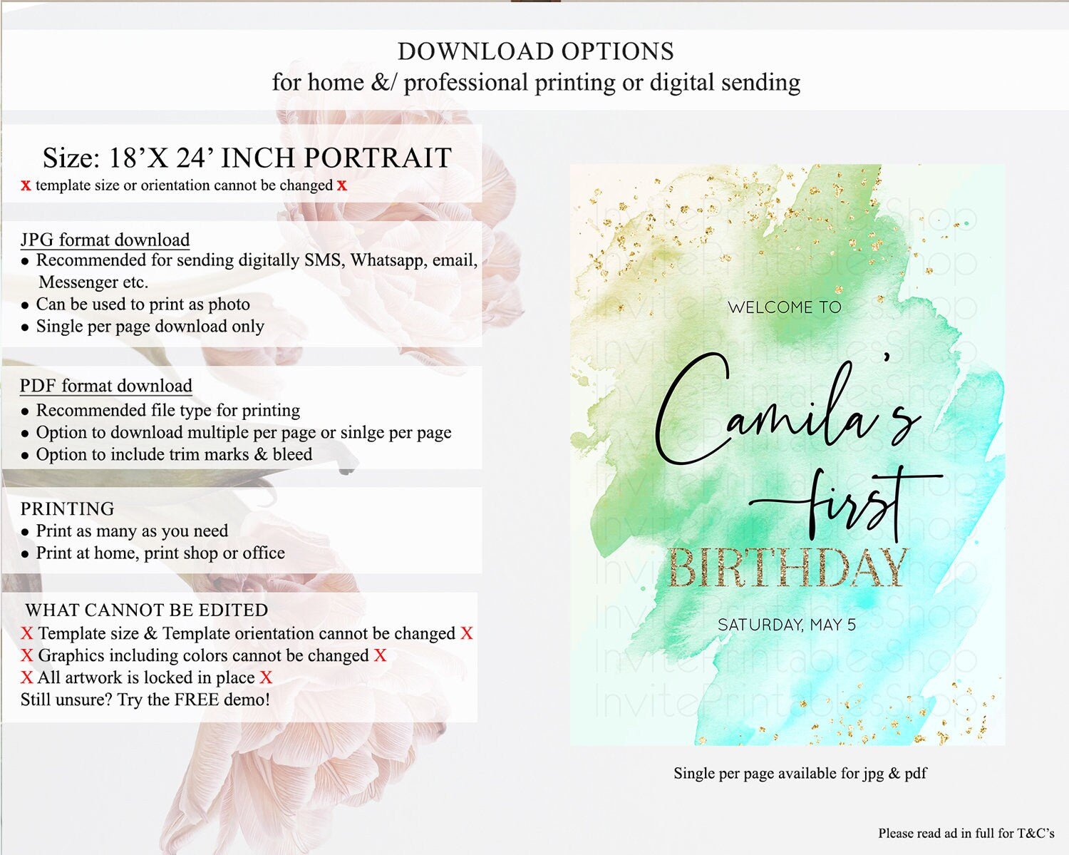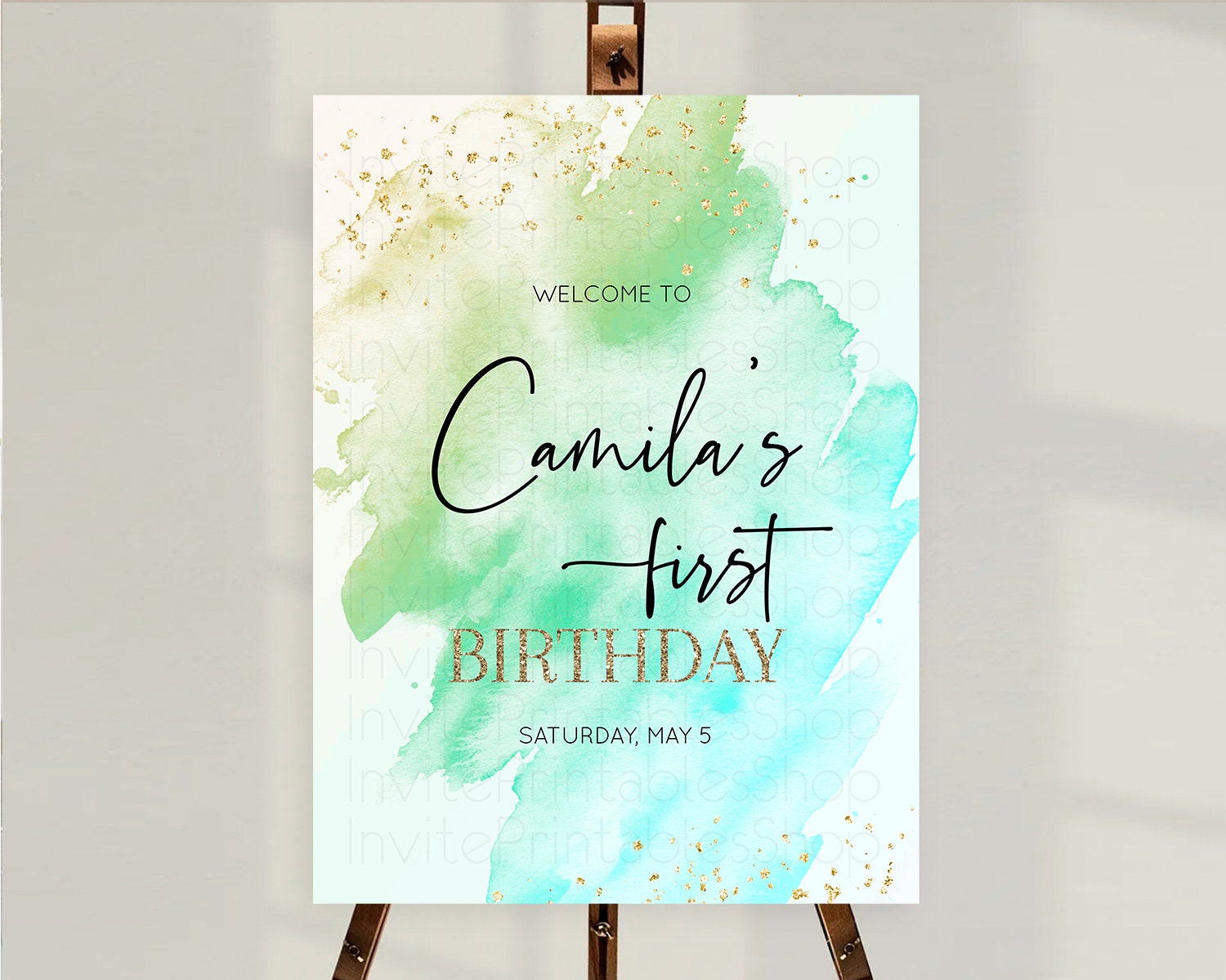 Green Welcome Sign Green Watercolor Welcome Board Pastel Green Party Decor Splash Welcome Poster First Birthday Welcome Sign D10170
