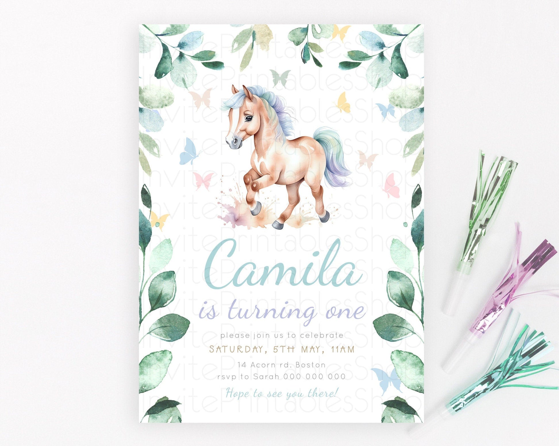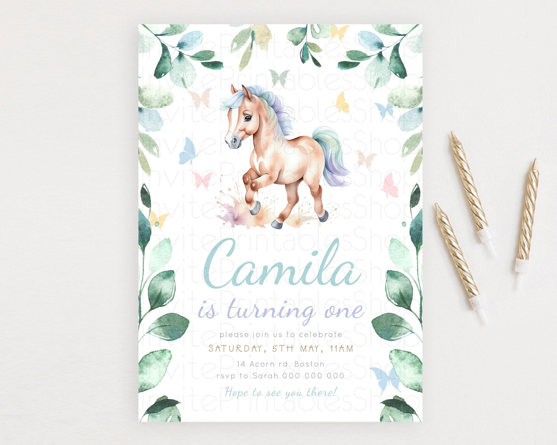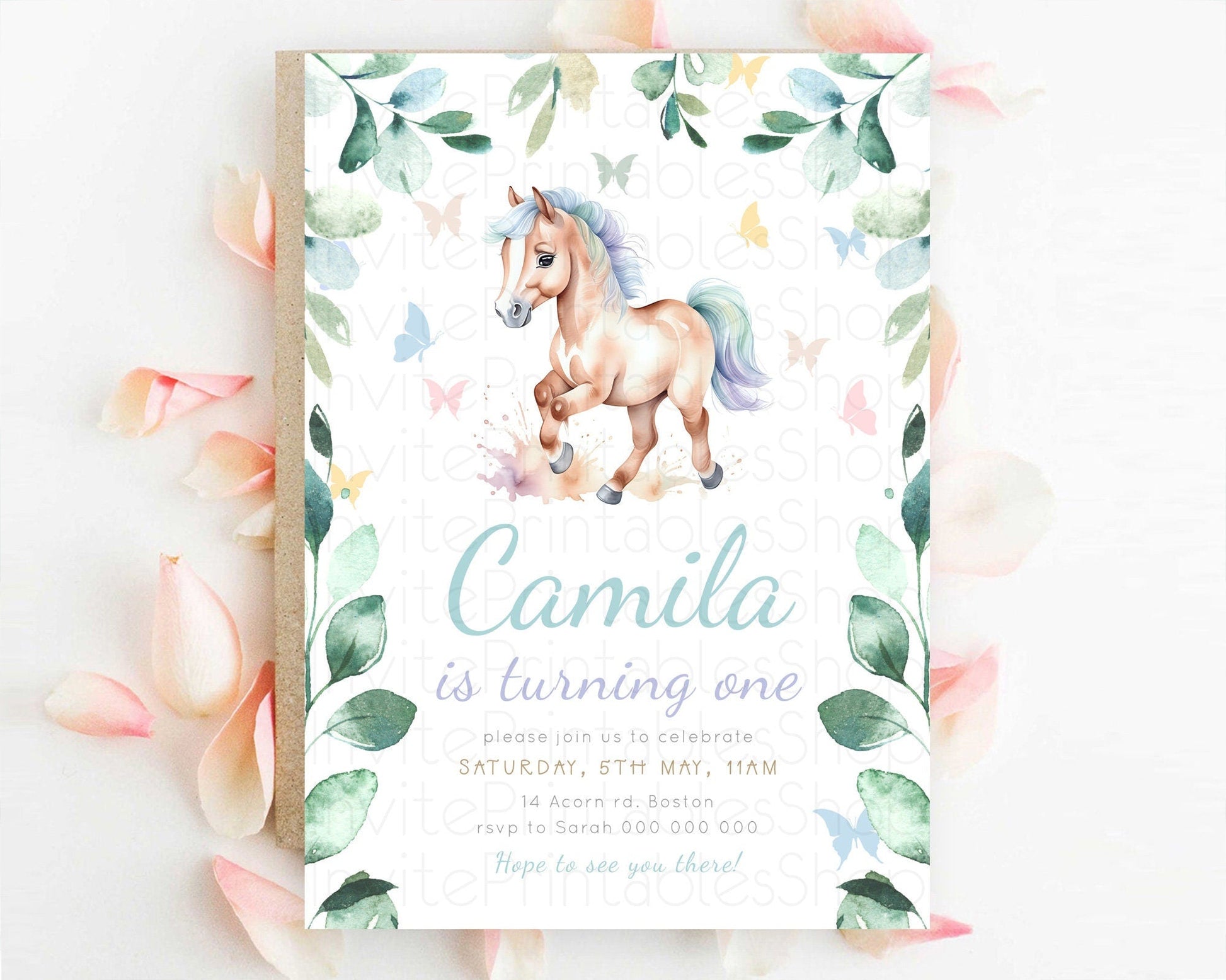 Horse Birthday Invitation, Galloping Wildflower Fields, Pastel Flowers, Butterflies, Flowers Accents for Equestrian & Cowgirls d23388