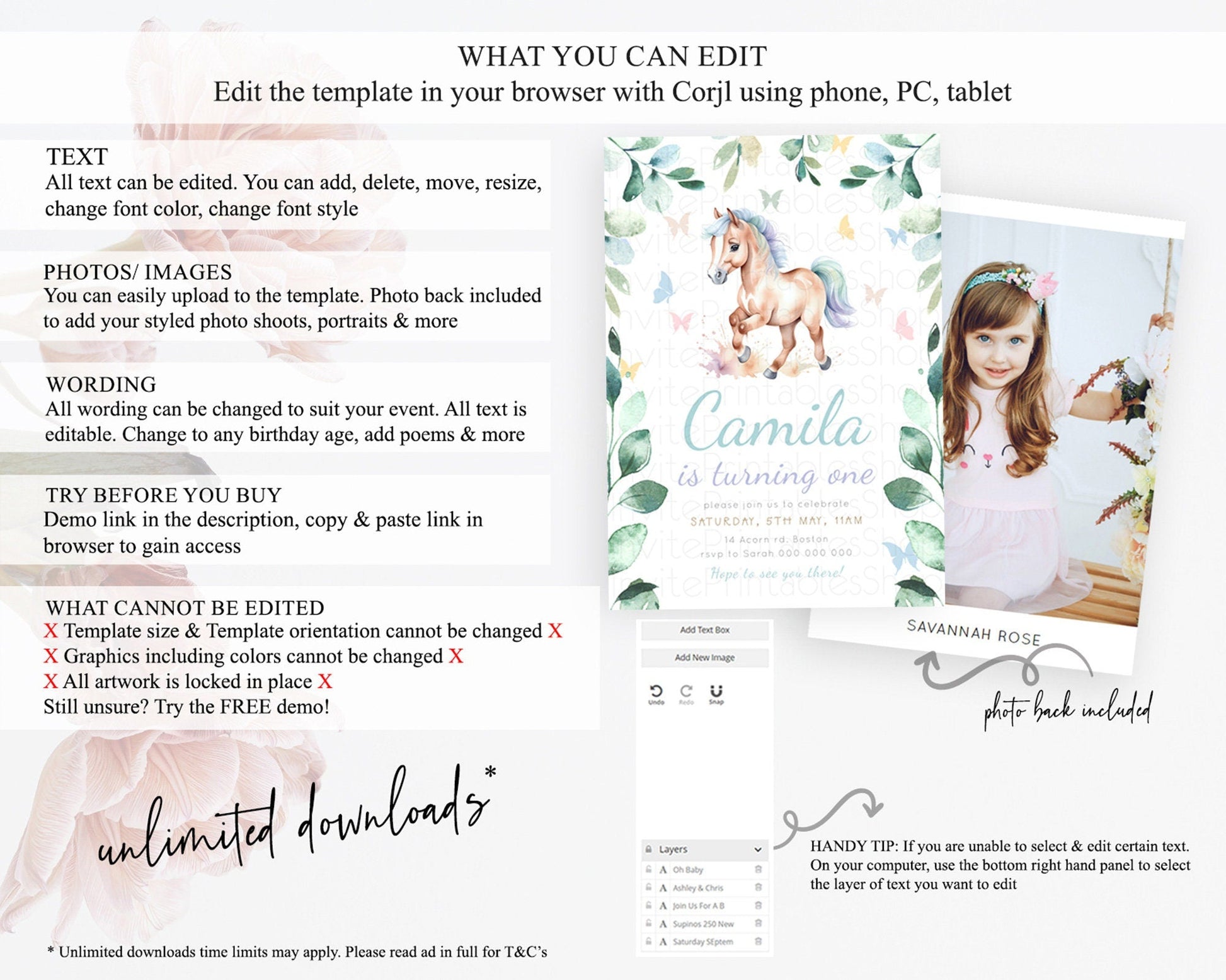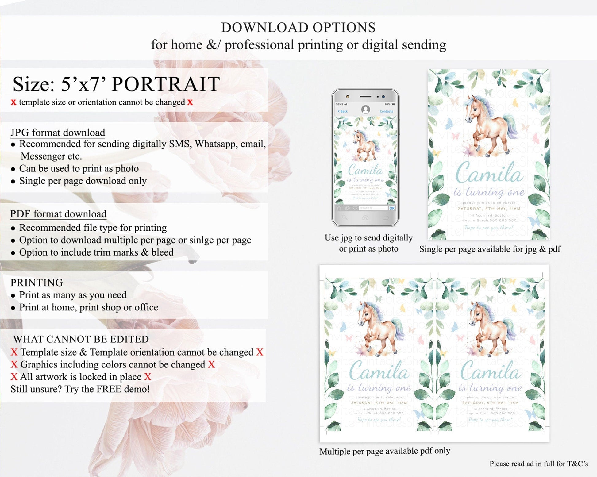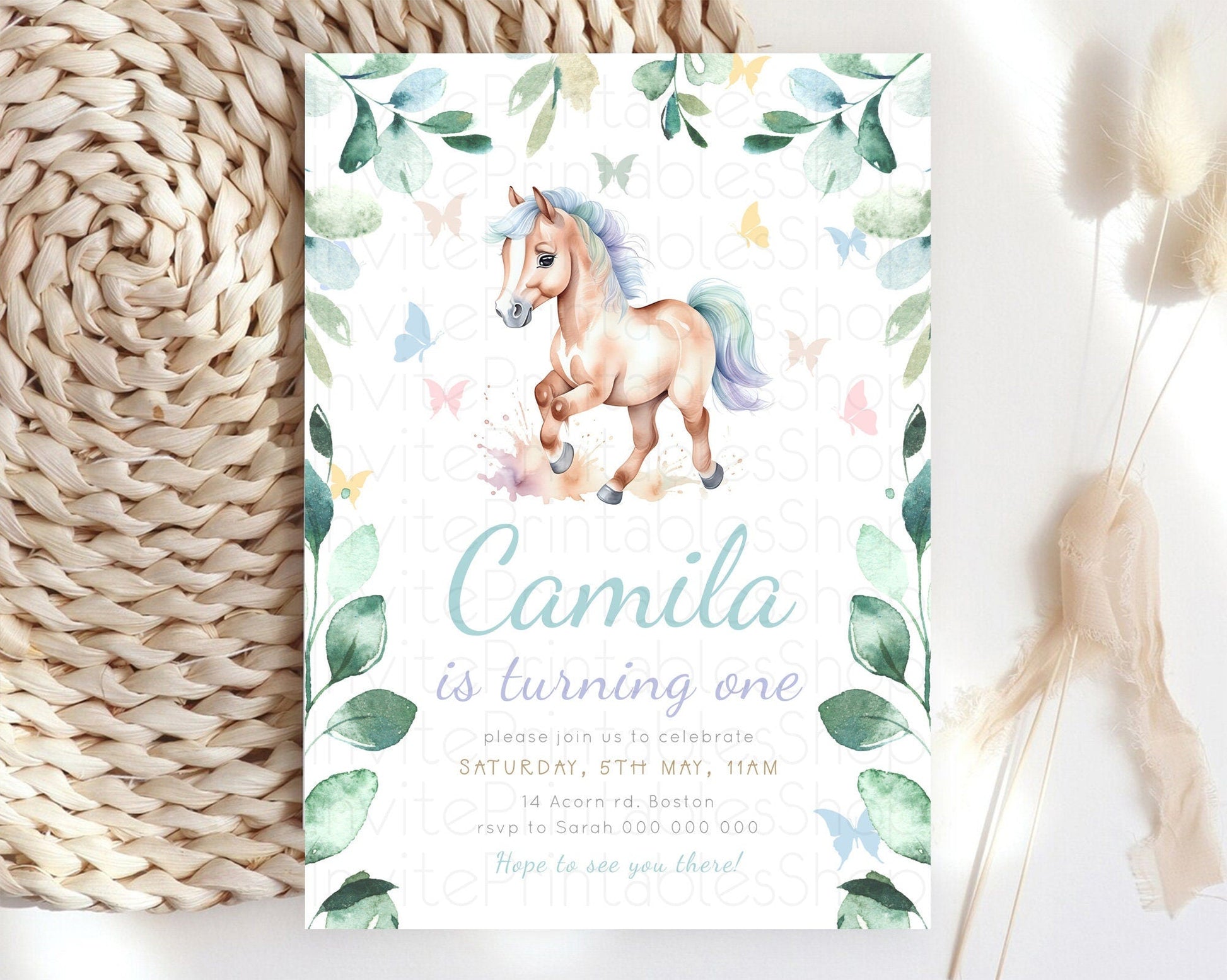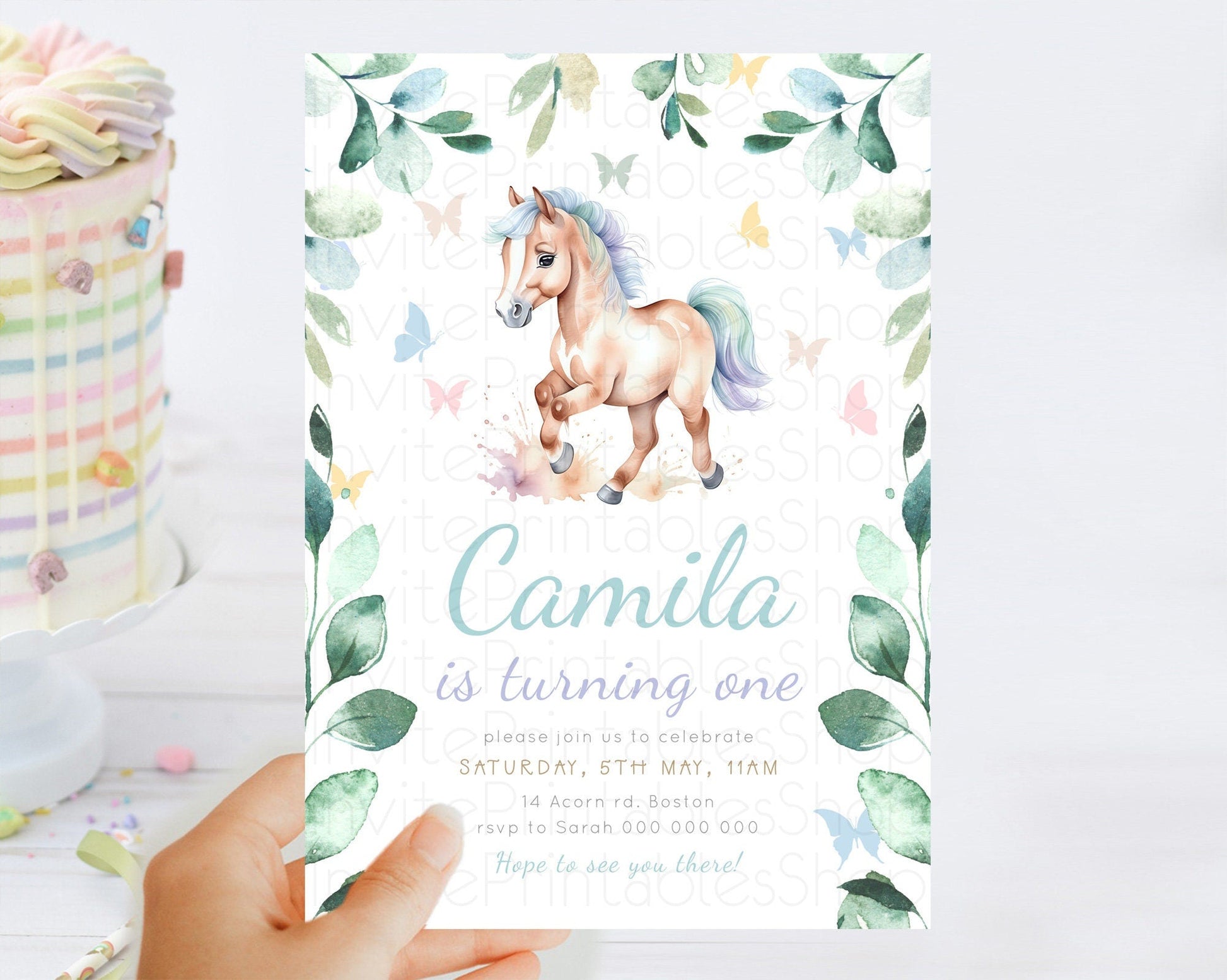 Horse Birthday Invitation, Galloping Wildflower Fields, Pastel Flowers, Butterflies, Flowers Accents for Equestrian & Cowgirls d23388