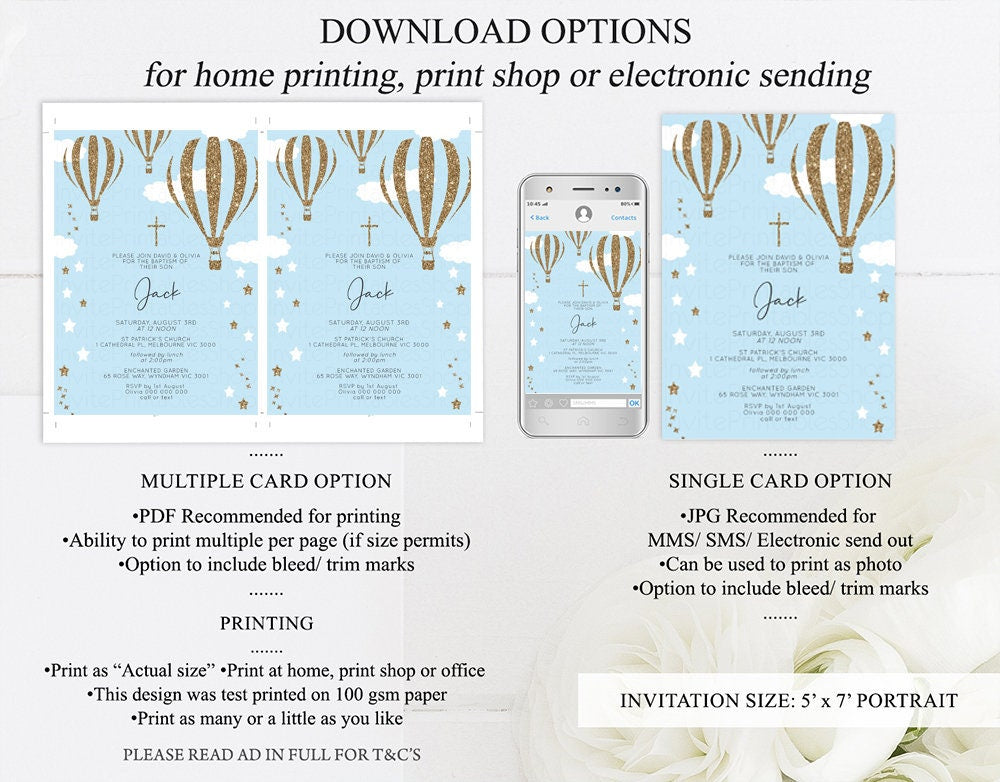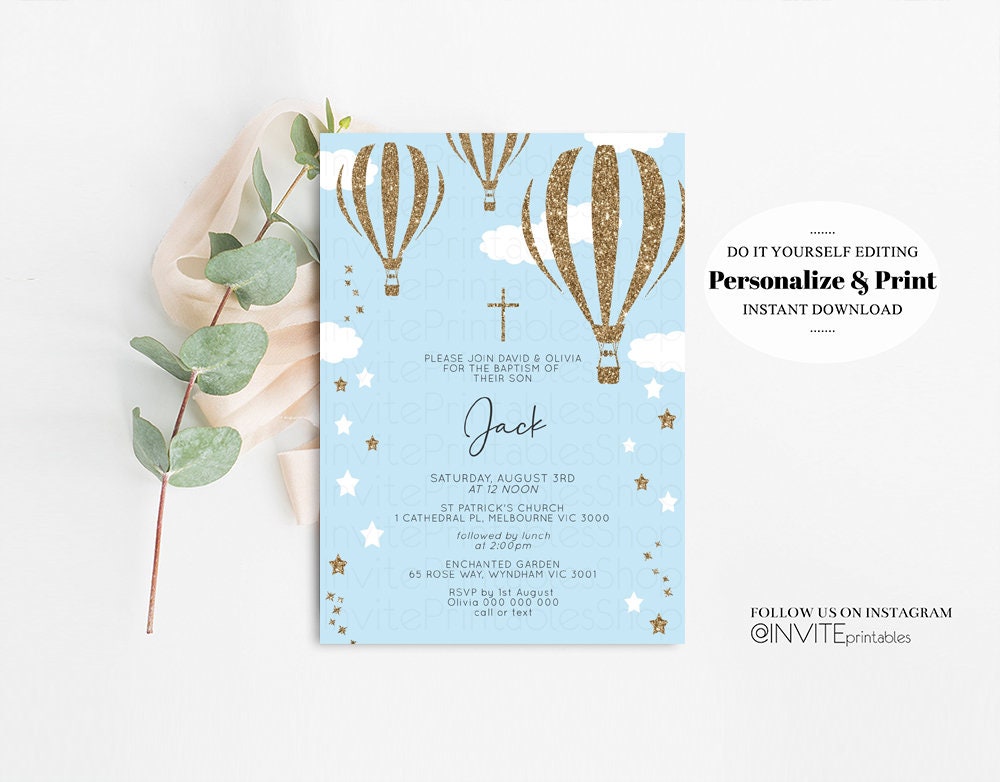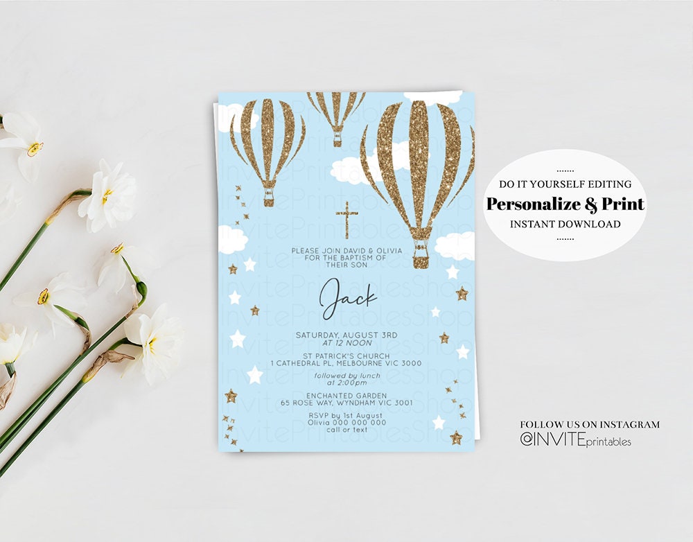 Hot Air Balloon Baptism Christening Invitation Confetti Sprinkle Magical Stars Sky Clouds Orthodox Silver Cross Blue Hotair Balloon