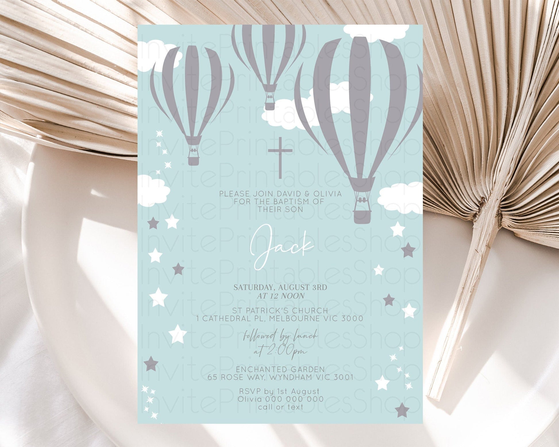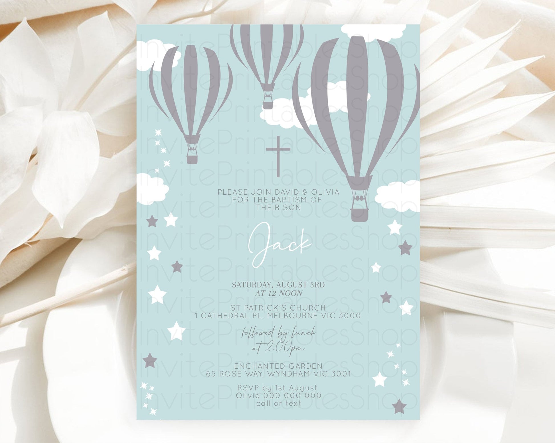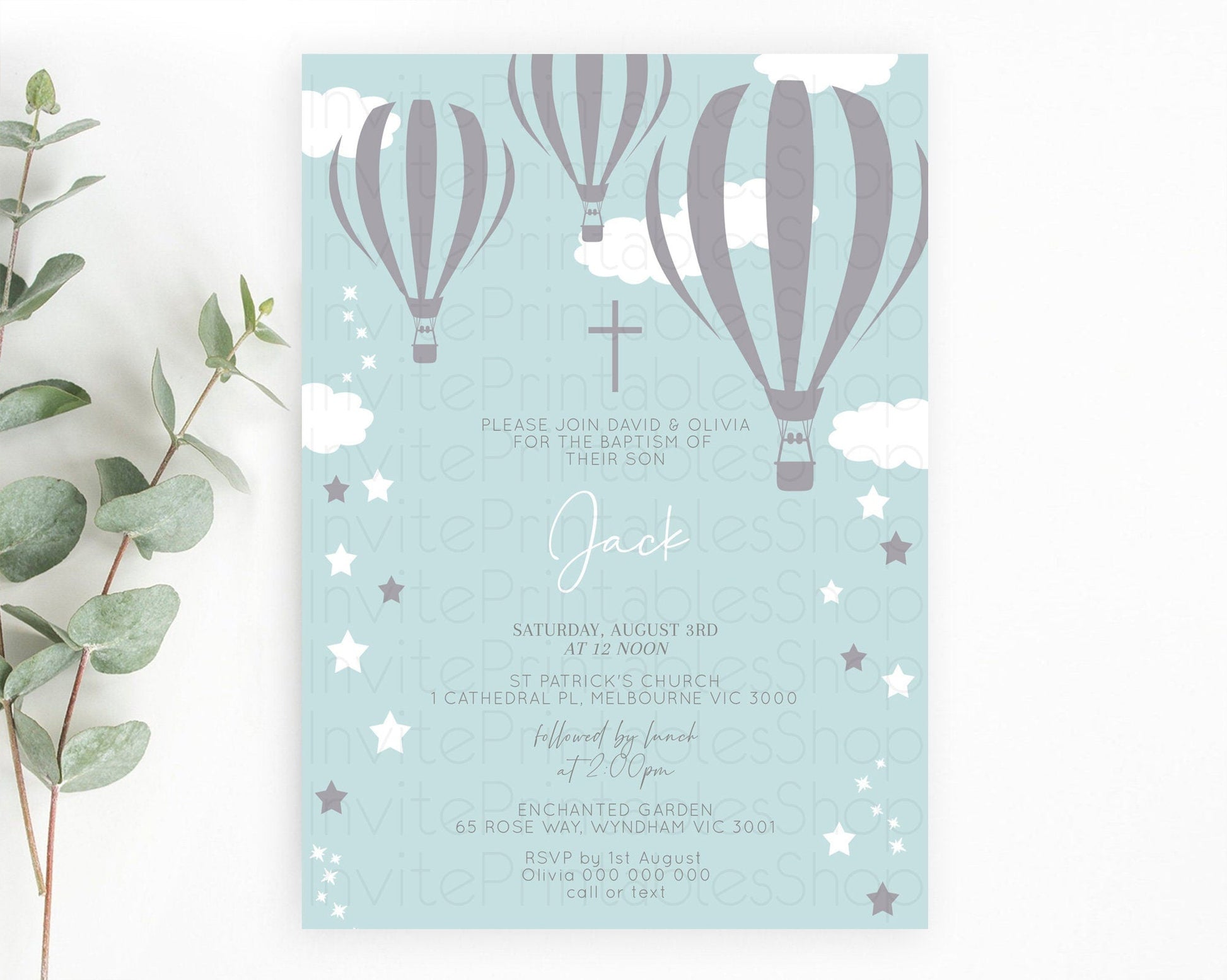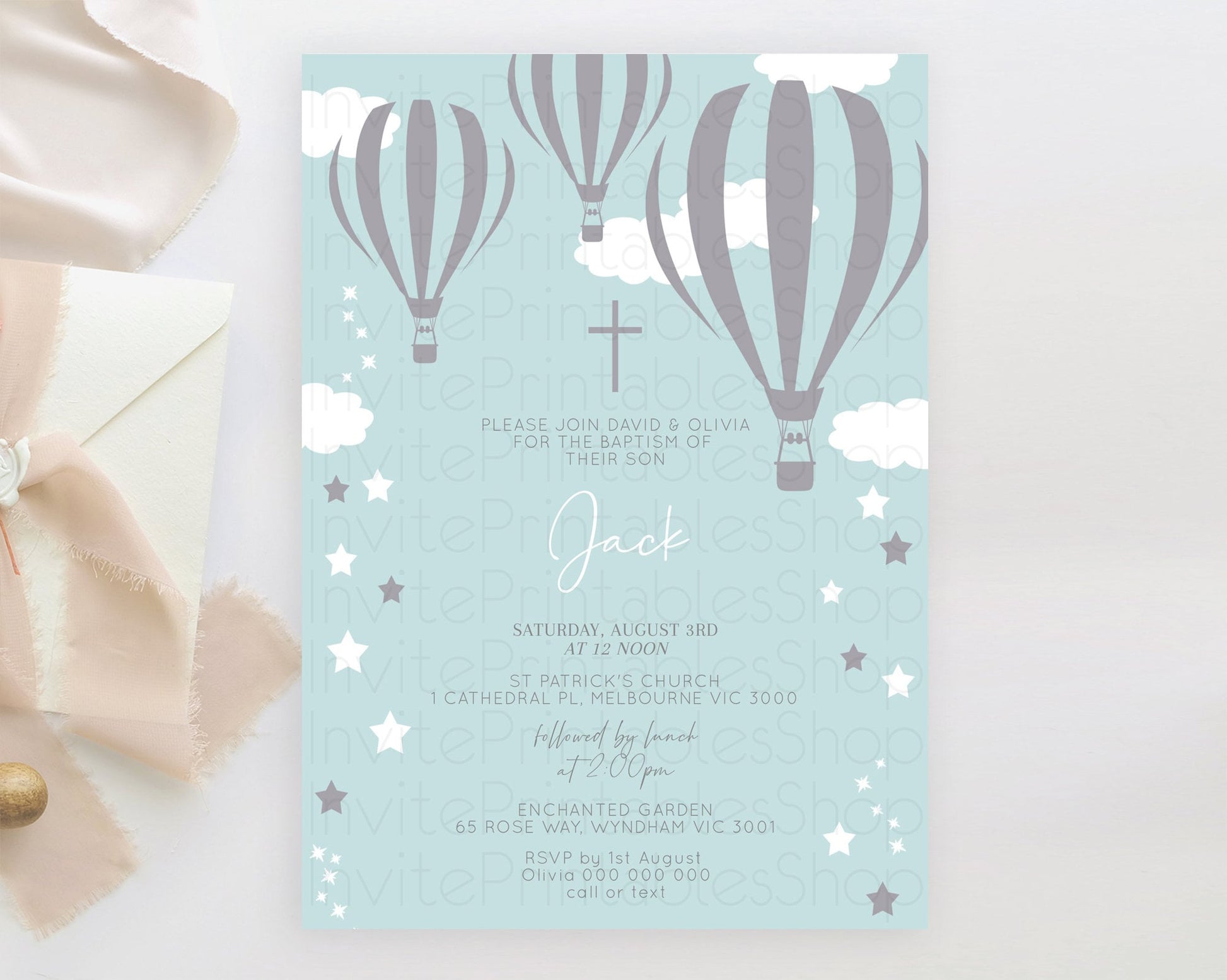 Hot Air Balloon Baptism Invitation Hot Air Balloon Baptism Birthday Invitation Adventure Awaits Up Up Away Glitter Blue Watercolor D10324