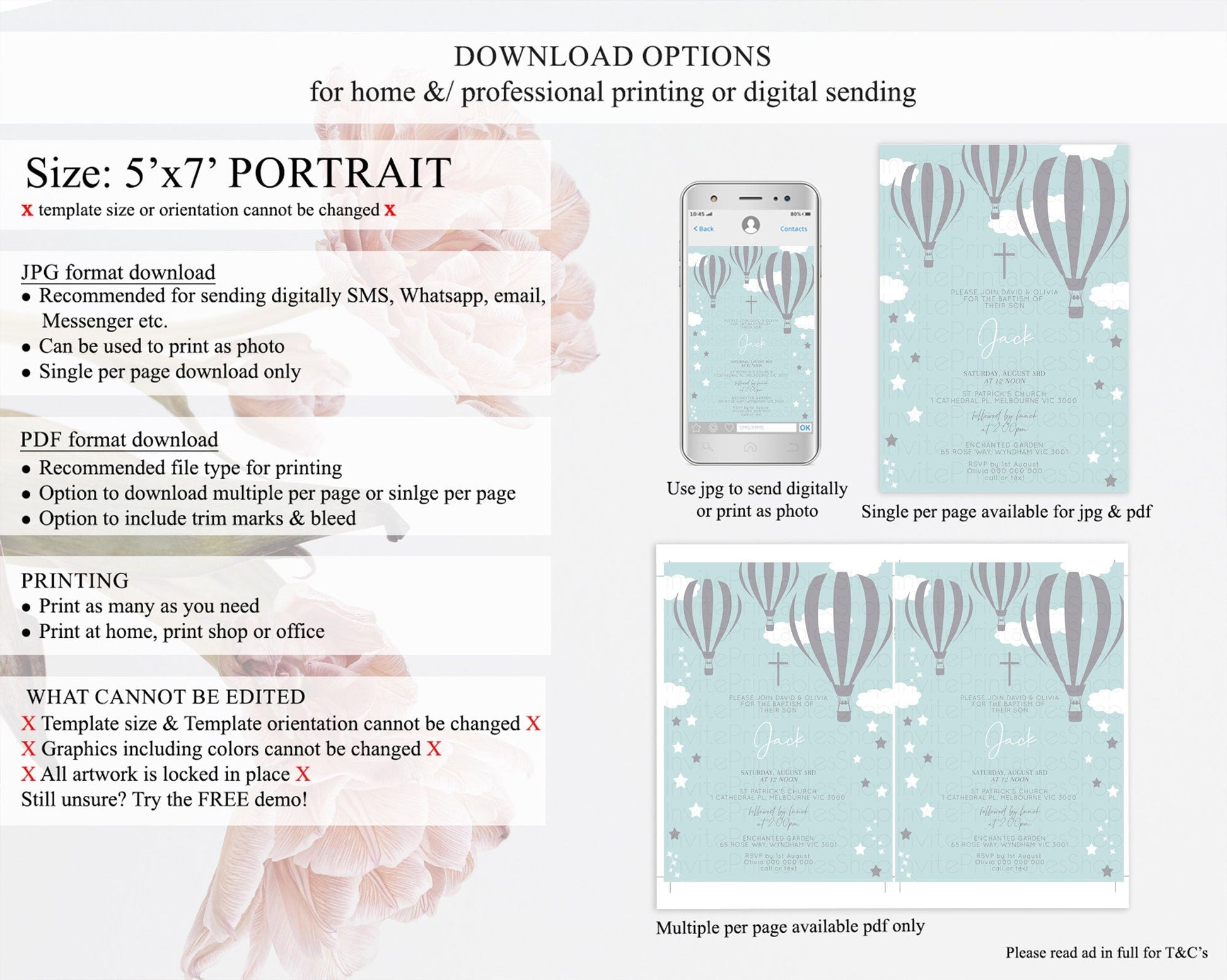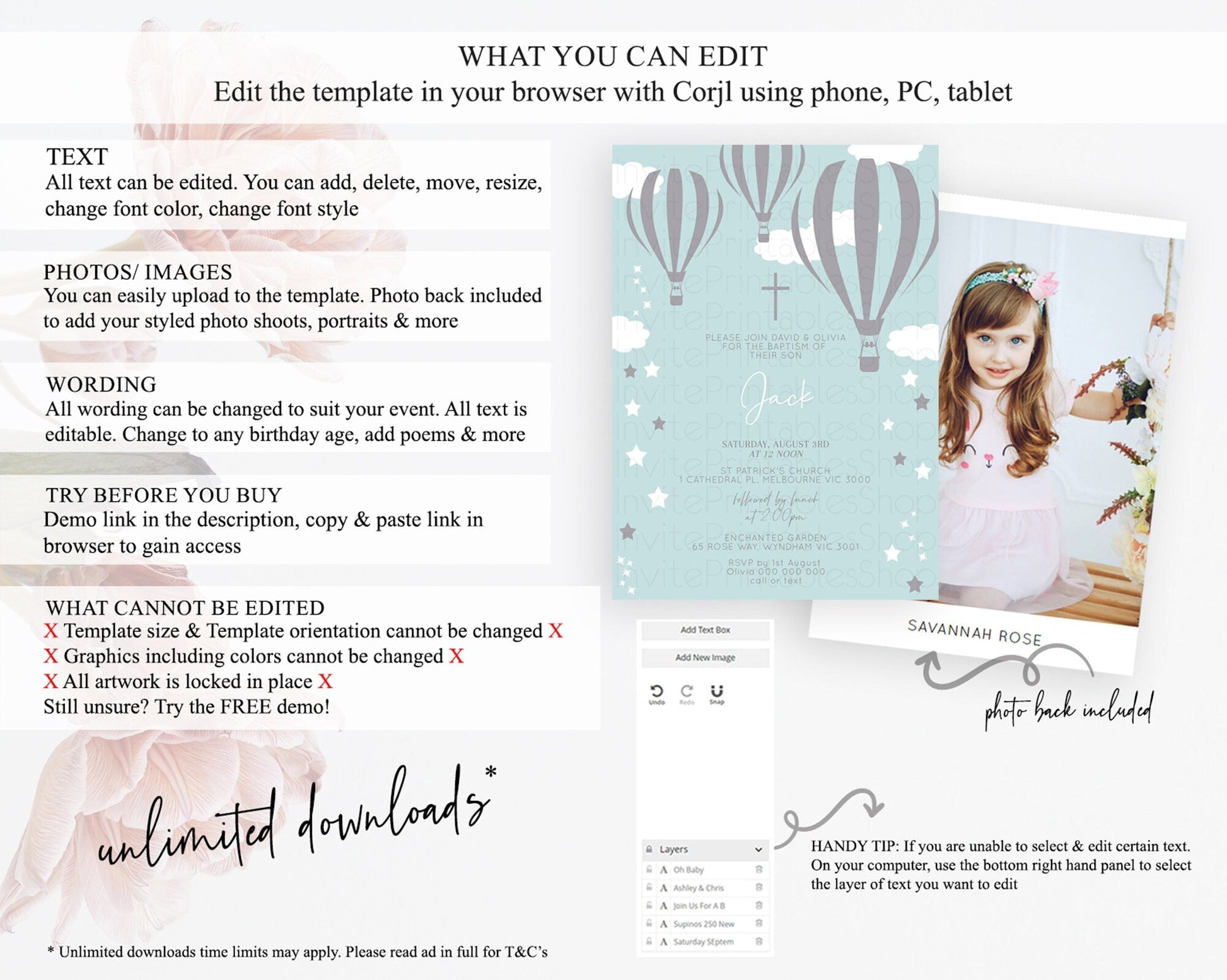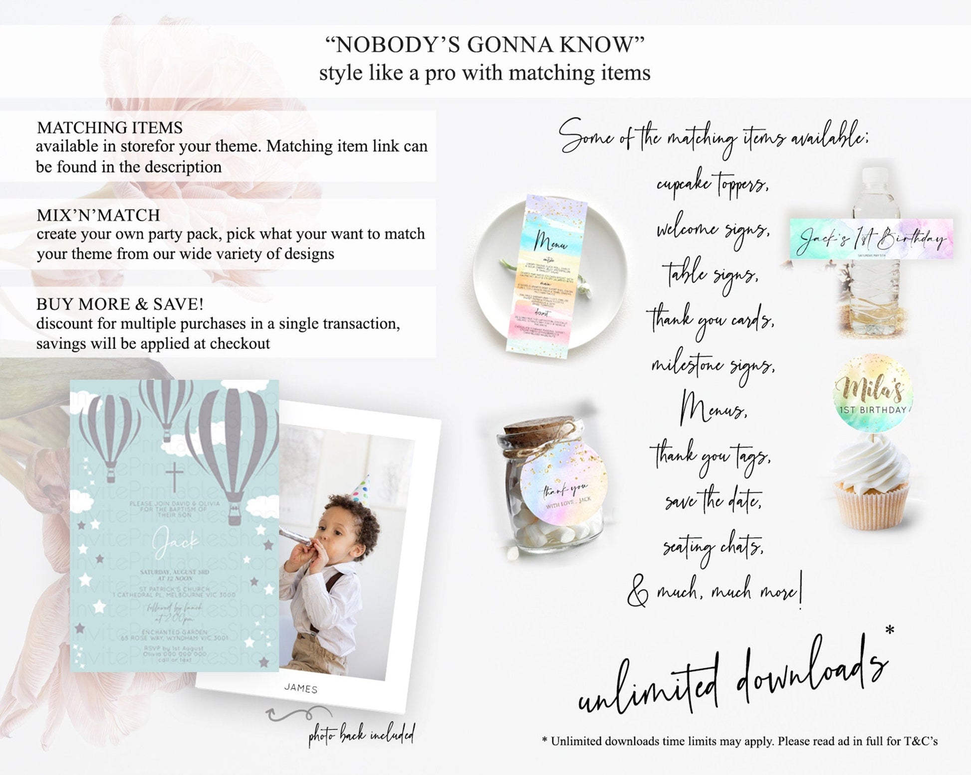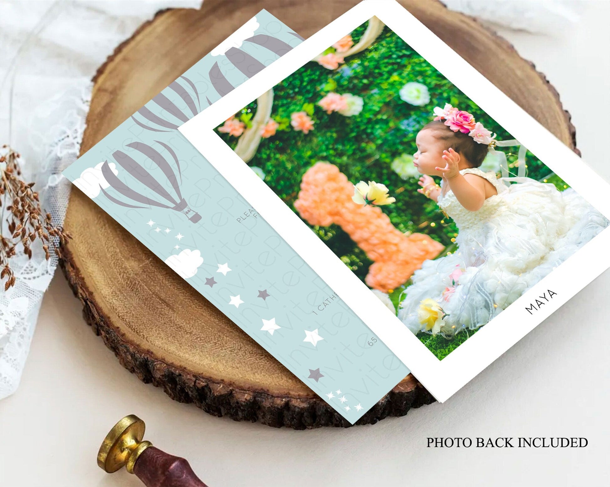 Hot Air Balloon Baptism Invitation Hot Air Balloon Baptism Birthday Invitation Adventure Awaits Up Up Away Glitter Blue Watercolor D10324