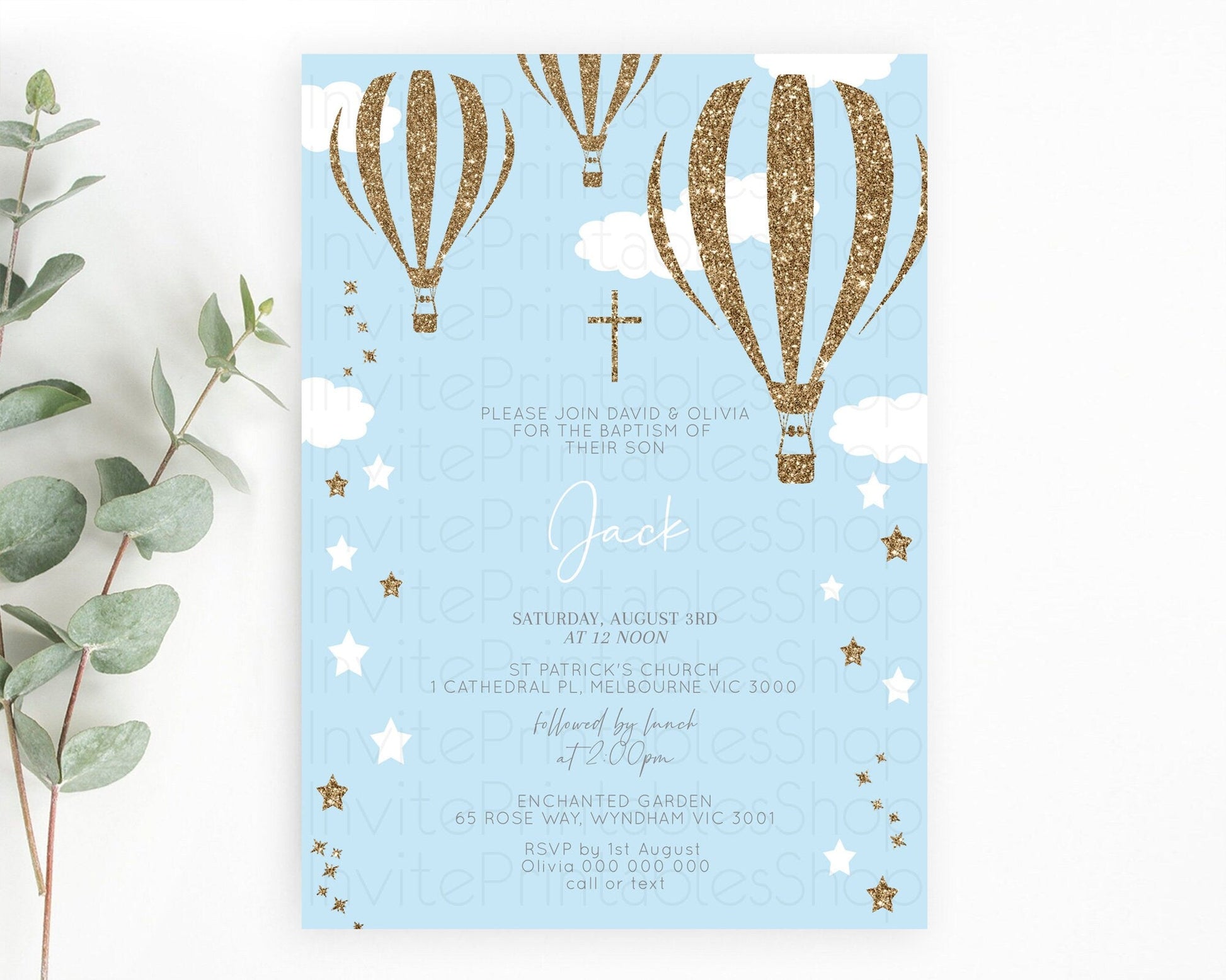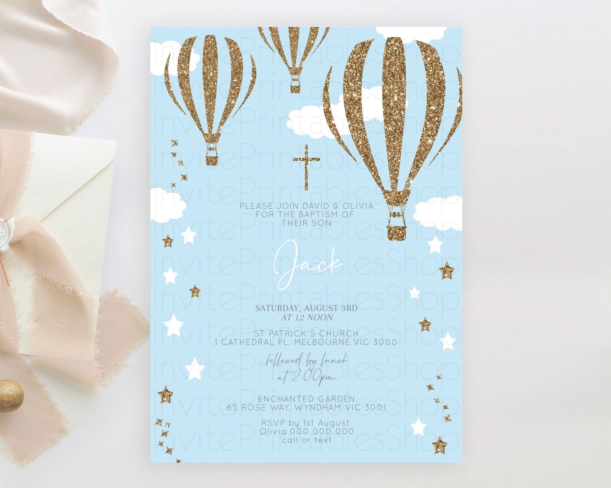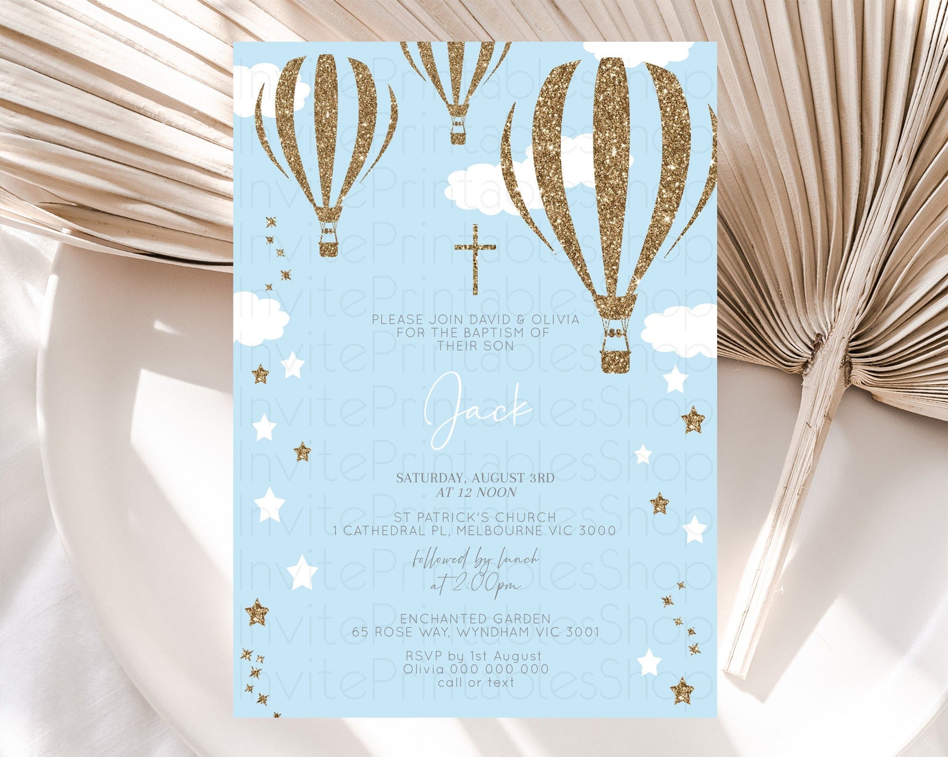 Hot Air Balloon Baptism Invitation Hot Air Balloon Baptism Birthday Invitation Adventure Awaits Up Up Away Glitter Blue Watercolor D10332
