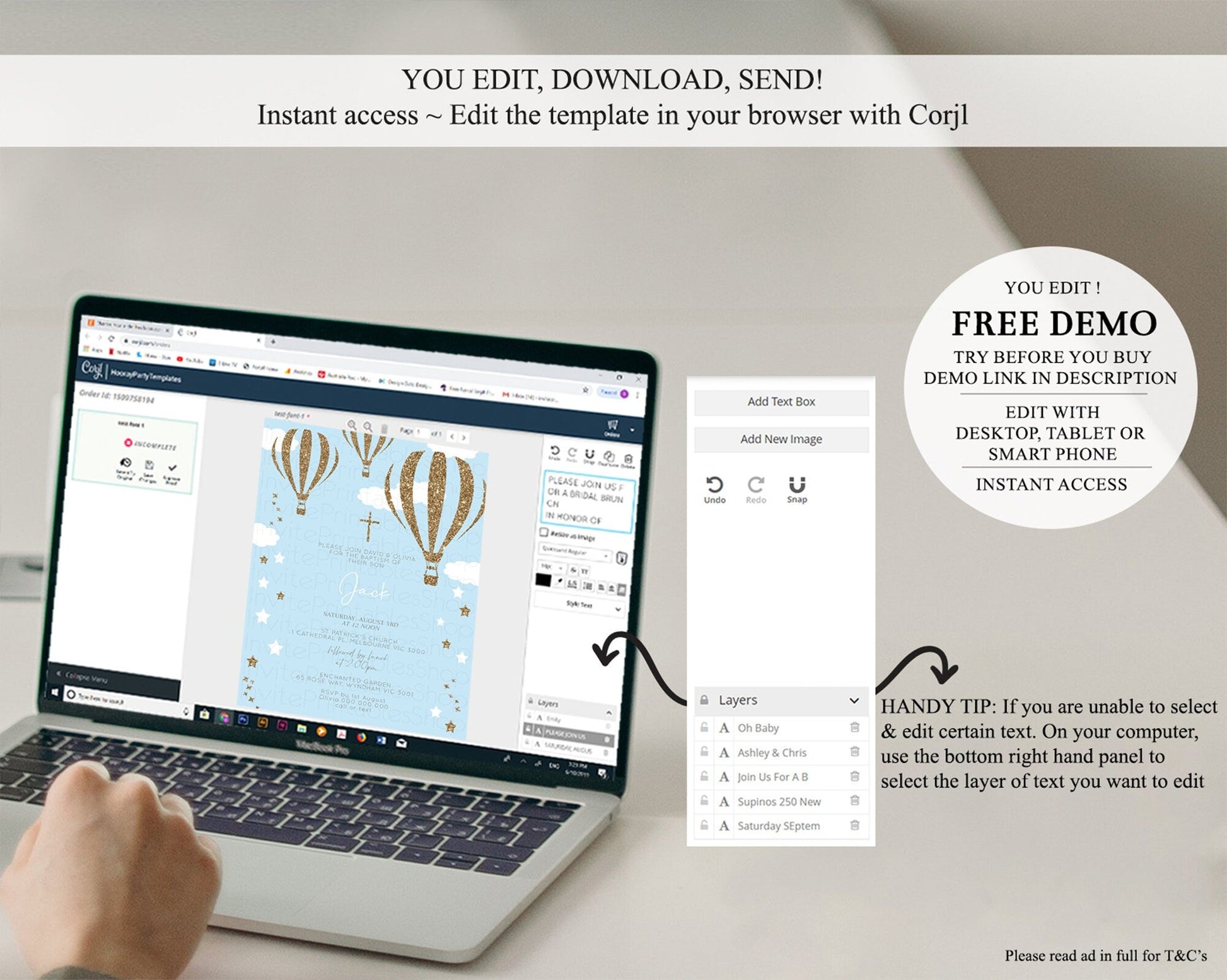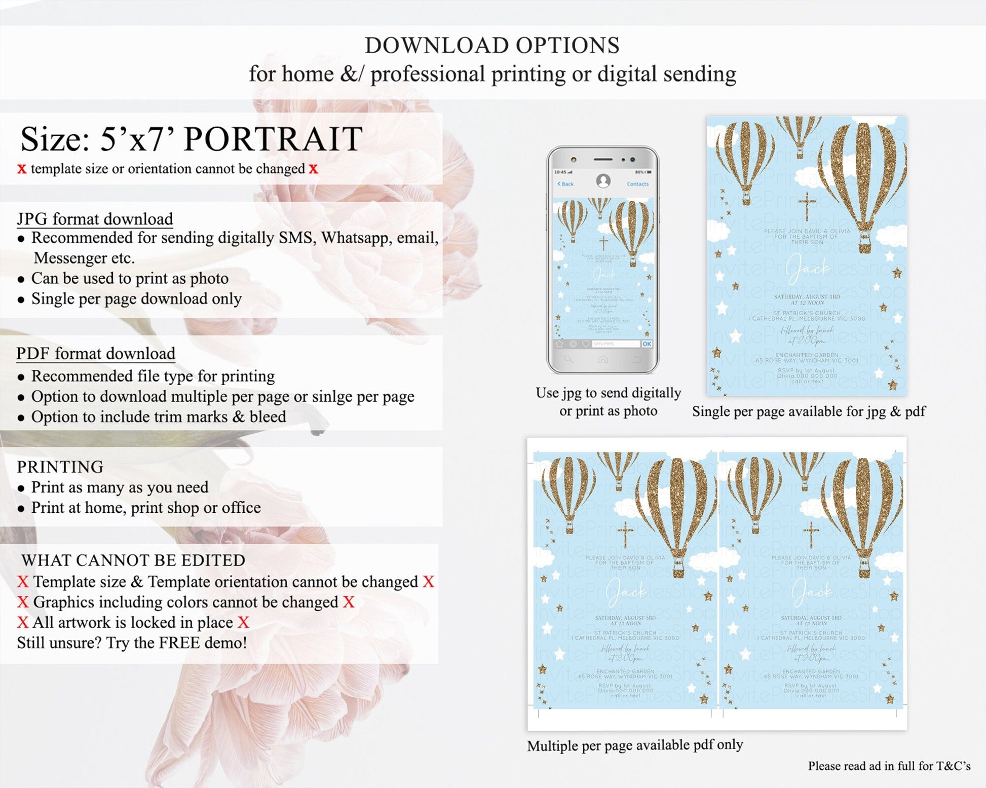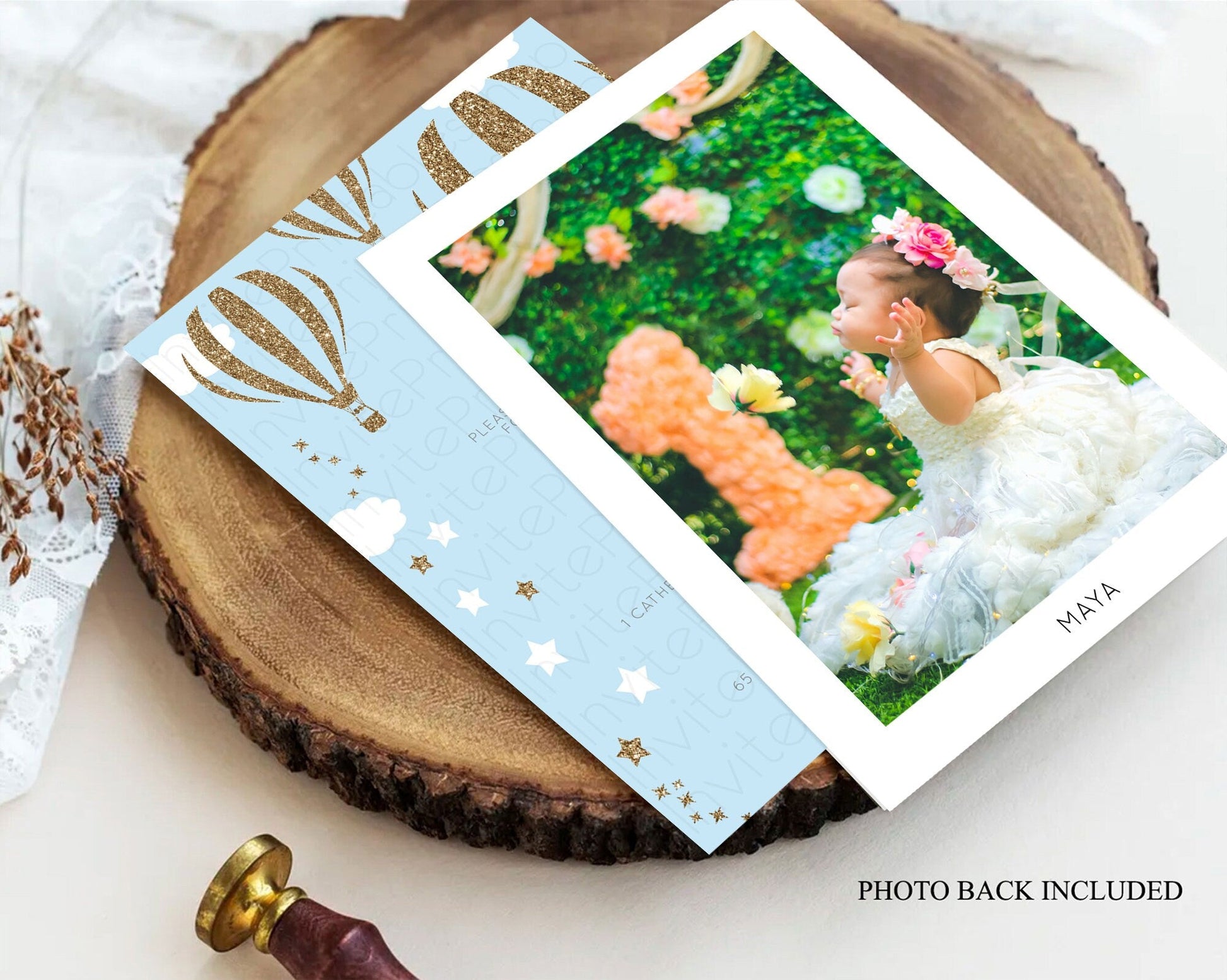 Hot Air Balloon Baptism Invitation Hot Air Balloon Baptism Birthday Invitation Adventure Awaits Up Up Away Glitter Blue Watercolor D10332