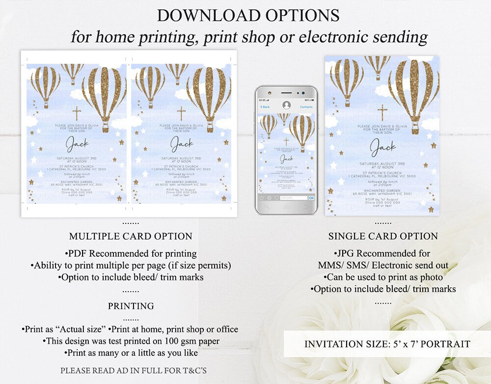 Hot Air Balloon Baptism Invitation Hot Air Balloon Christening Invite Blue Watercolor Invite Gold Cross Invite Hot Air Balloon Invite 402
