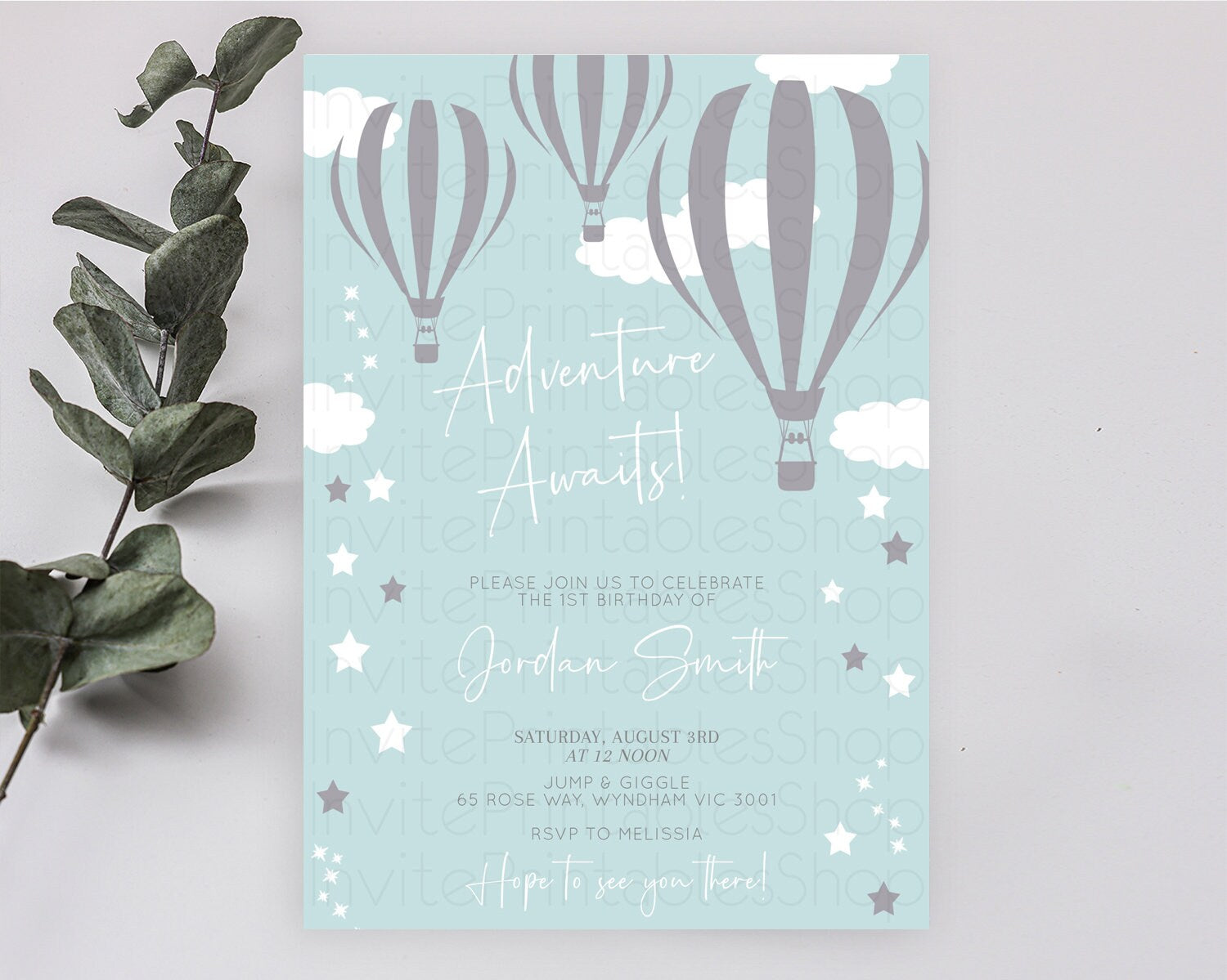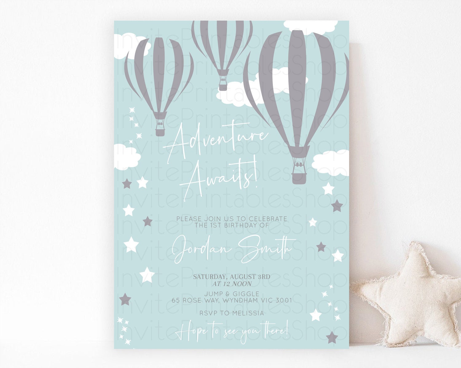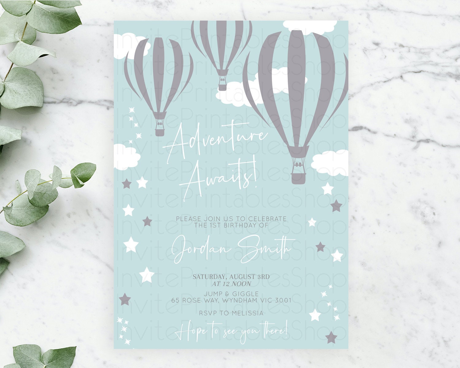 Hot Air Balloon Birthday Invitation Hot Air Balloon Invites Adventure Awaits Up Up & Away Glitter Blue Watercolor 1st Birthday Boy D10324