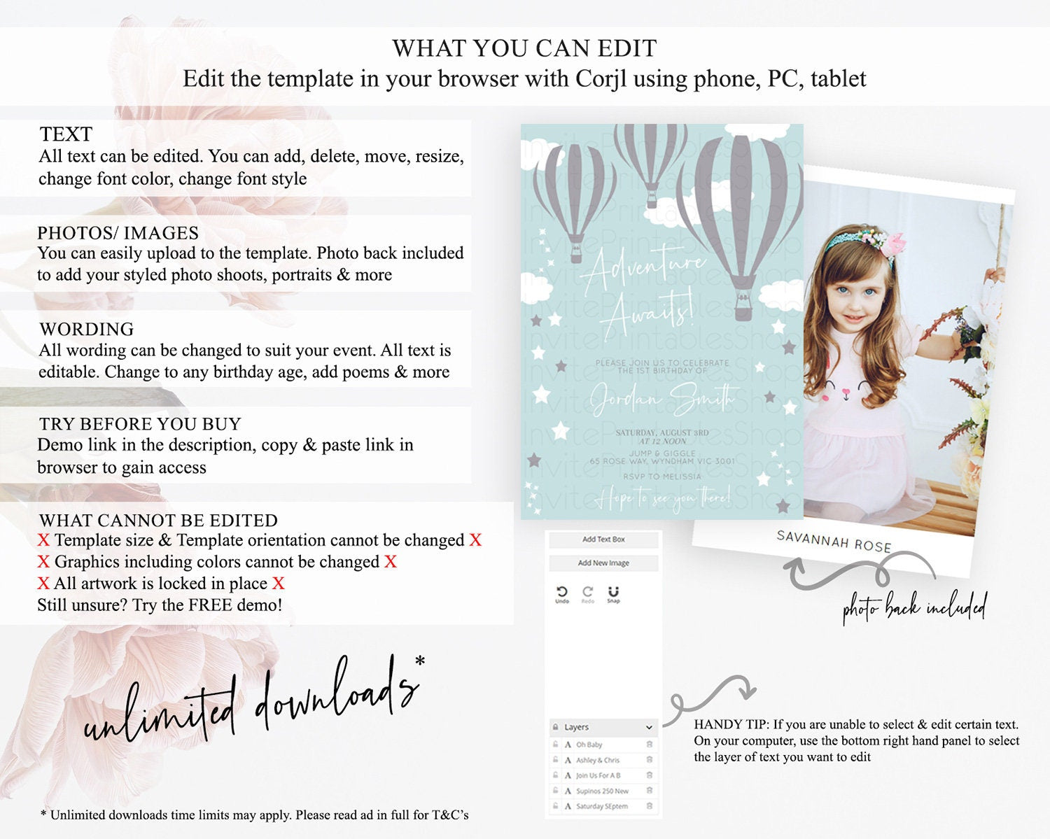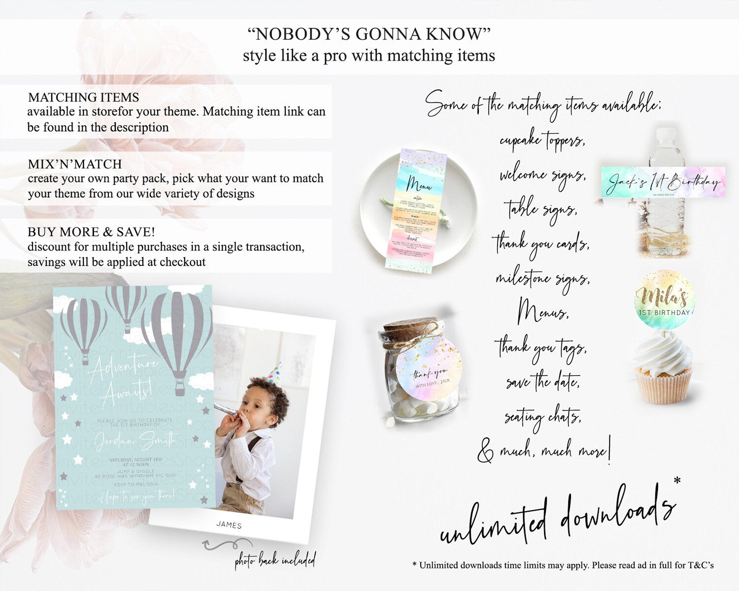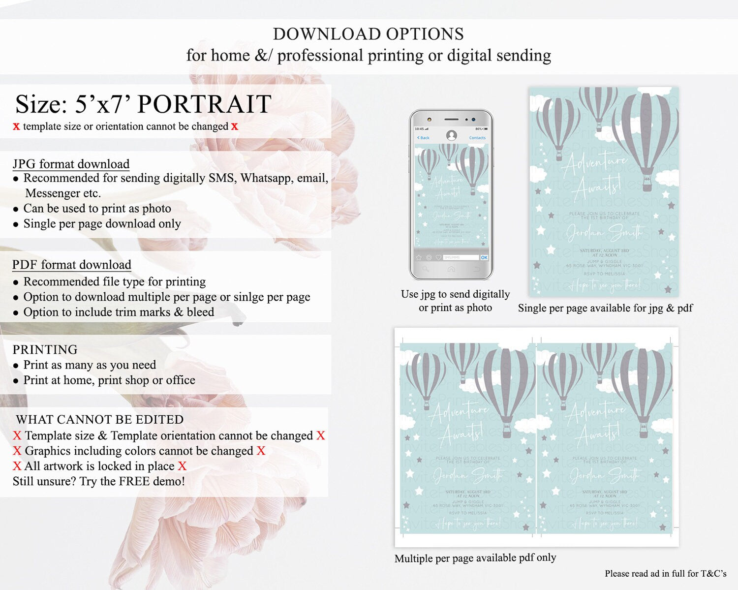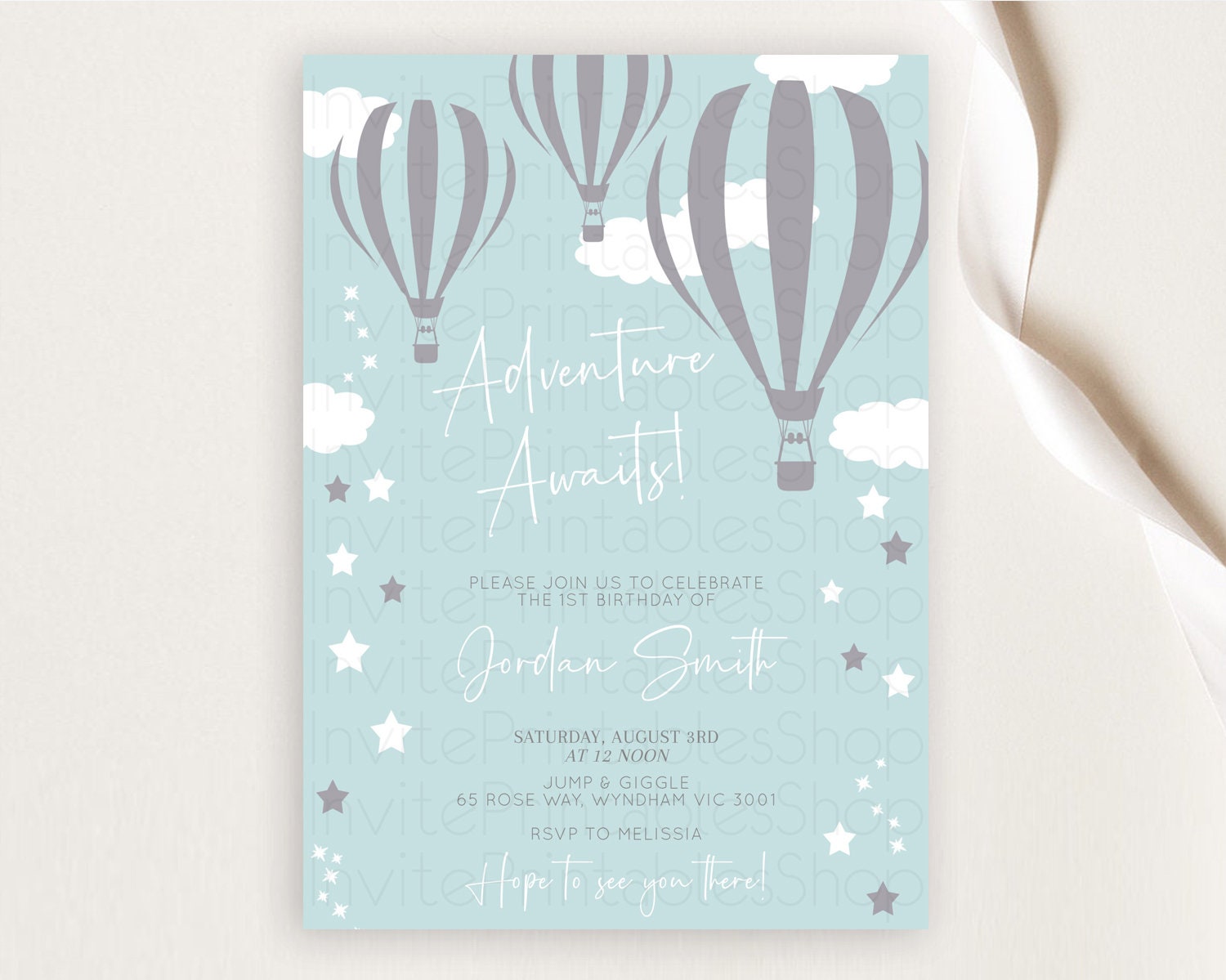 Hot Air Balloon Birthday Invitation Hot Air Balloon Invites Adventure Awaits Up Up & Away Glitter Blue Watercolor 1st Birthday Boy D10324