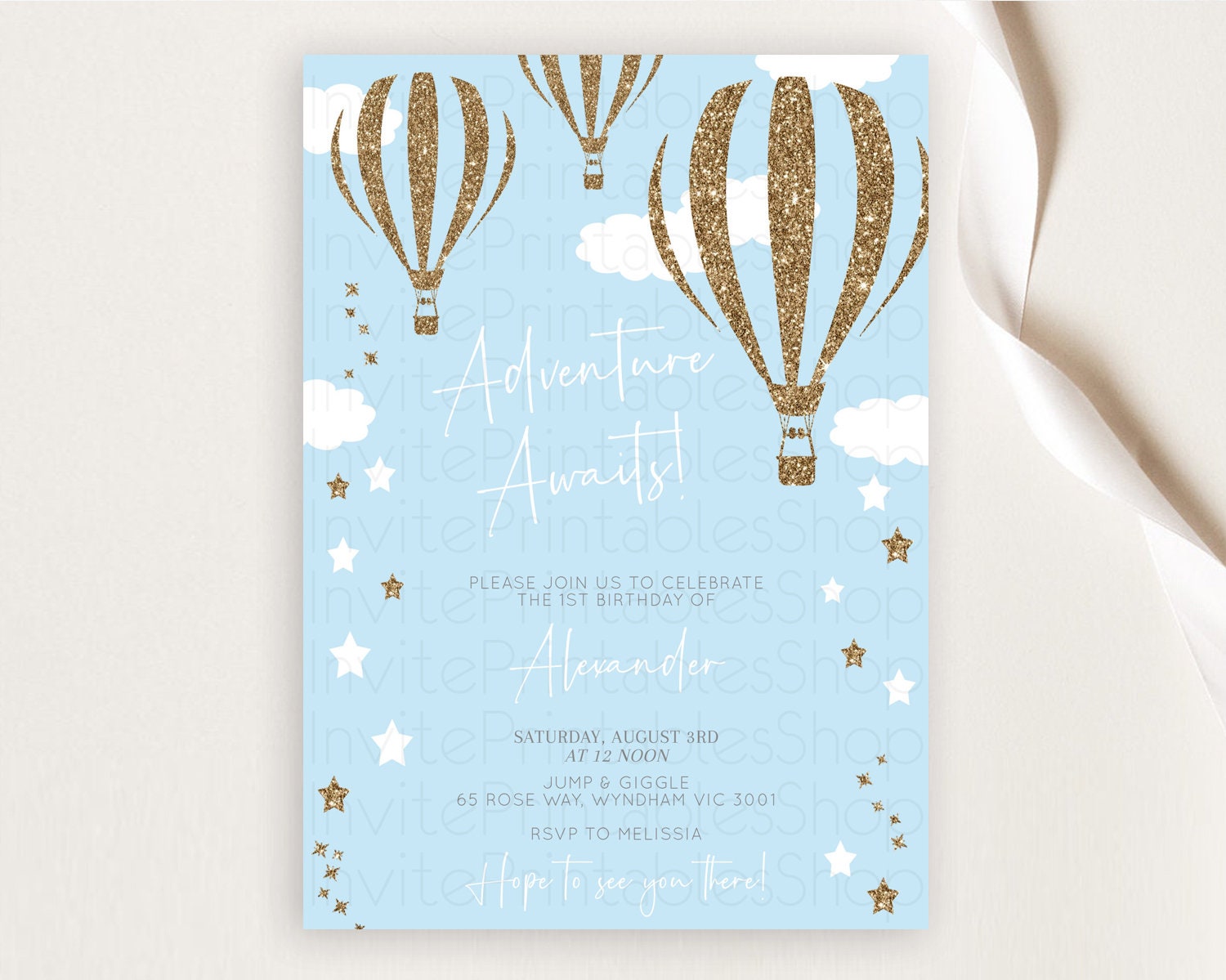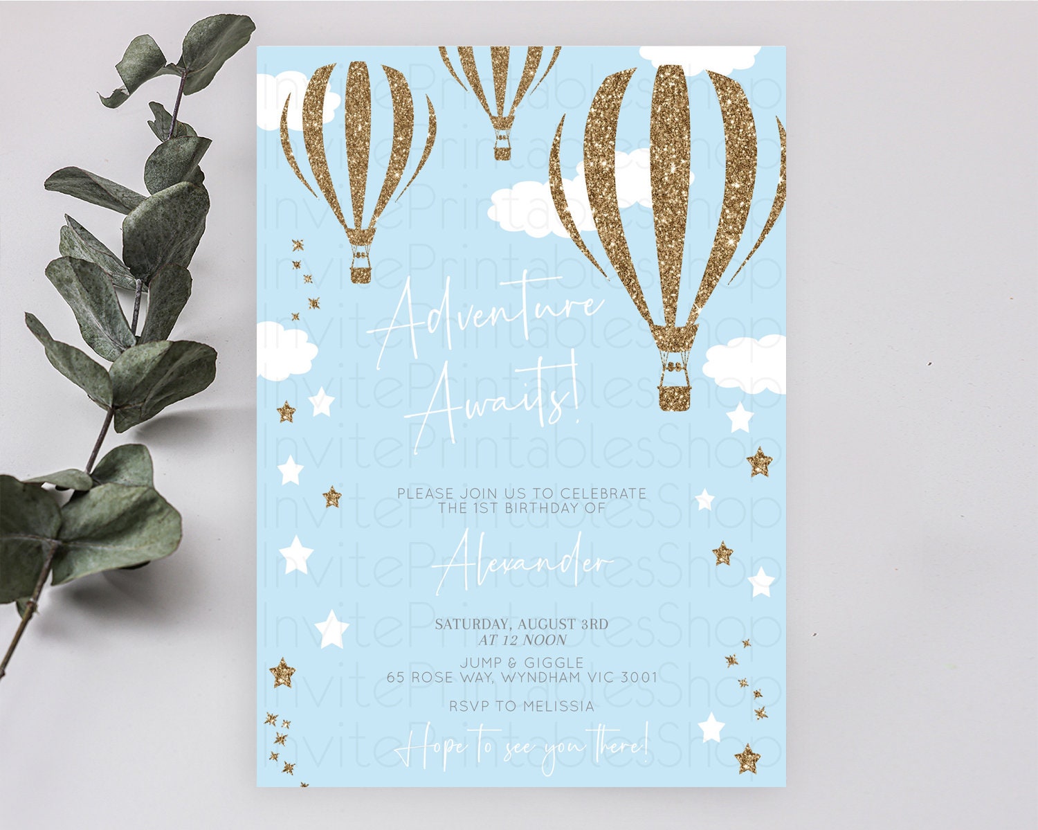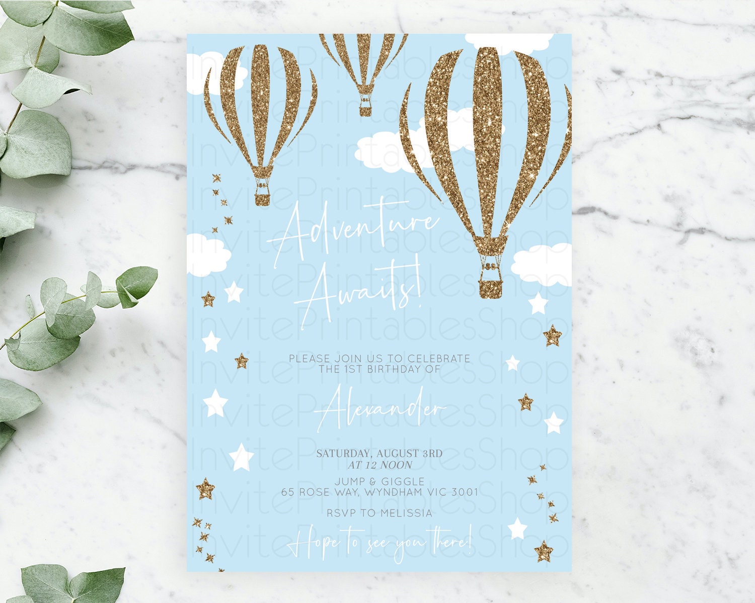 Hot Air Balloon Birthday Invitation Hot Air Balloon Invites Adventure Awaits Up Up & Away Glitter Blue Watercolor 1st Birthday Boy D10332