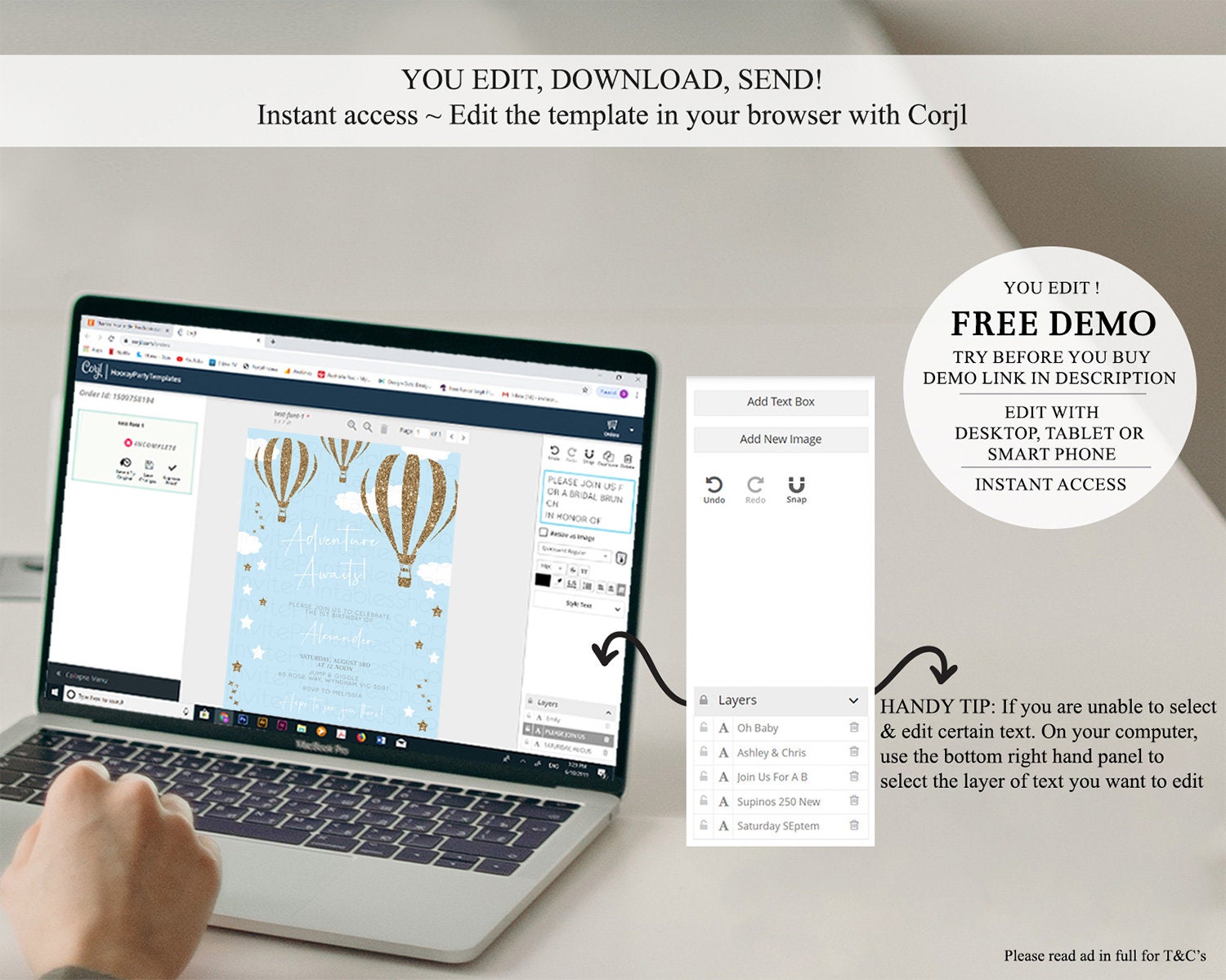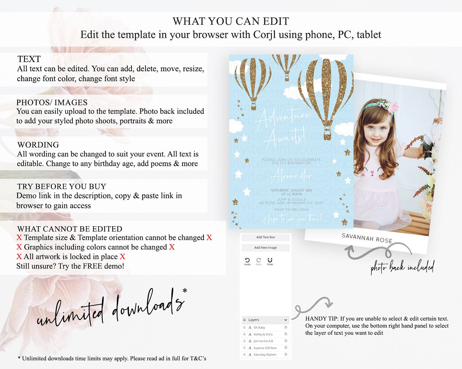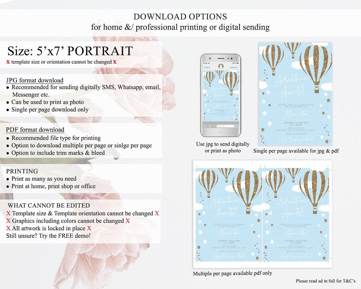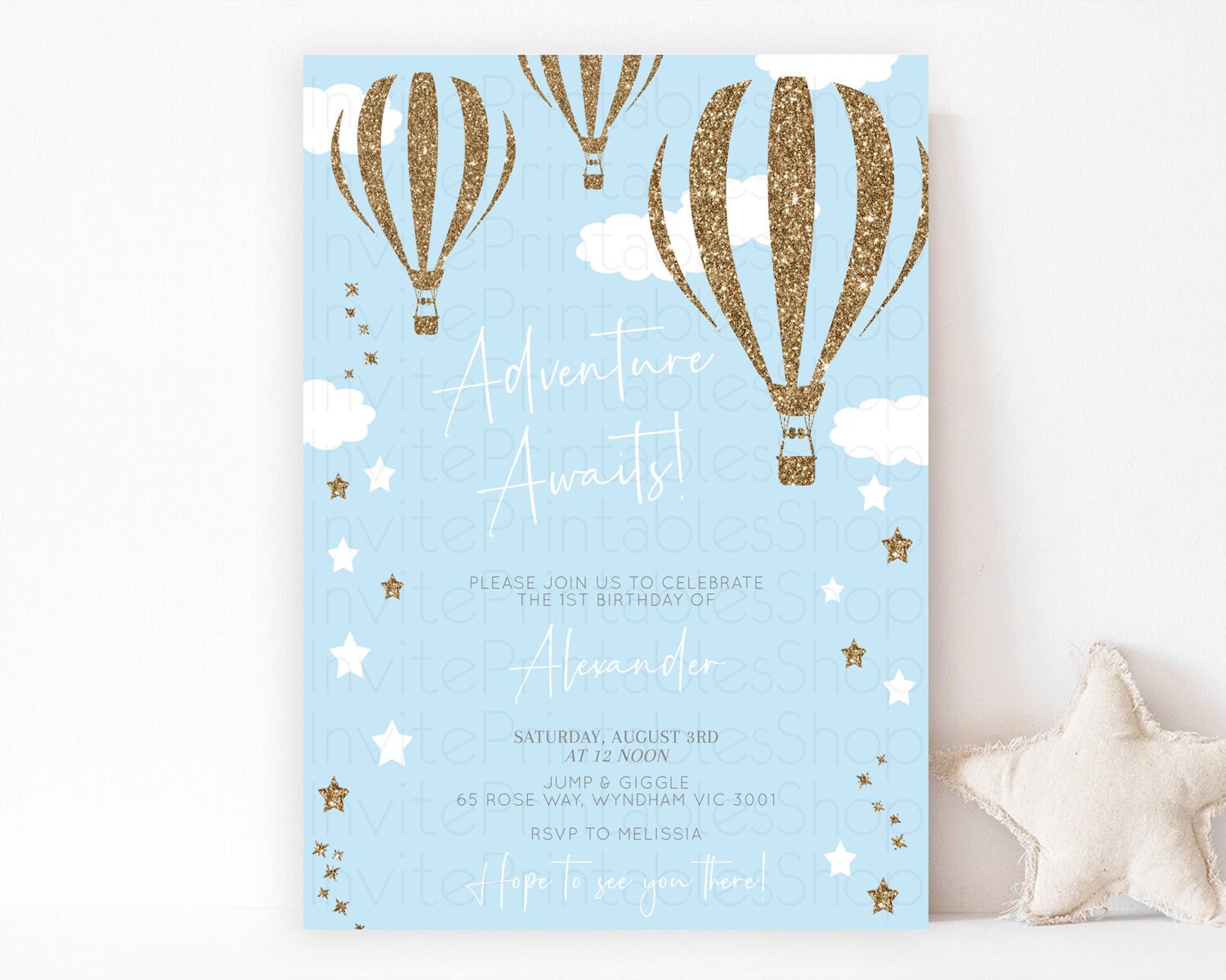 Hot Air Balloon Birthday Invitation Hot Air Balloon Invites Adventure Awaits Up Up & Away Glitter Blue Watercolor 1st Birthday Boy D10332