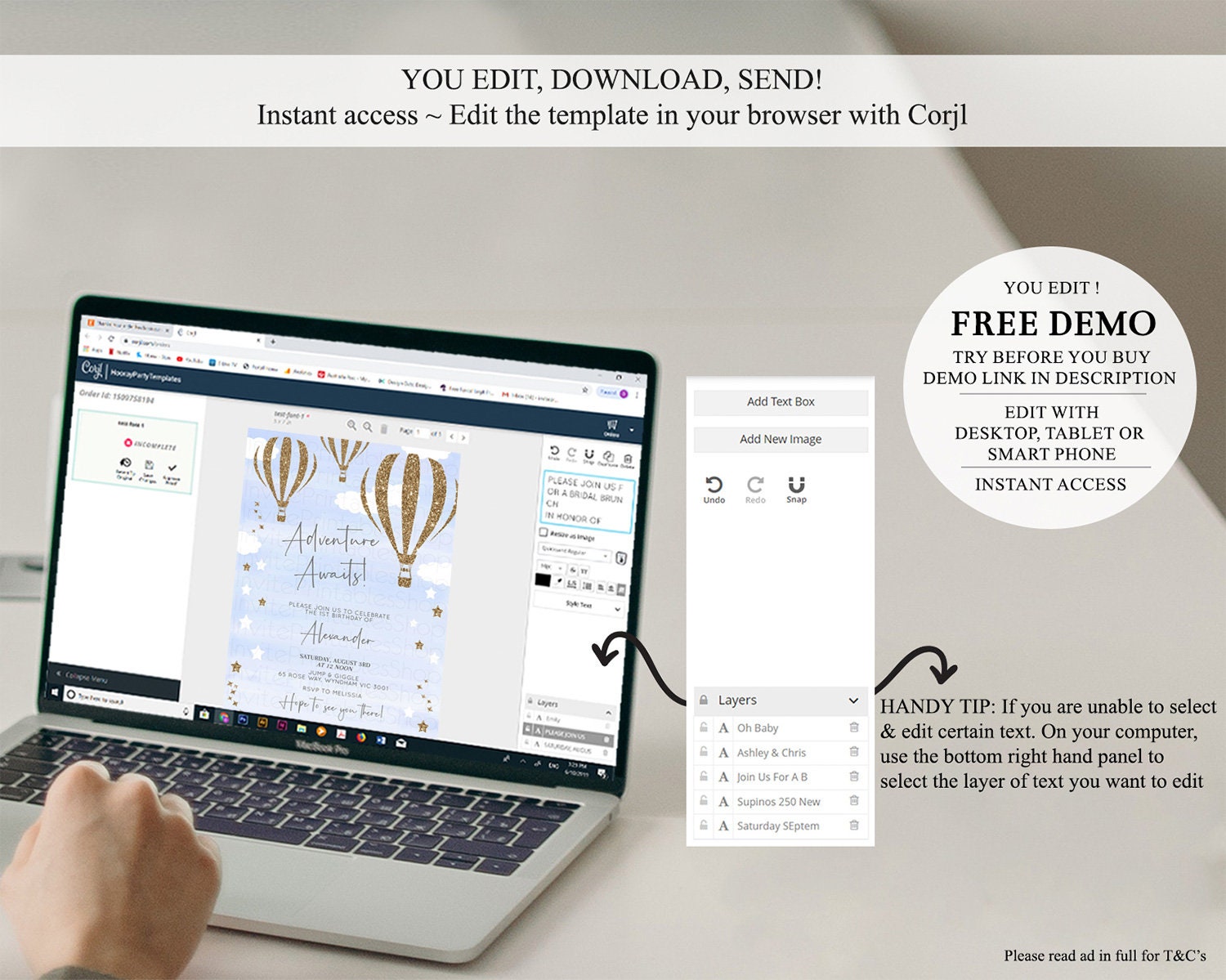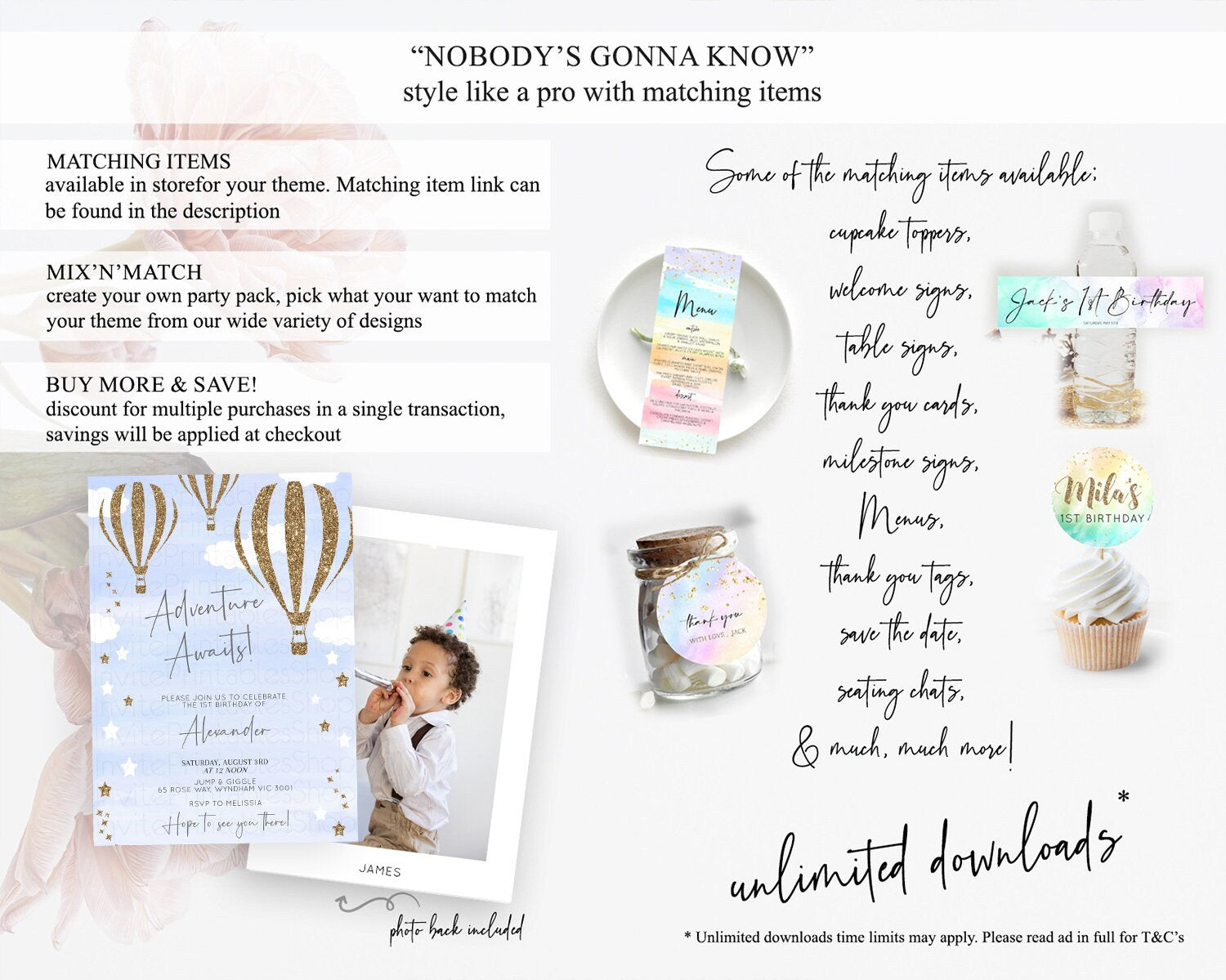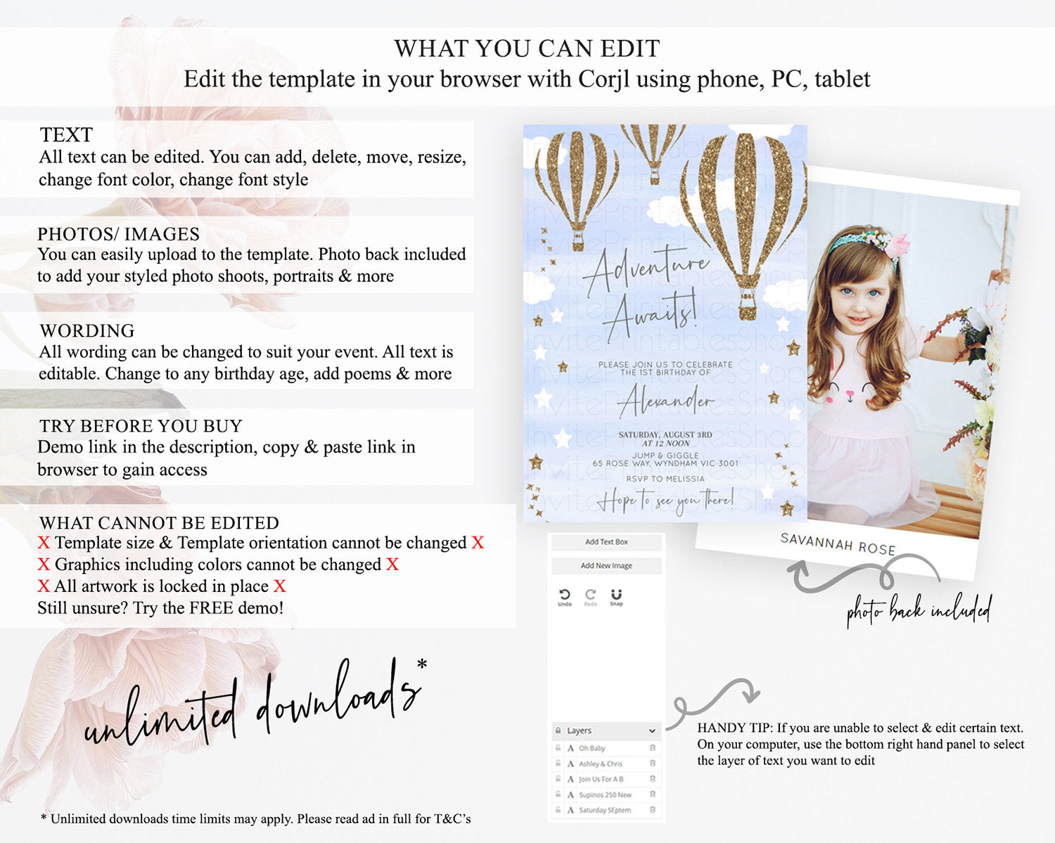 Hot Air Balloon Birthday Invitation Hot Air Balloon Invites Adventure Awaits Up Up & Away Glitter Blue Watercolor 1st Birthday Boy D10333