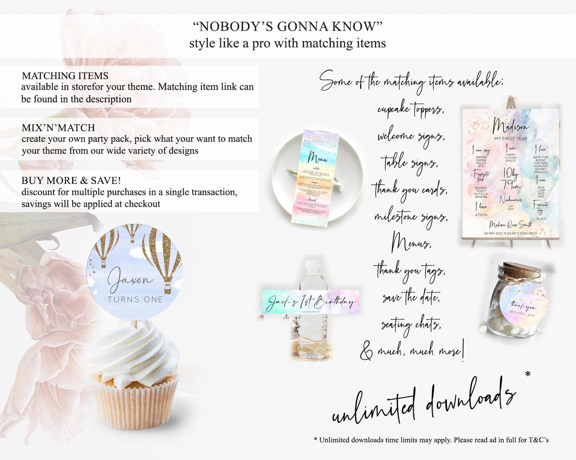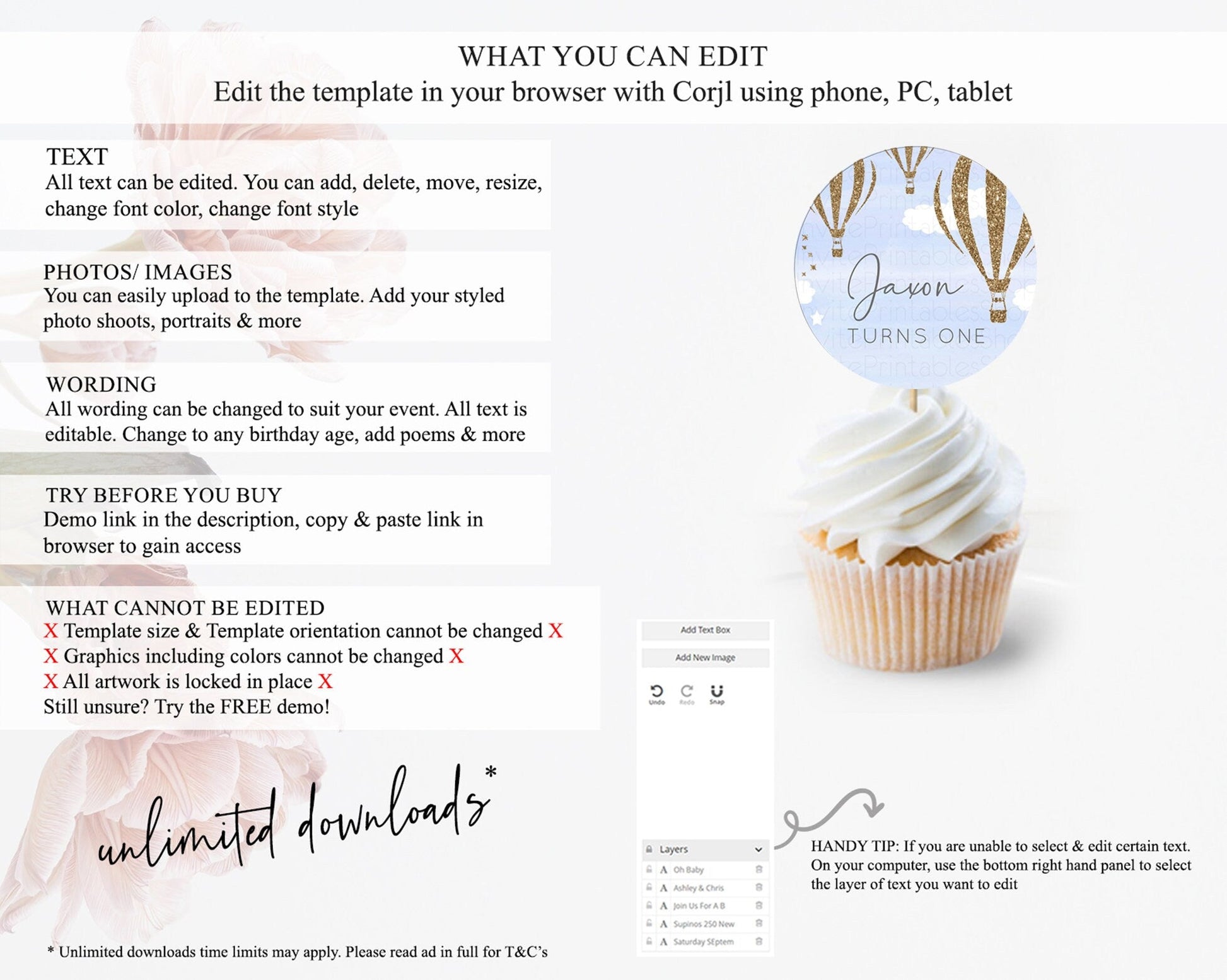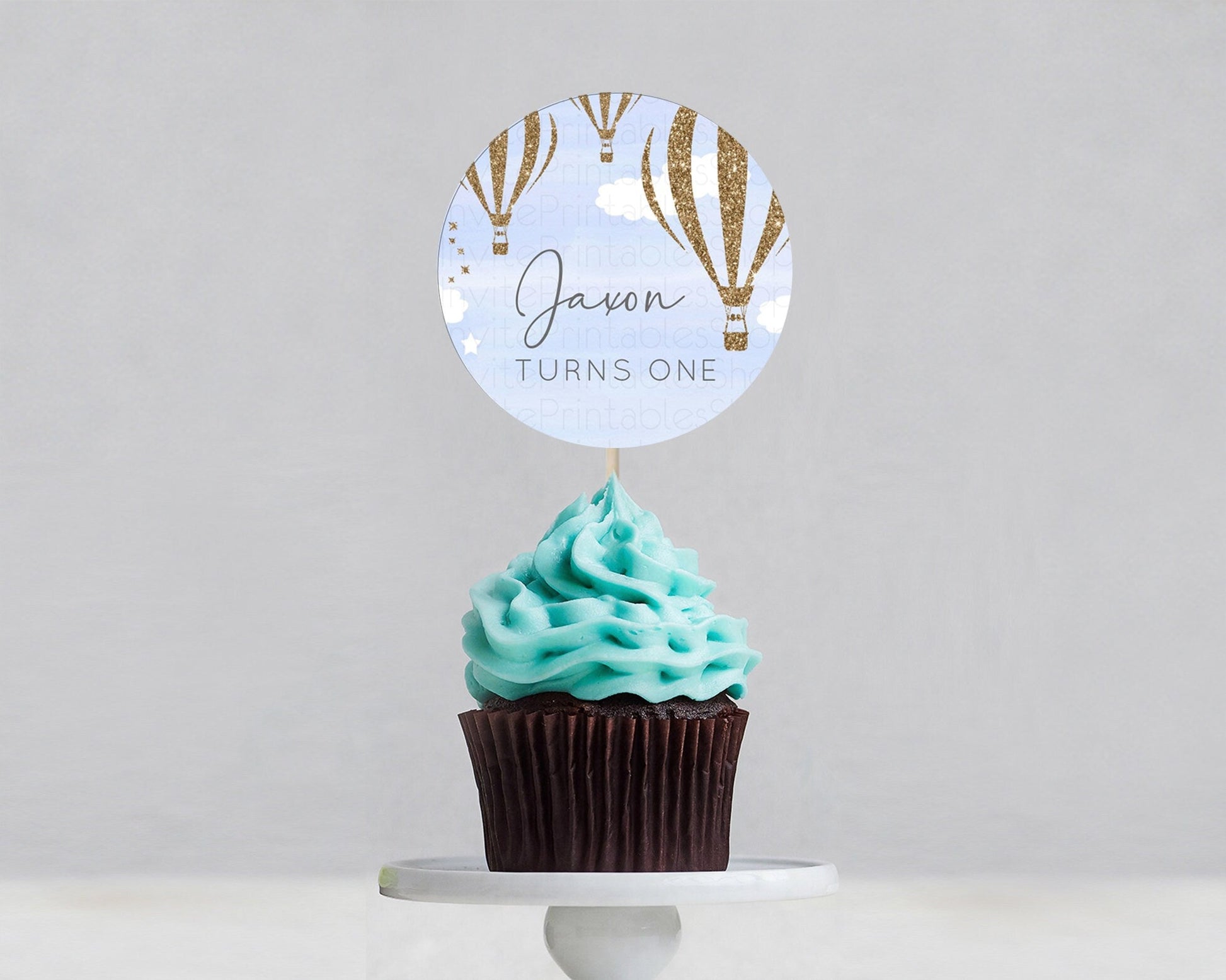 Hot Air Balloon Cupcake Toppers Adventure Awaits Up & Away Glitter Blue Watercolor Cupcake Topper Hot Air Balloon Party Decor D10333