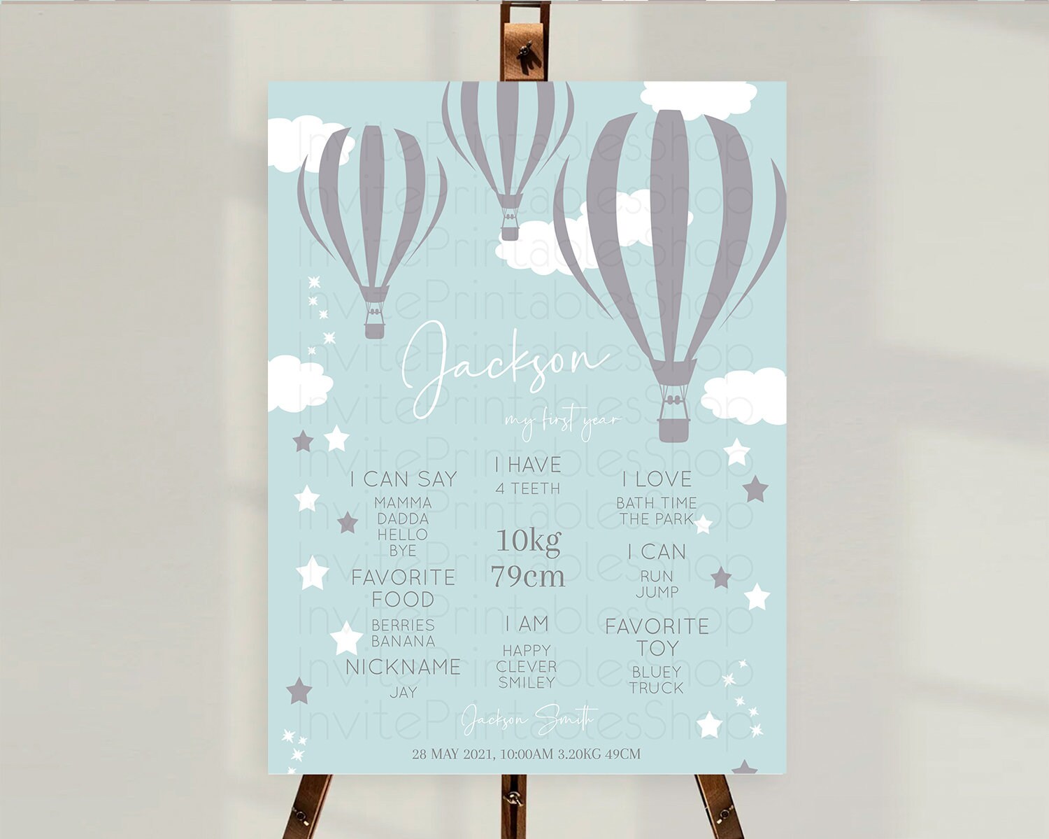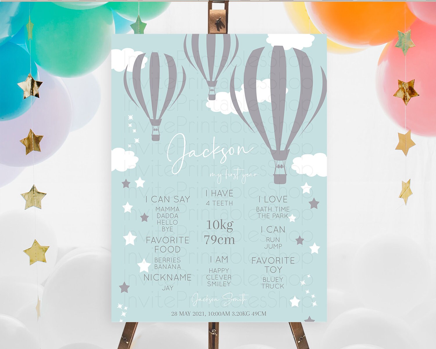 Hot Air Balloon First Birthday Milestone Poster Hot Air Balloon Milestone Board Adventure Awaits Blue Watercolor 1st Birthday Boy D10324