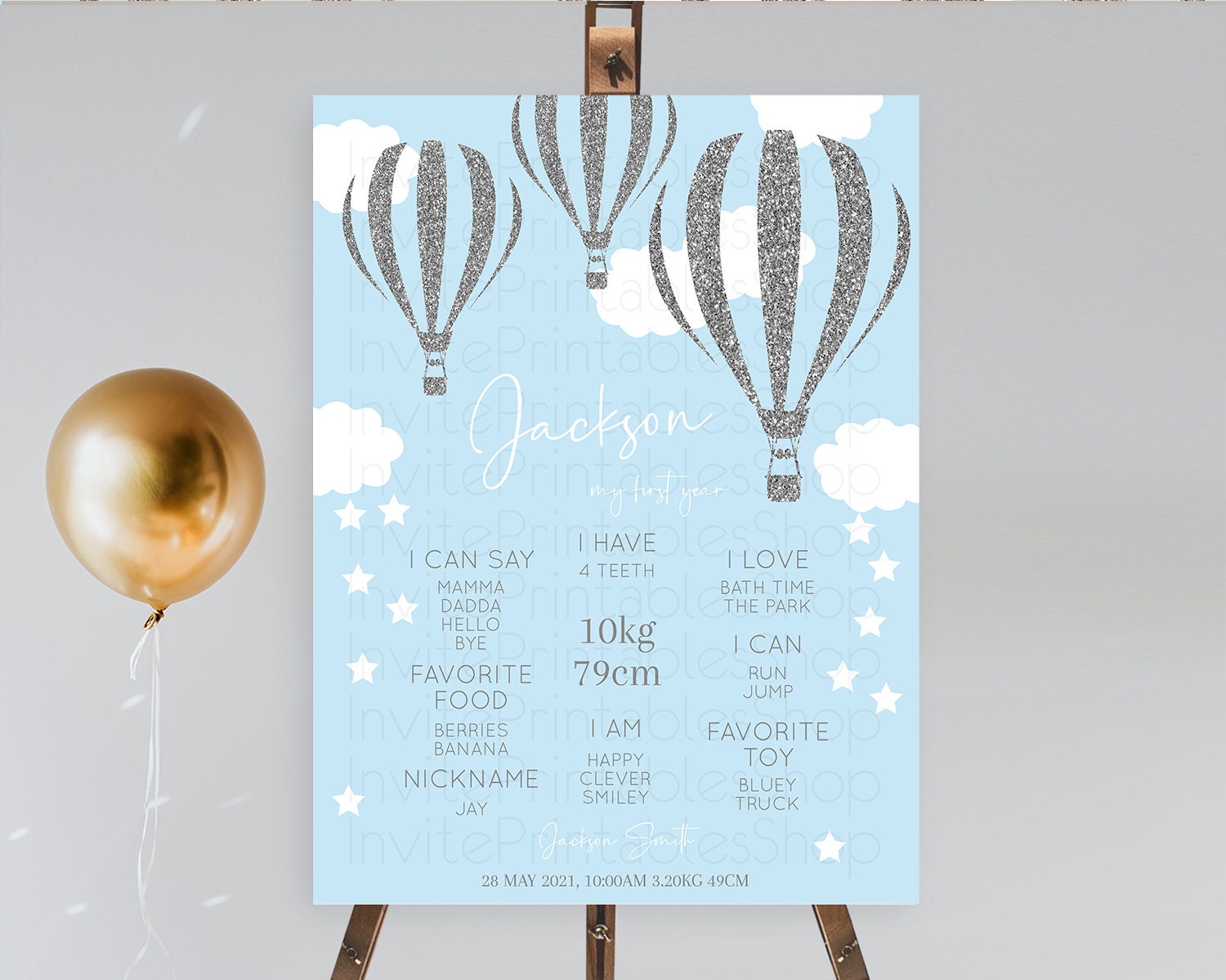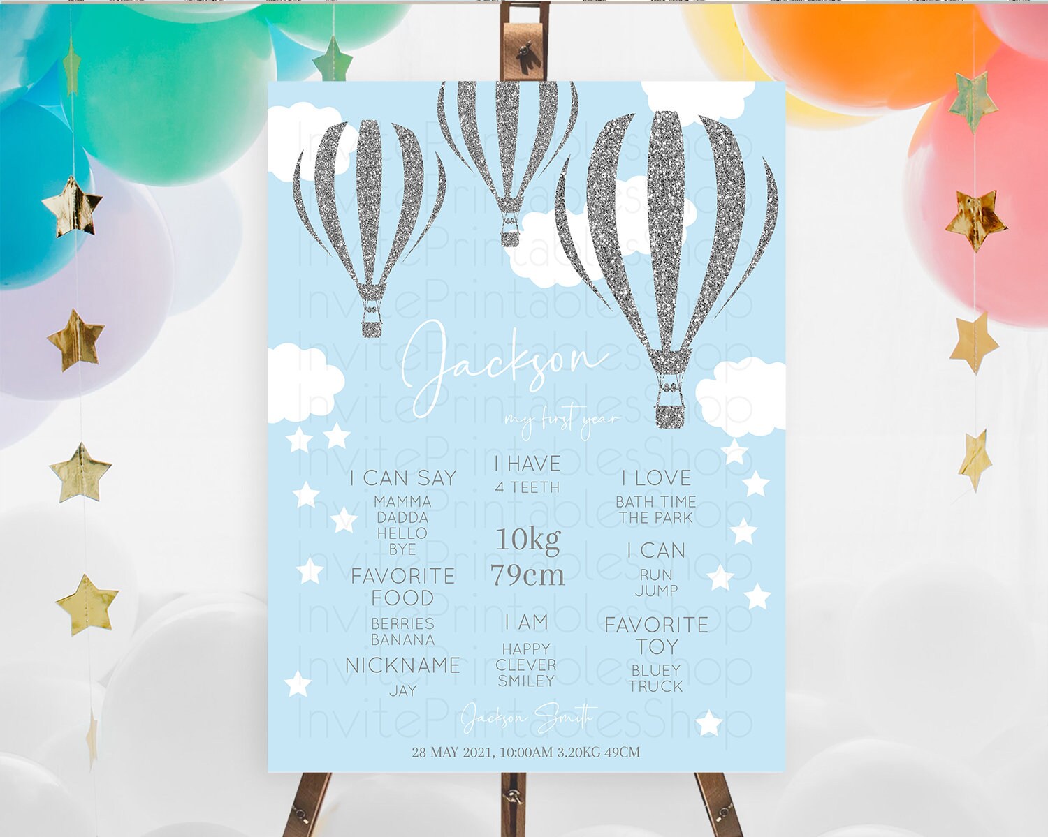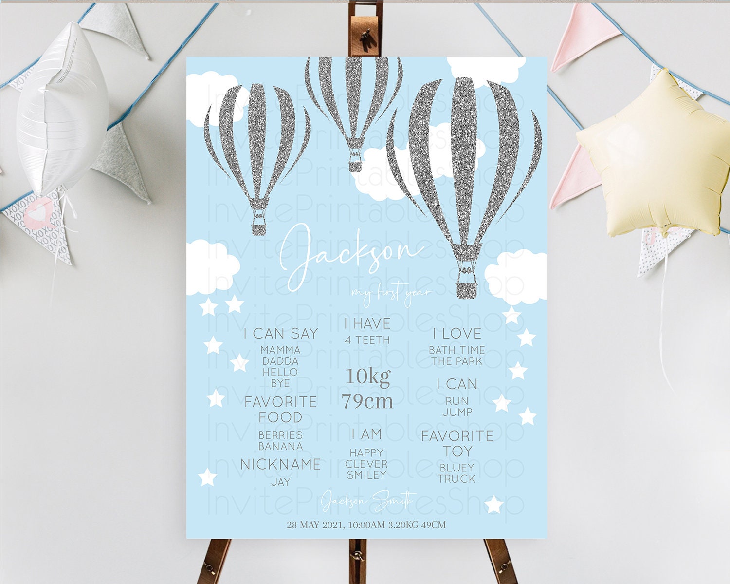 Hot Air Balloon First Birthday Milestone Poster Hot Air Balloon Milestone Board Adventure Awaits Blue Watercolor 1st Birthday Boy D10335