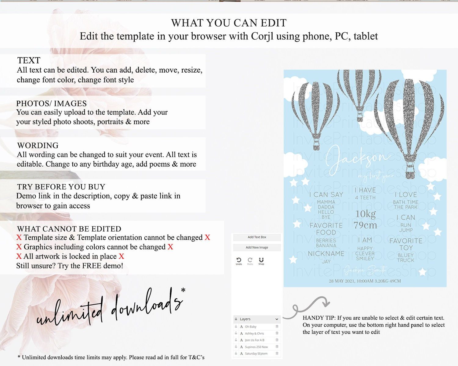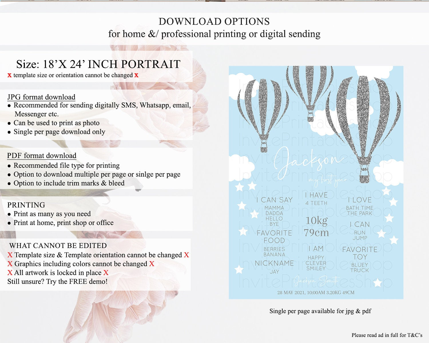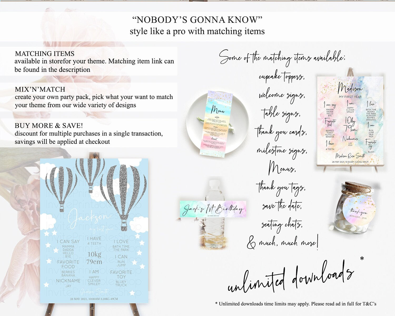Hot Air Balloon First Birthday Milestone Poster Hot Air Balloon Milestone Board Adventure Awaits Blue Watercolor 1st Birthday Boy D10335