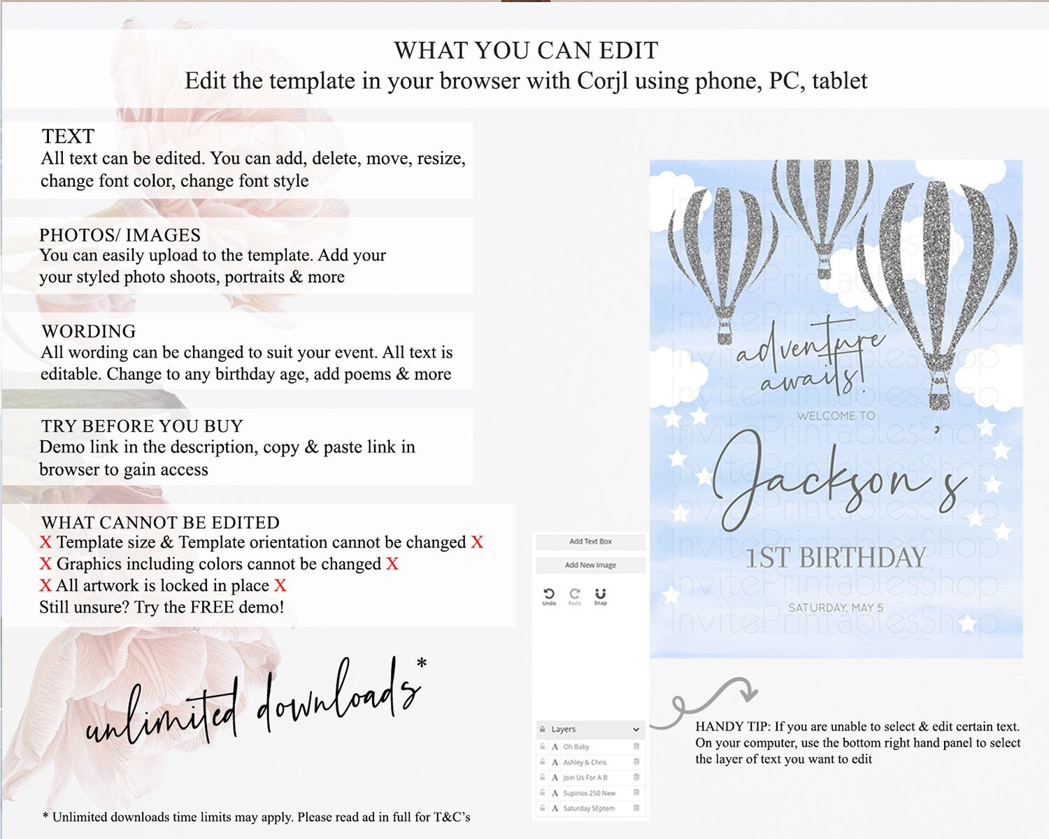 Hot Air Balloon First Birthday Welcome Board Hot Air Balloon Welcome Board Adventure Awaits Watercolor First Birthday Welcome Sign D10334