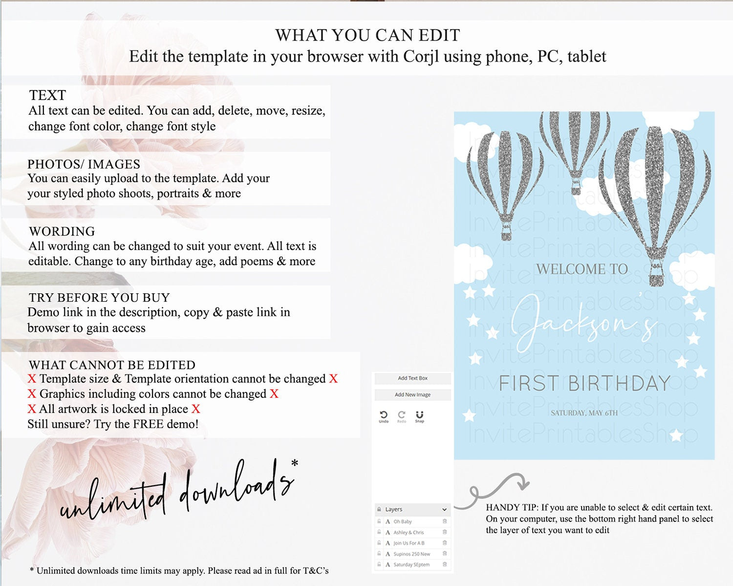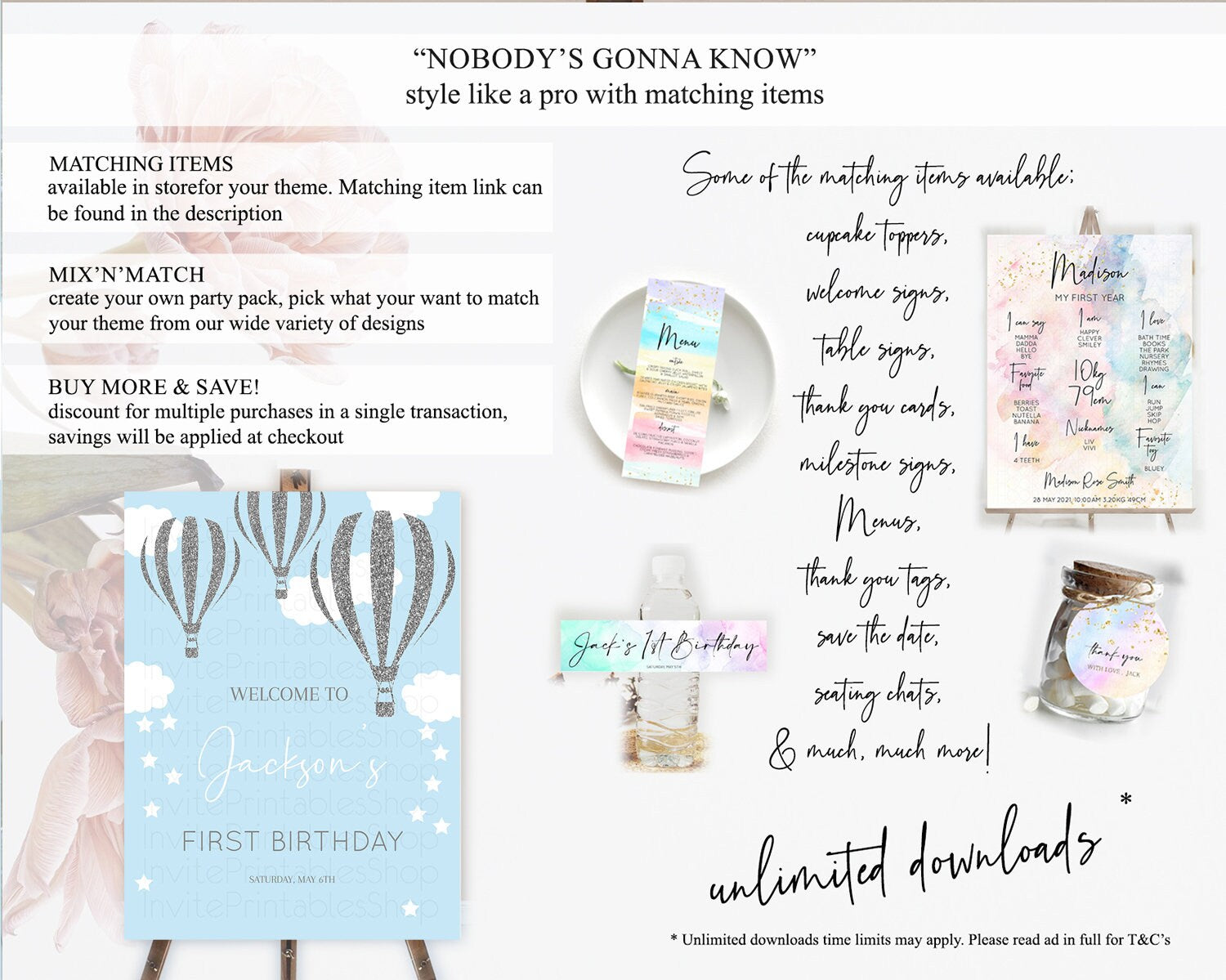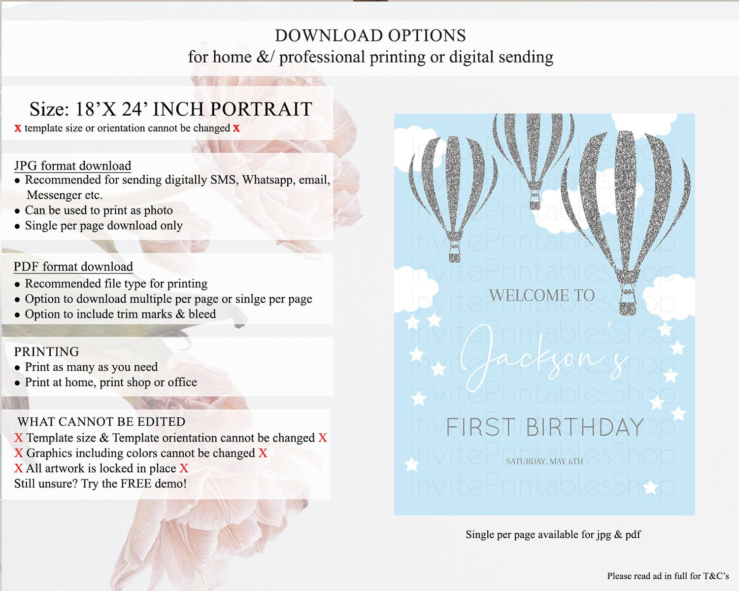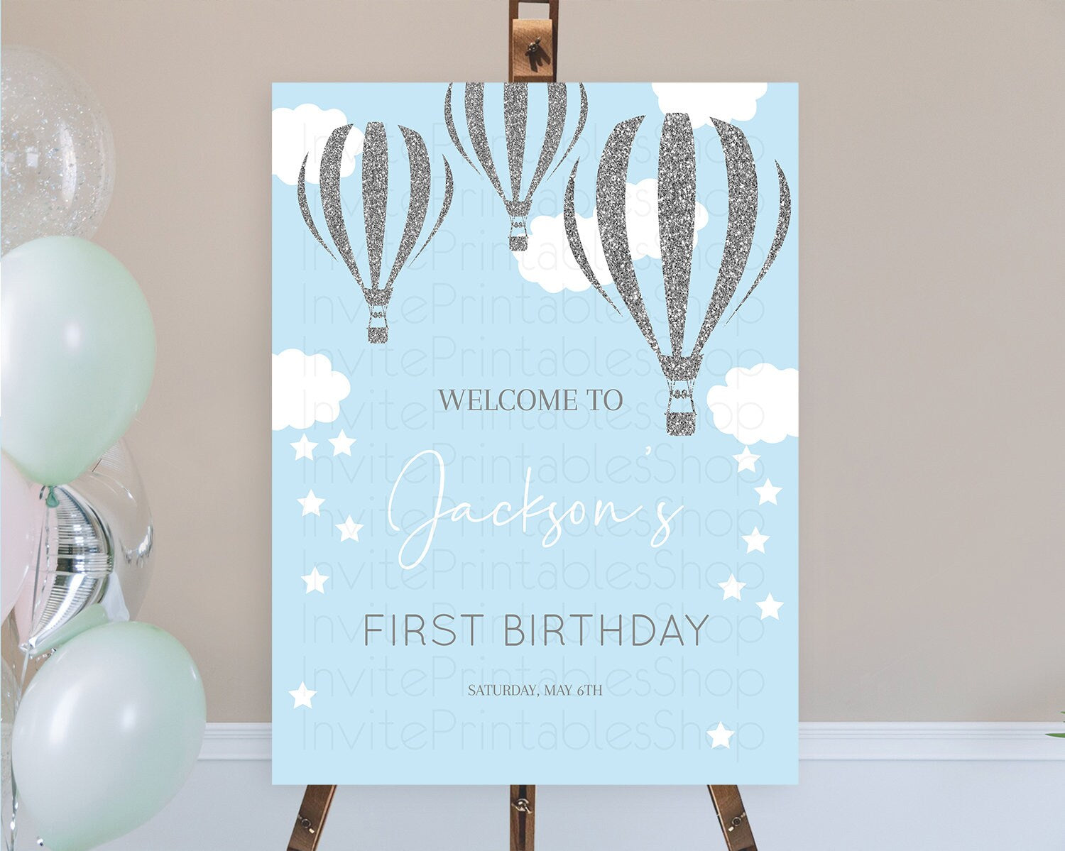 Hot Air Balloon First Birthday Welcome Board Hot Air Balloon Welcome Board Adventure Awaits Watercolor First Birthday Welcome Sign D10335