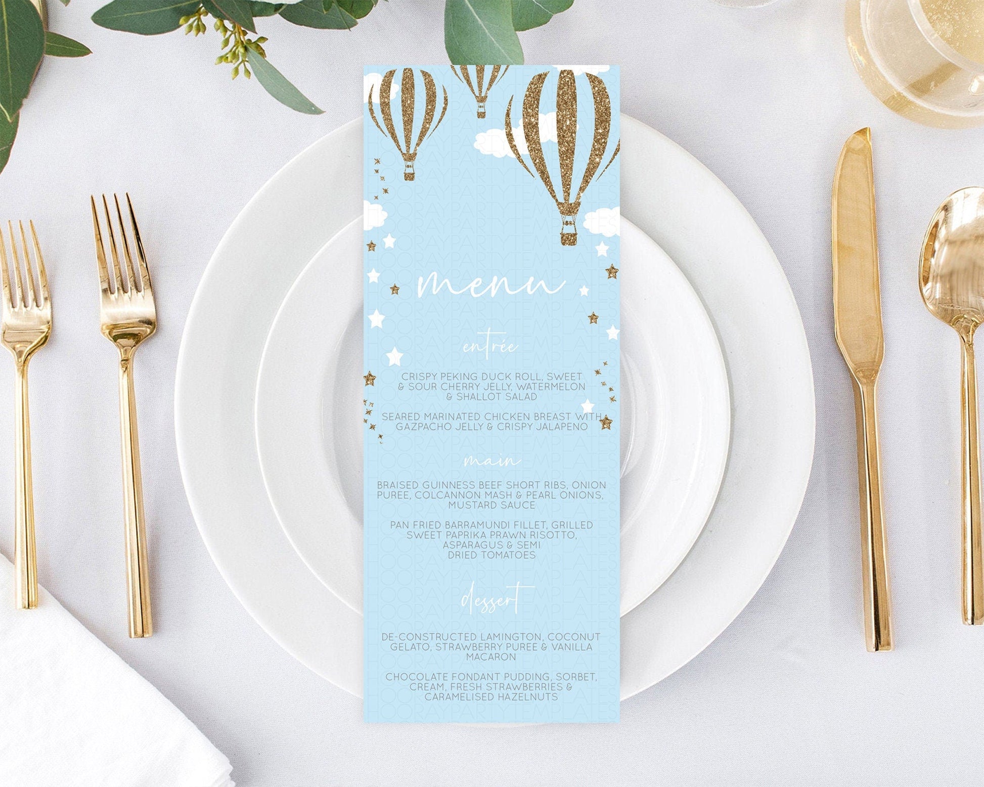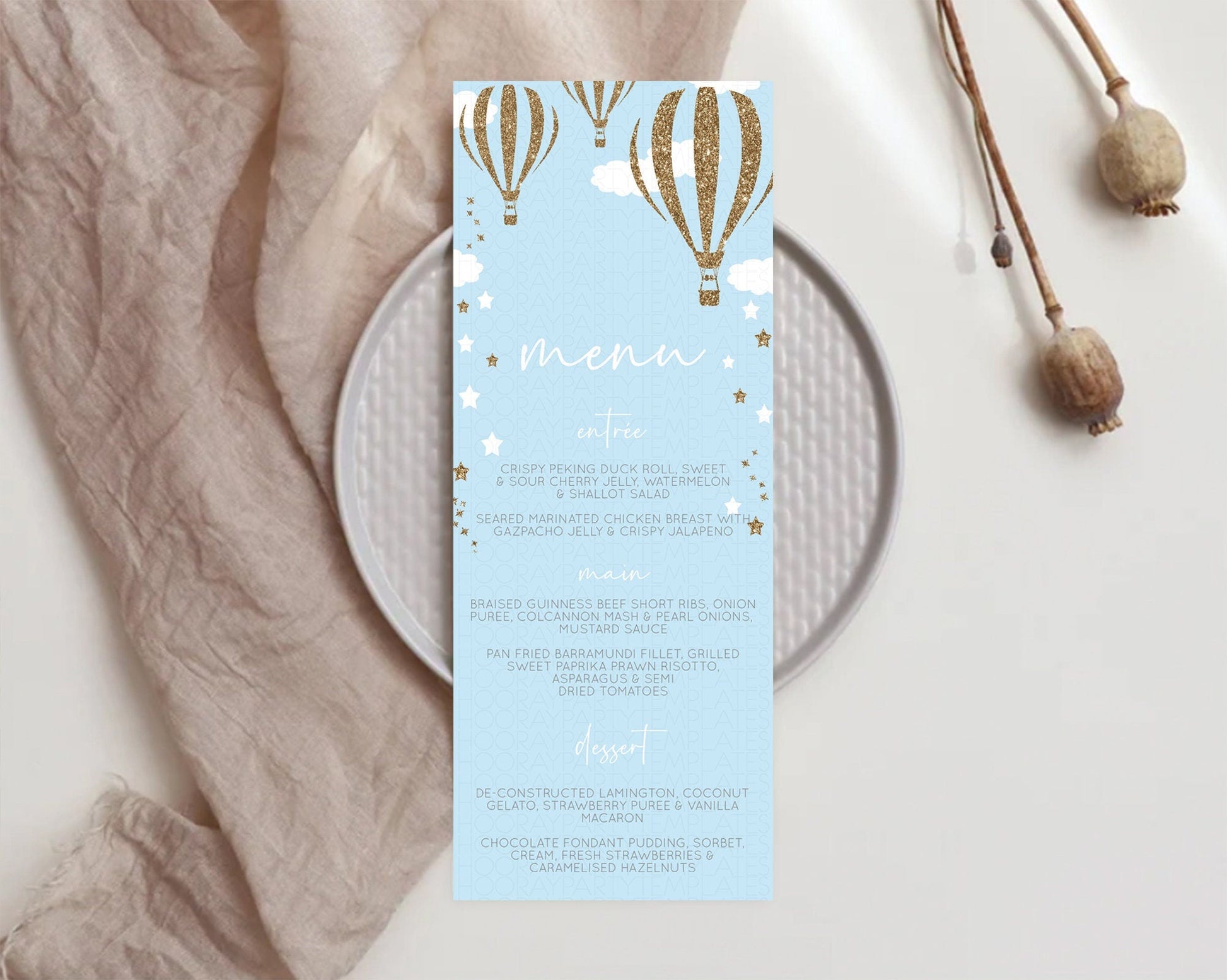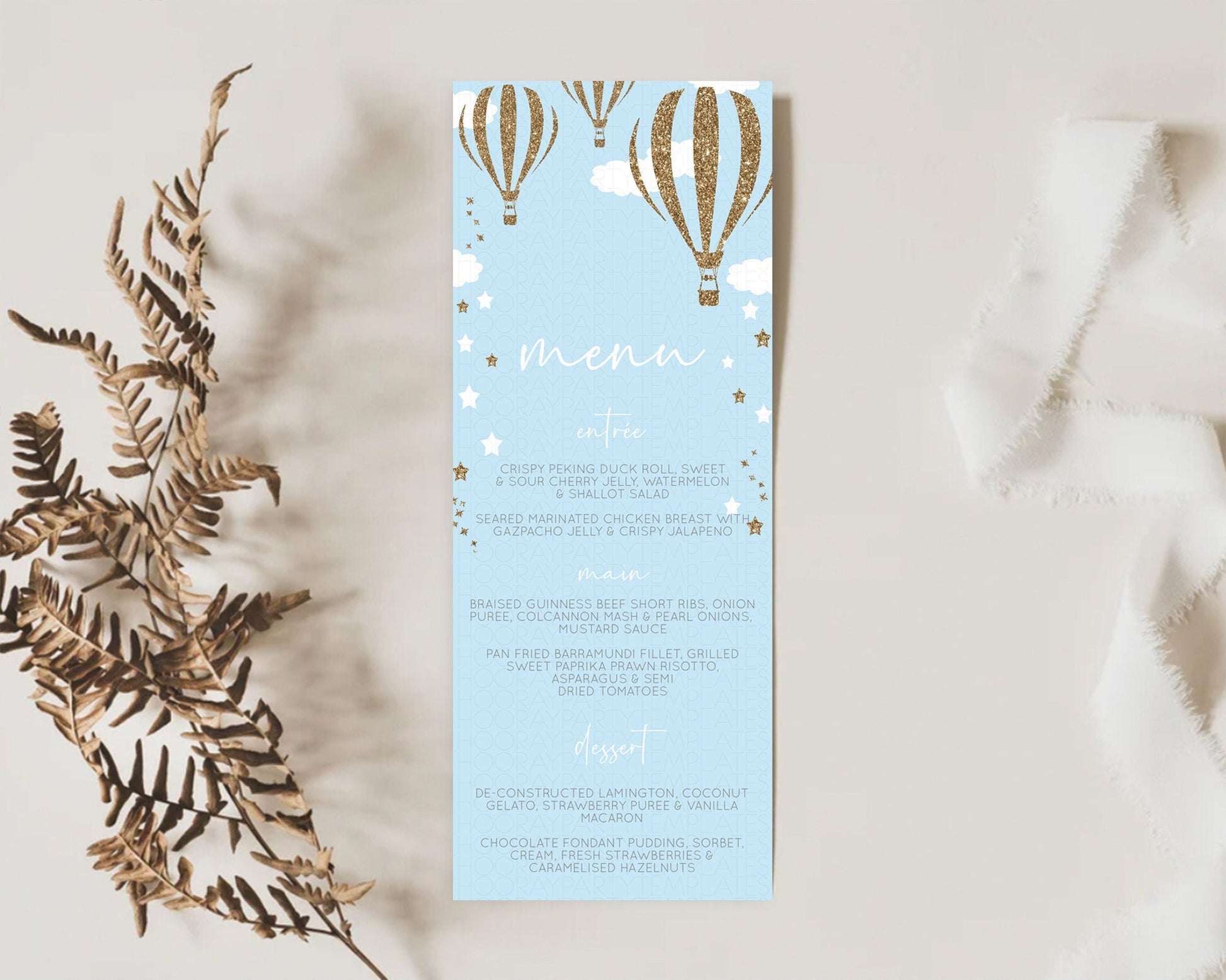 Hot Air Balloon Menu Hot Air Balloon Menu Template Hot Air Balloon Table Decor Adventure Awaits Dinner Dessert Party Food Menu D10332