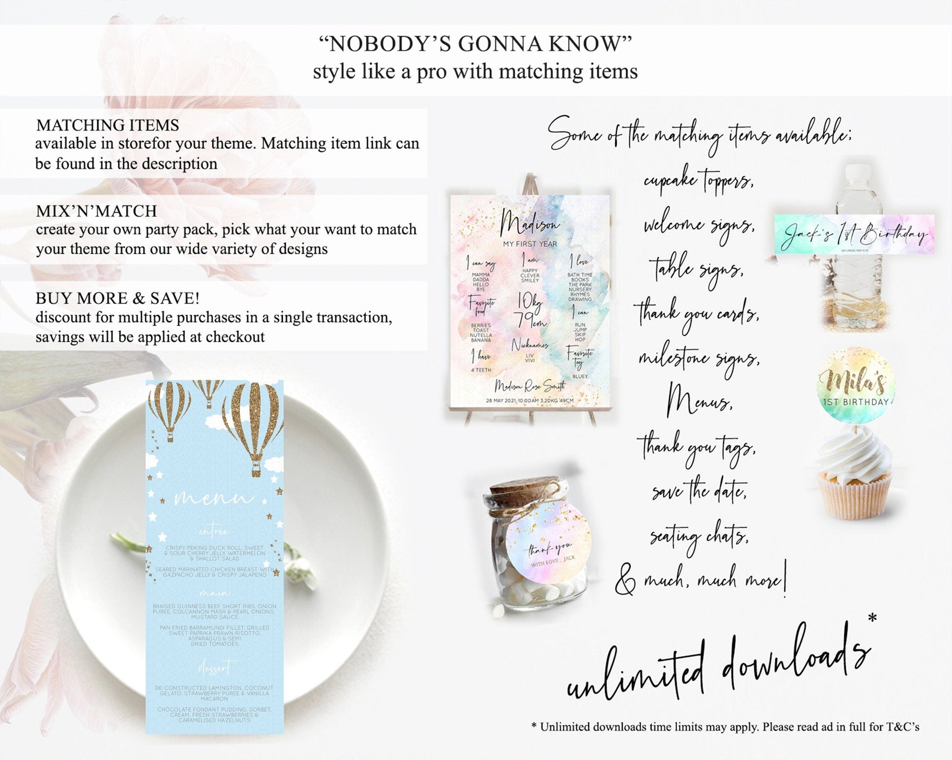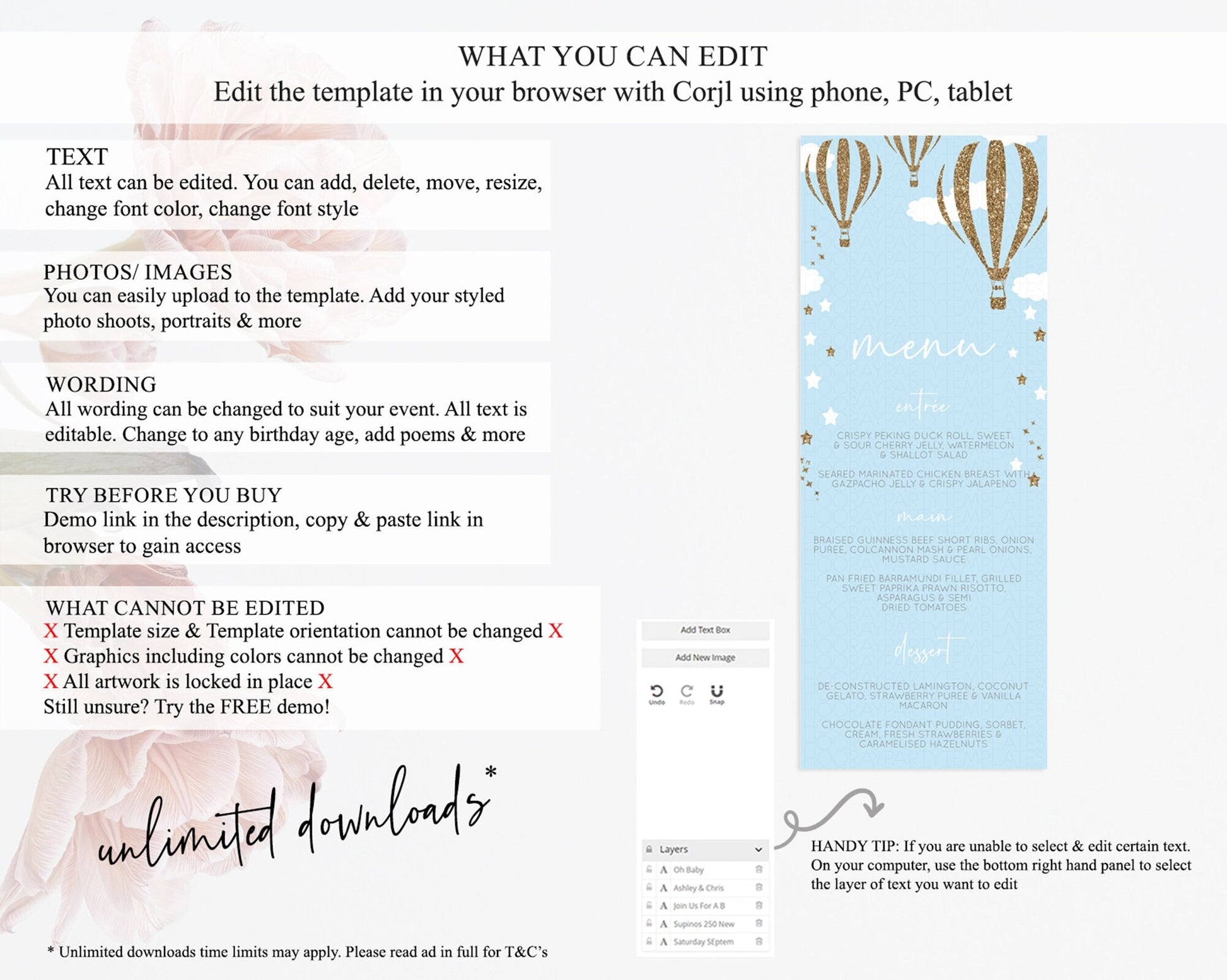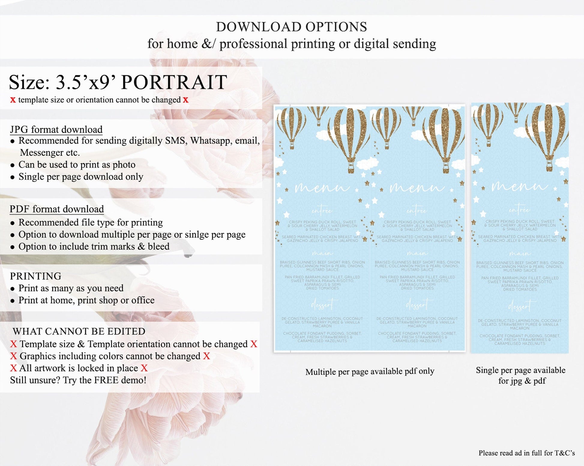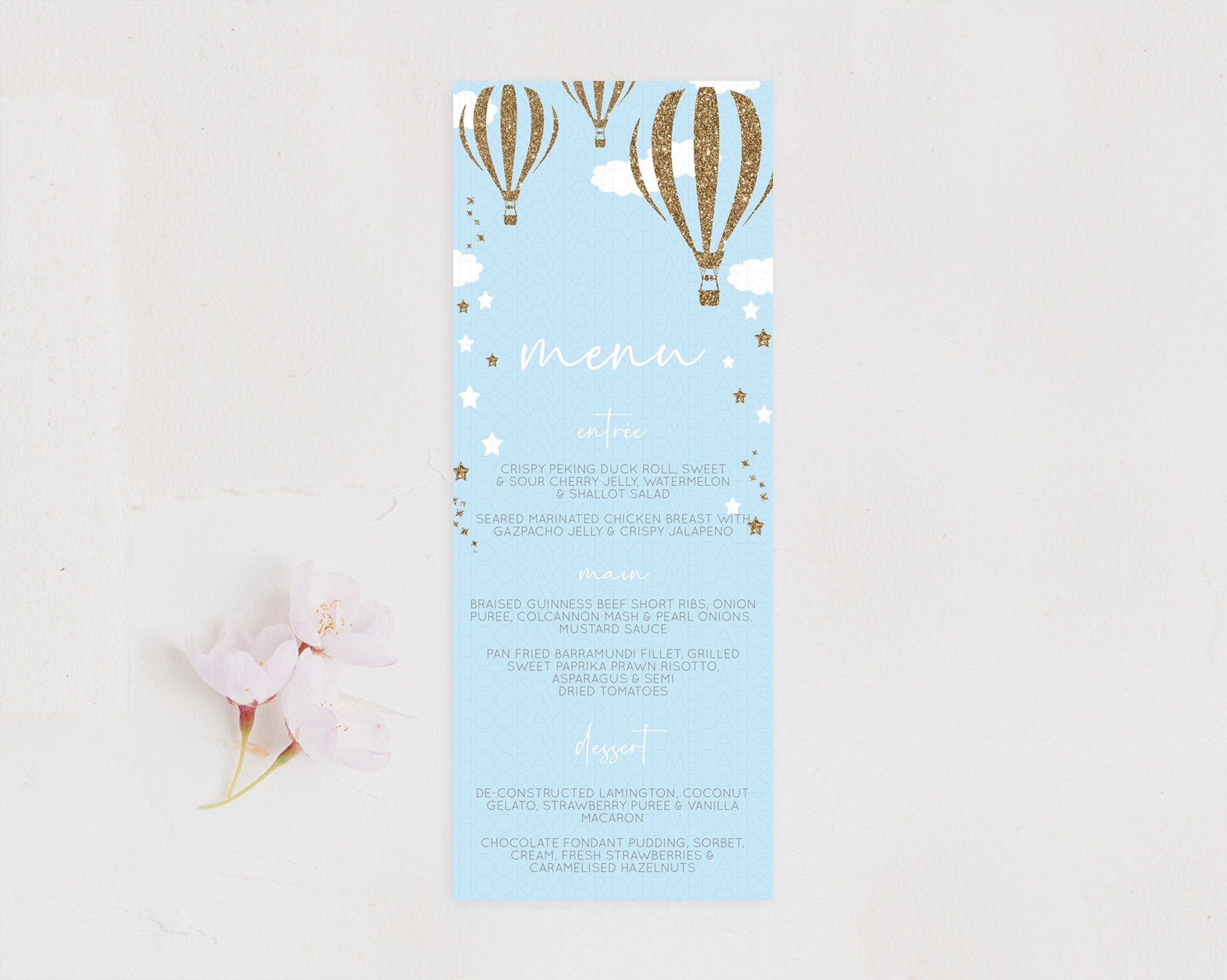 Hot Air Balloon Menu Hot Air Balloon Menu Template Hot Air Balloon Table Decor Adventure Awaits Dinner Dessert Party Food Menu D10332