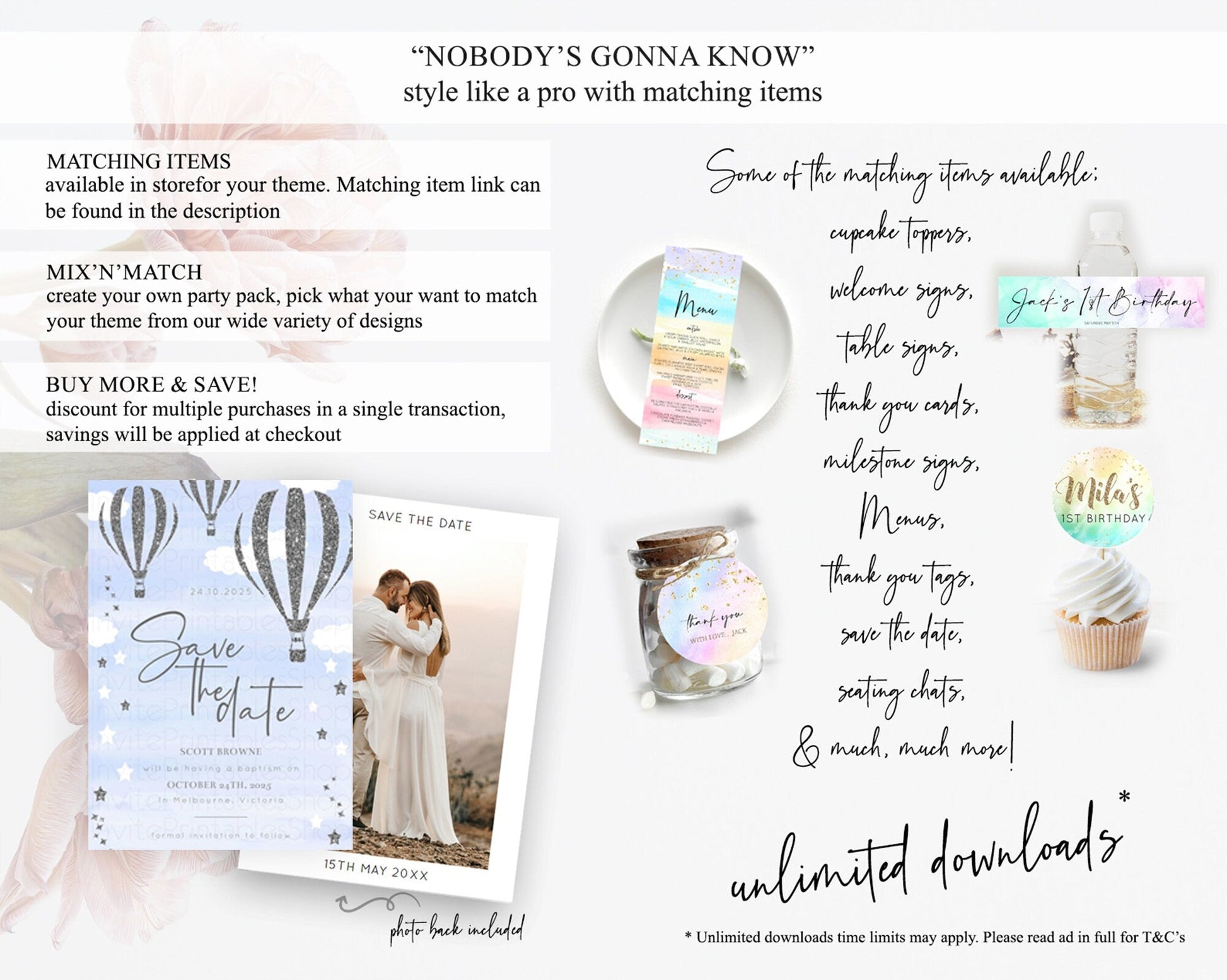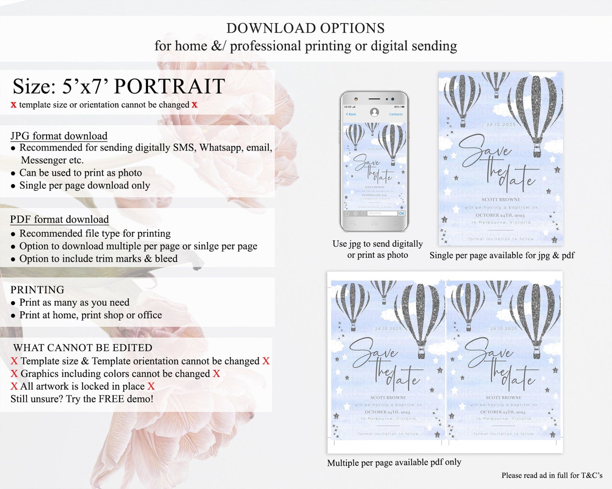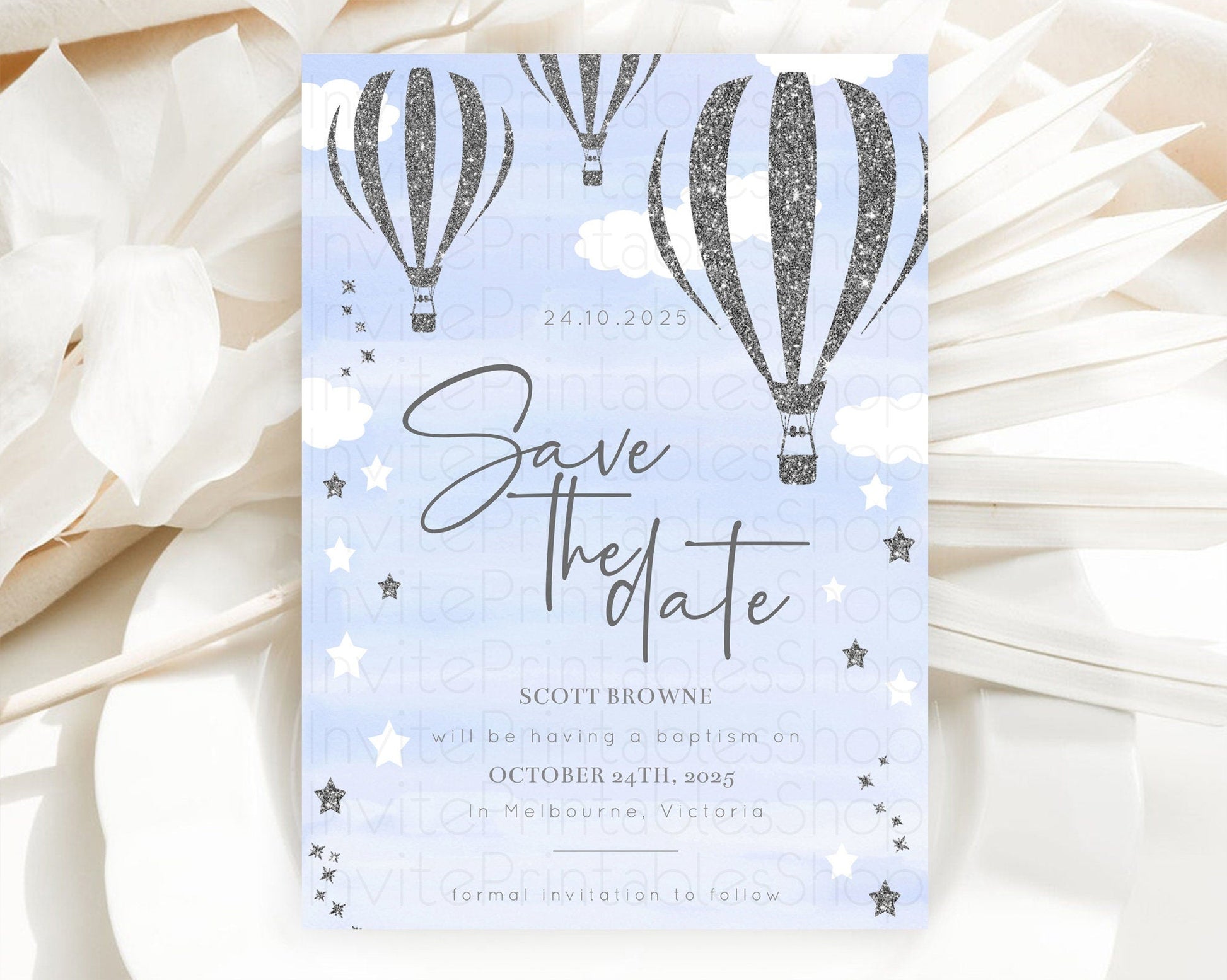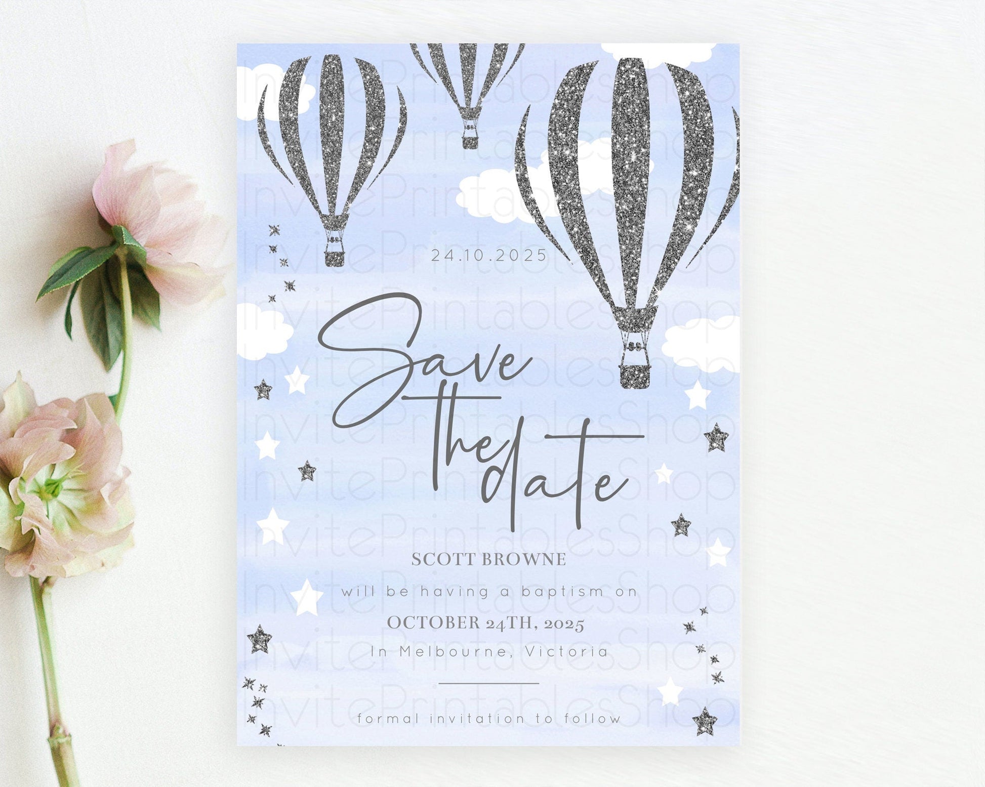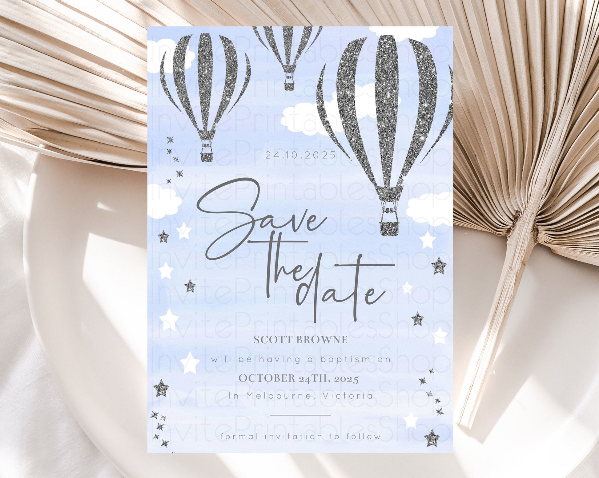 Hot Air Balloon Save The Date Template Adventure Awaits Mr. ONEderful Party 1st Birthday Baptism Baby Shower D10334