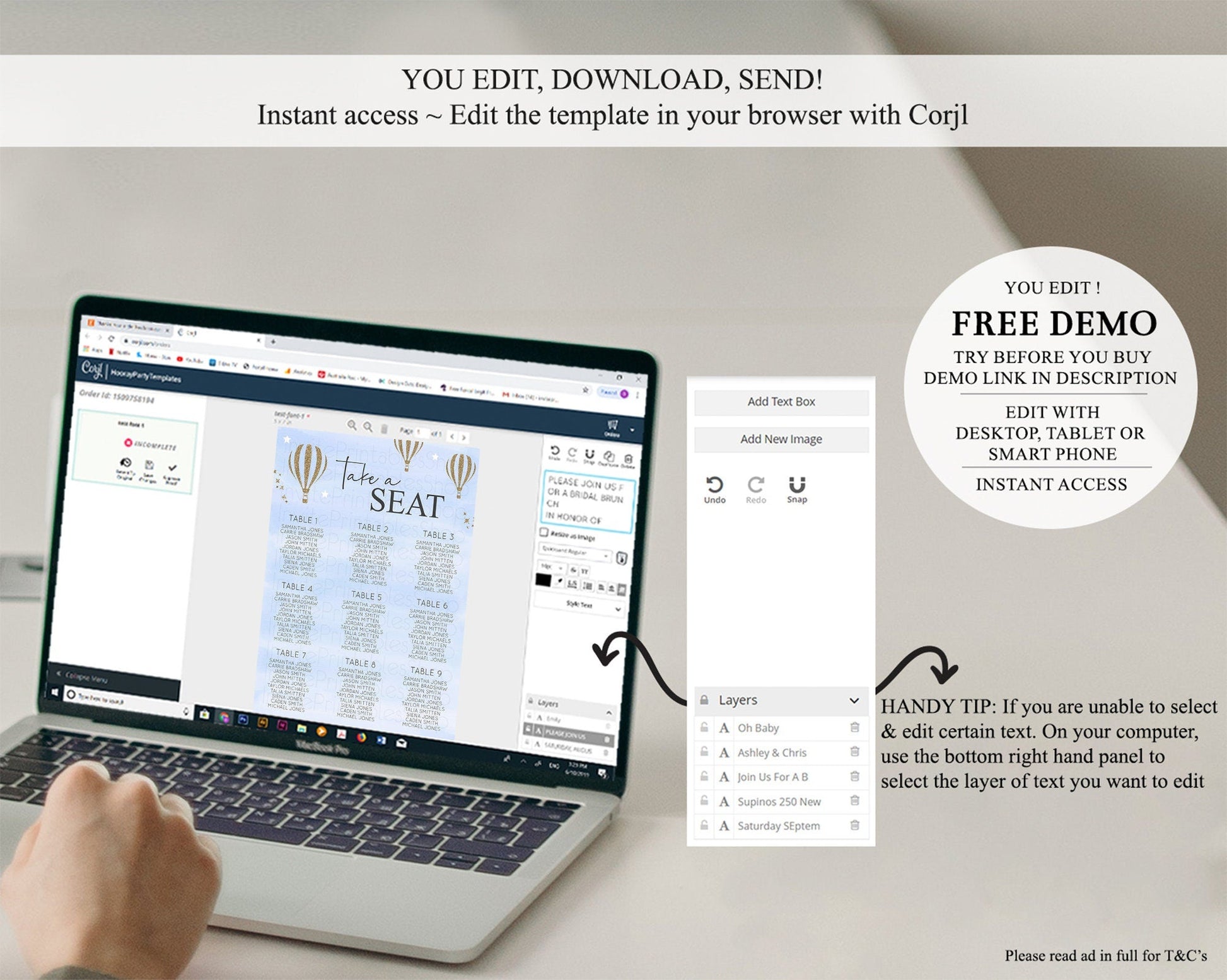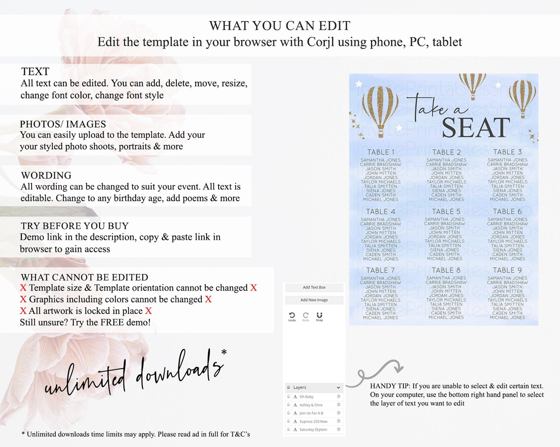 Hot Air Balloon Seating Chart Hot Air Balloon Seating Chart Adventure Awaits Up & Away Glitter Blue Watercolor Seating Take a Seat D10333