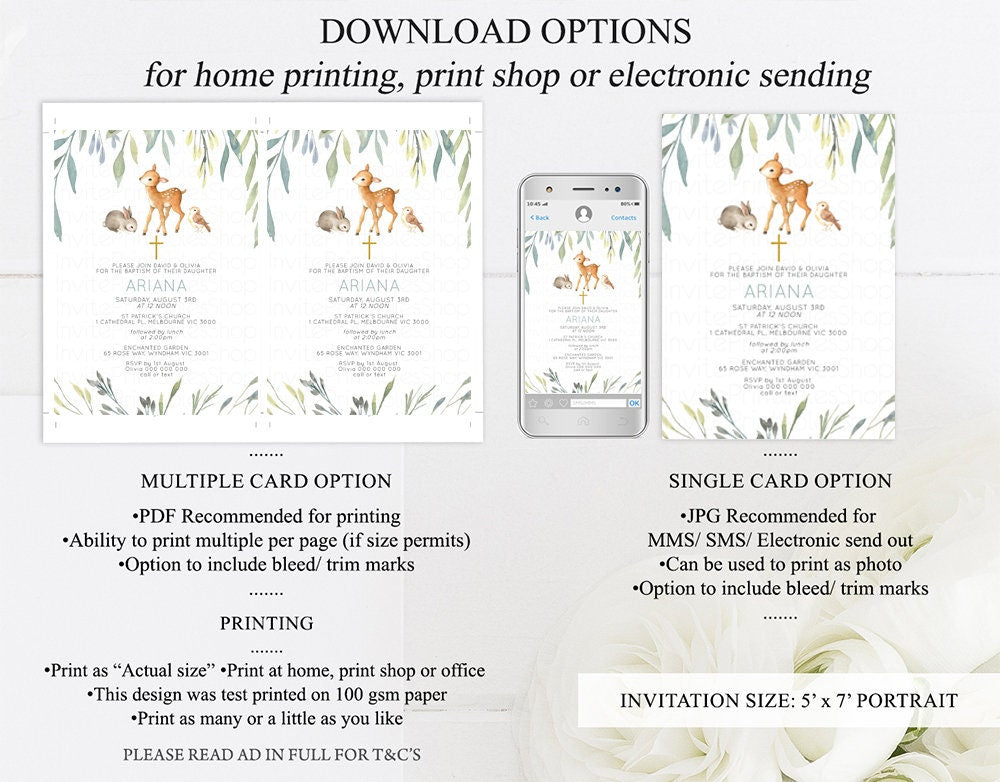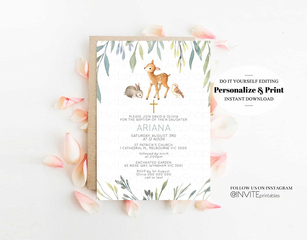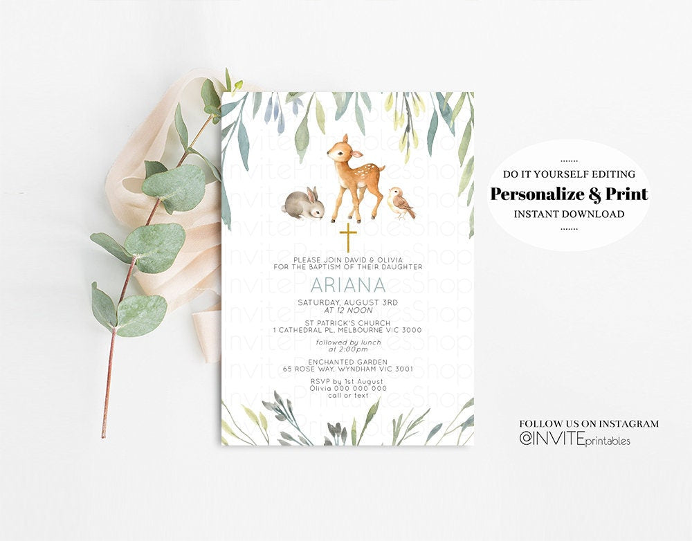 Leaf Deer Baptism Invitation Enchanted Garden Christening Invitation Forest Animals Eucalyptus Leaves Green Soft Pastel Gold Orthodox Cross