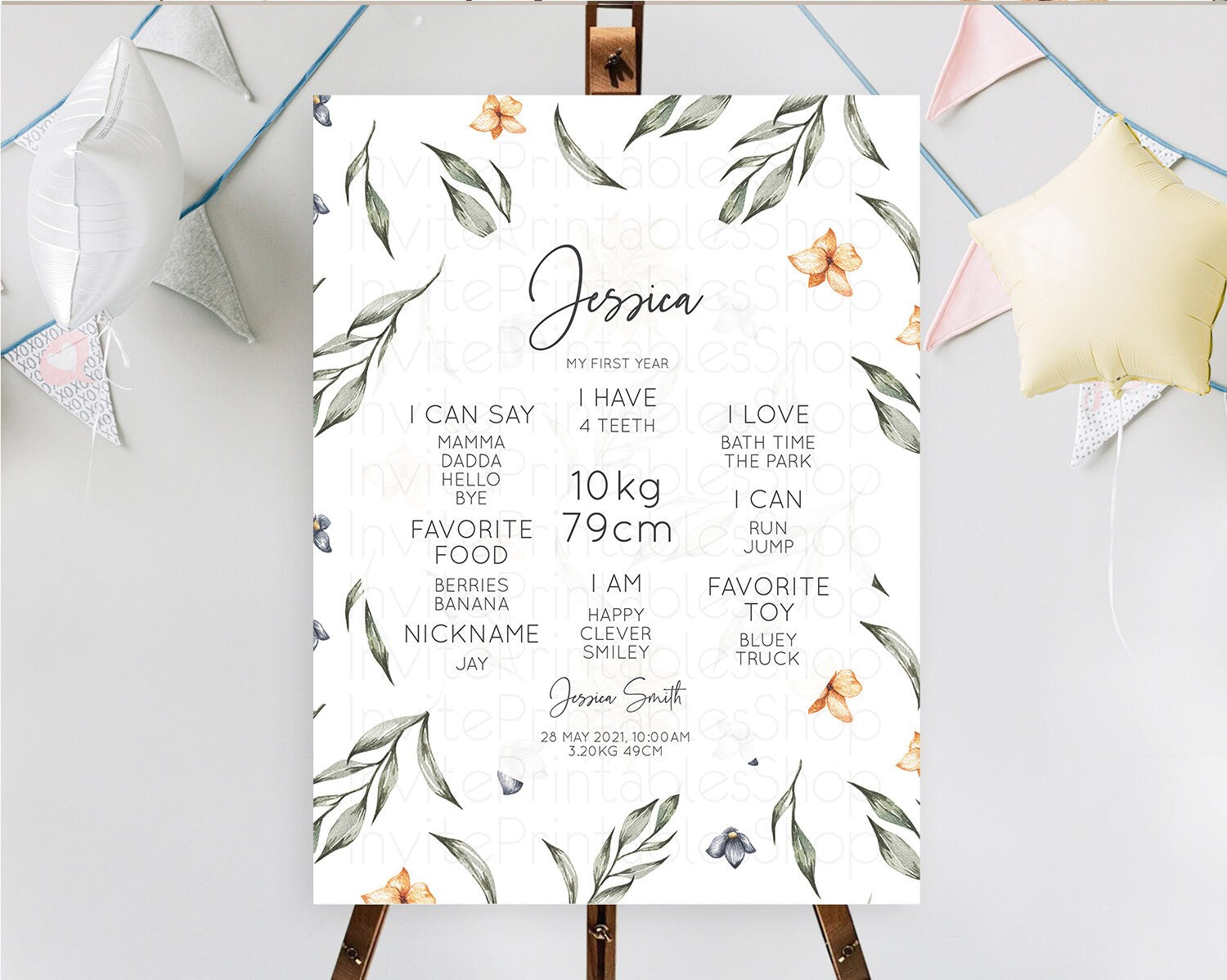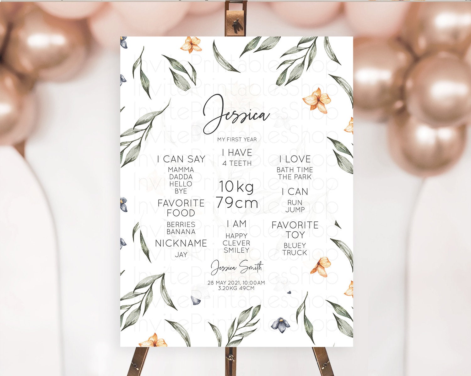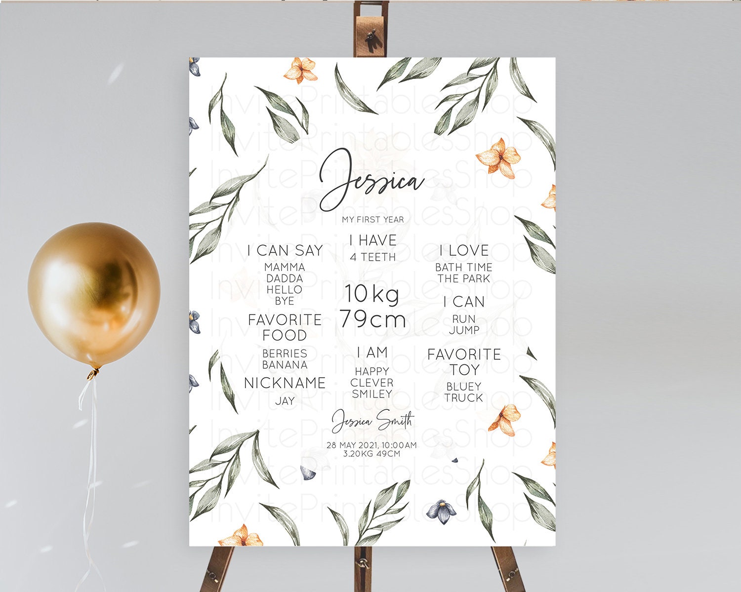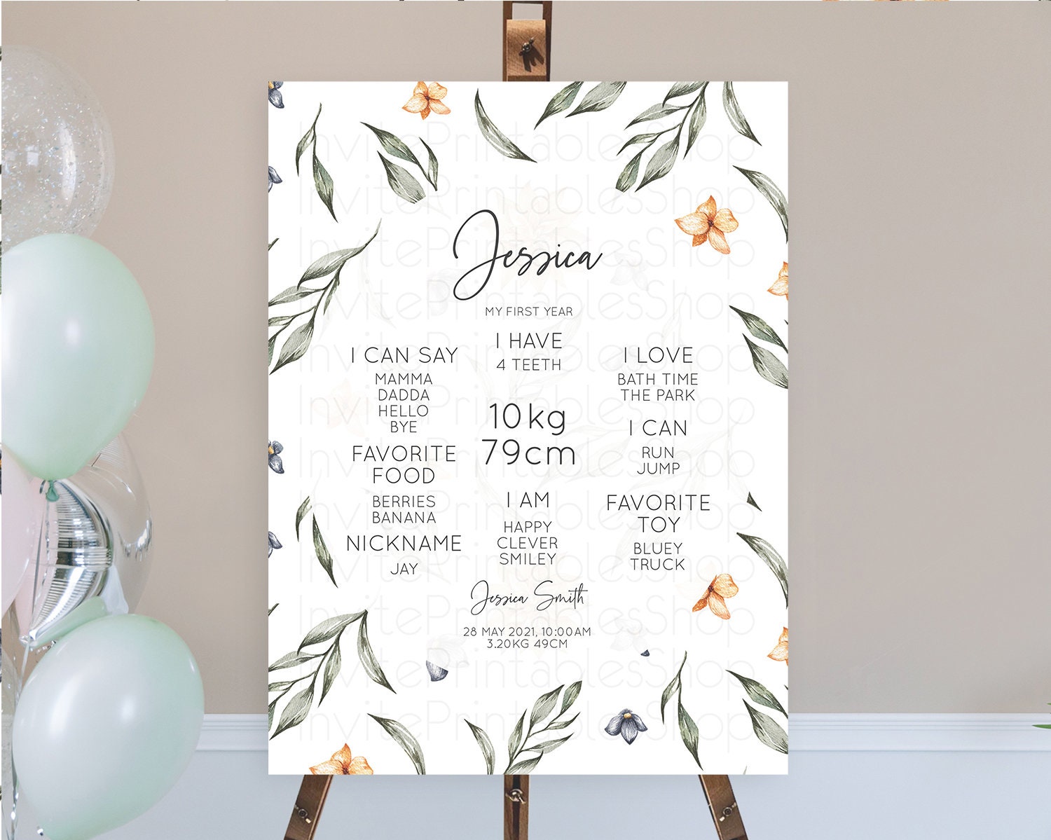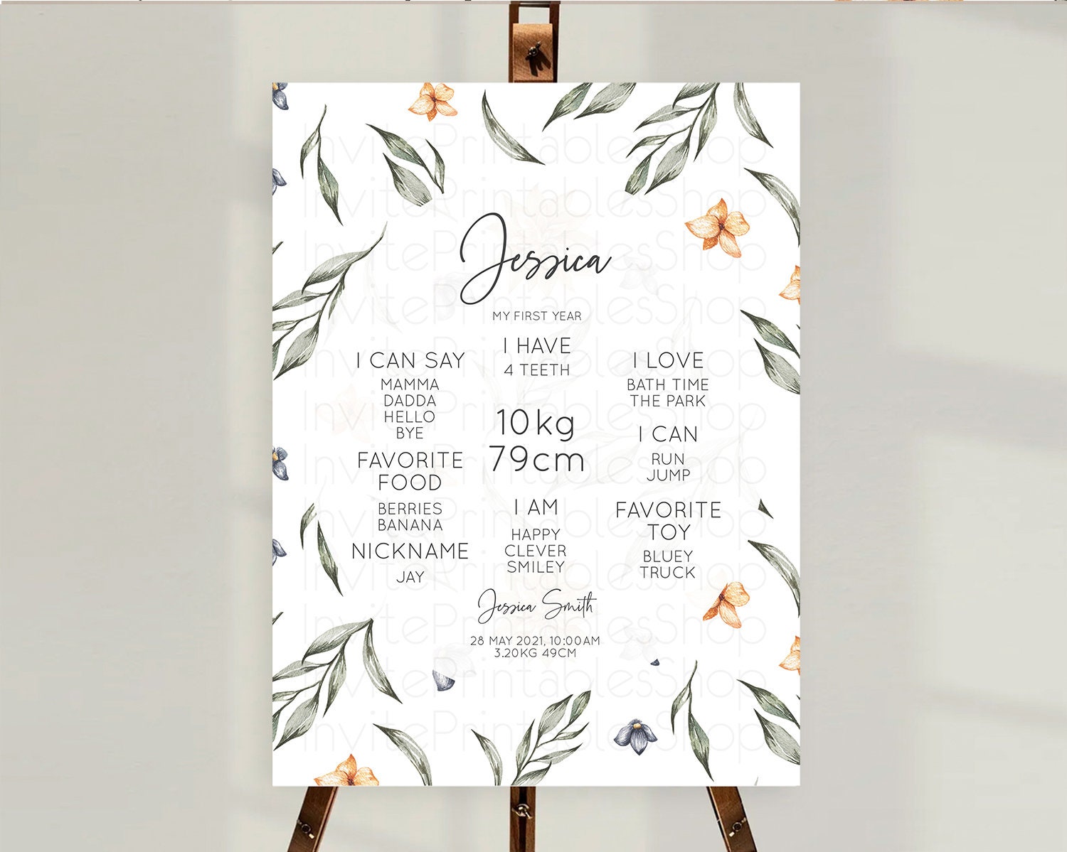 Leafy First Birthday Milestone Board Green Leaf Milestone Poster Greenery Eucalyptus Fern Spray Leaves Watercolor 1st Birthday Sign D10544
