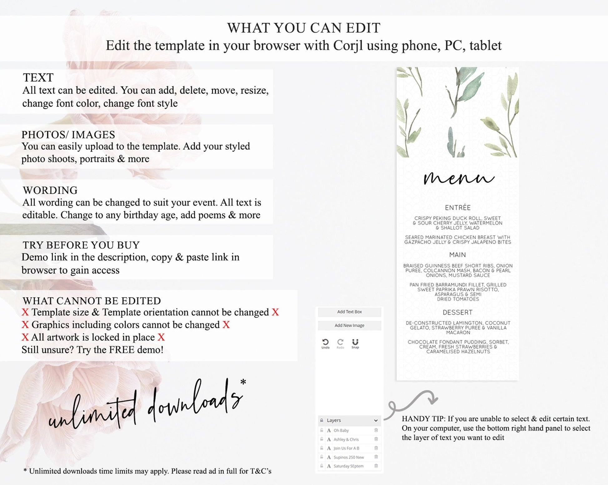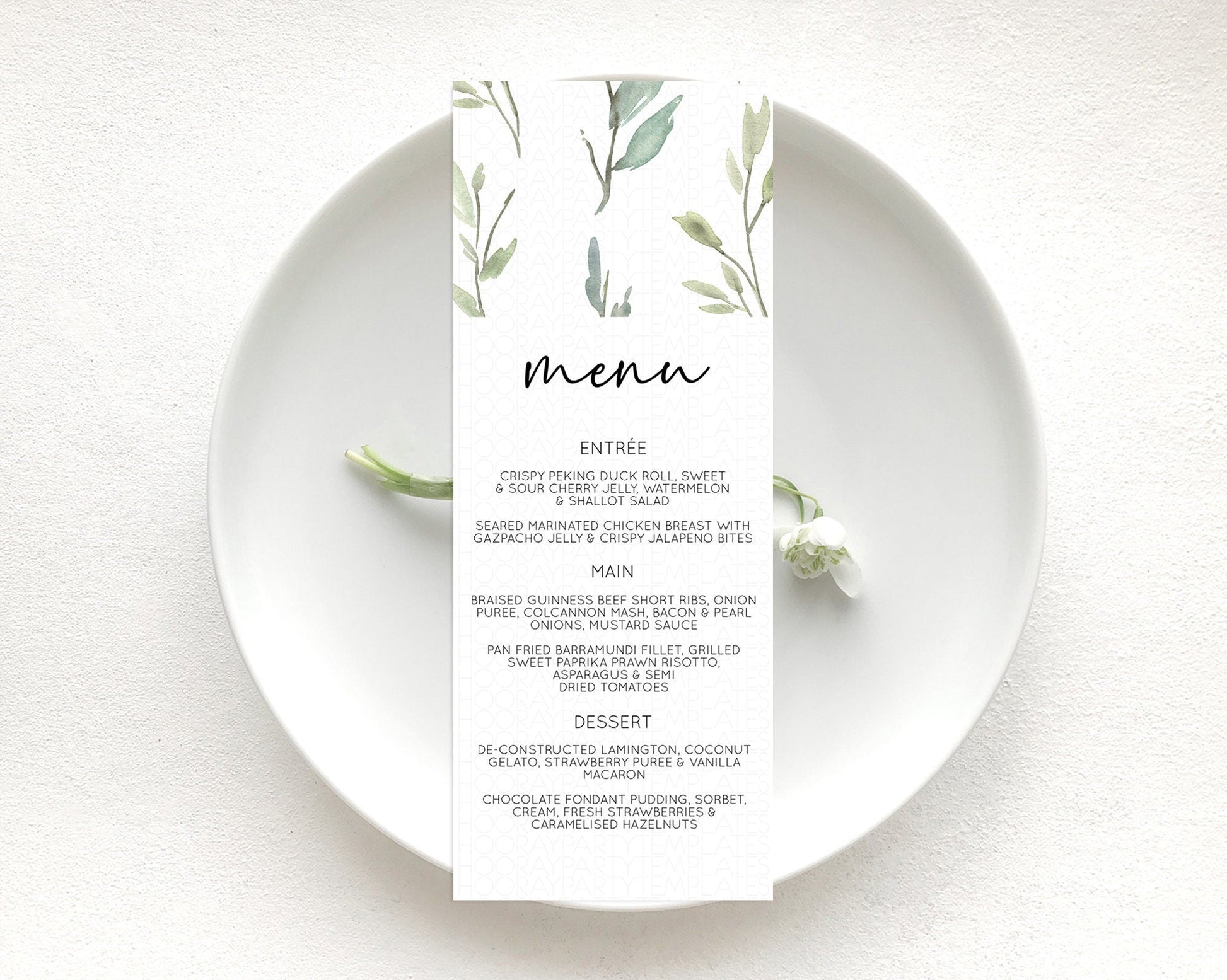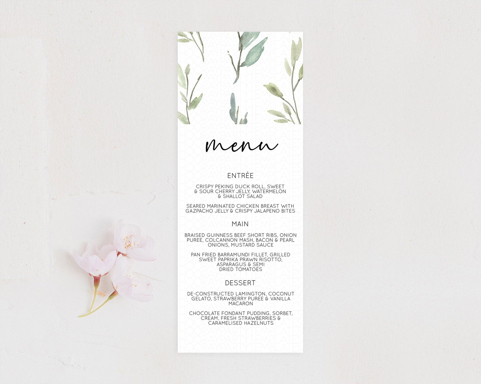 Leafy Menu Green Leaf Menu Template Eucalyptus Fern Leaves Decor Watercolor Boho Garden Leaf Branch Dinner Dessert Party Food Menu D11058
