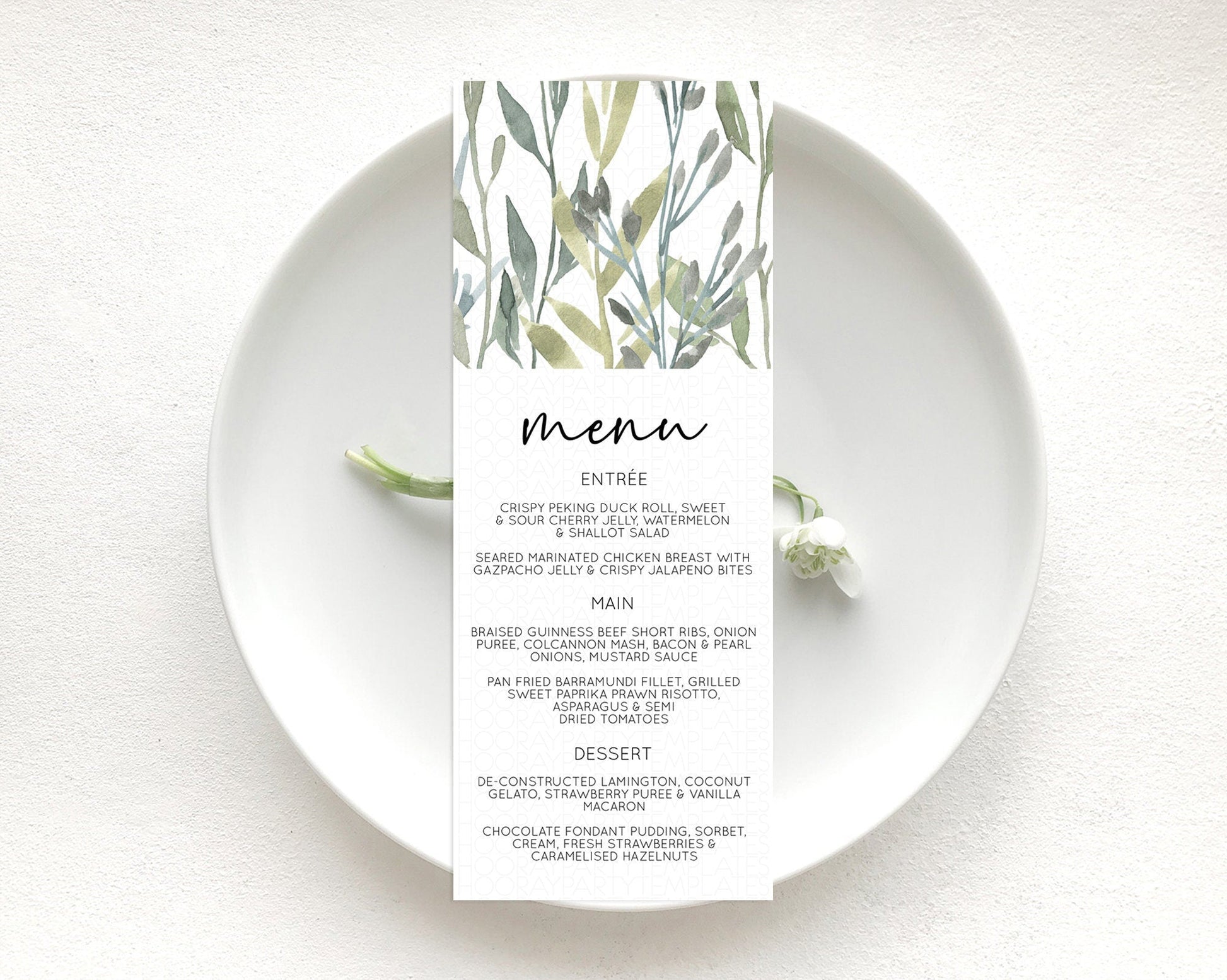 Leafy Menu Green Leaf Menu Template Eucalyptus Fern Leaves Decor Watercolor Boho Garden Leaf Branch Dinner Dessert Party Food Menu D11060