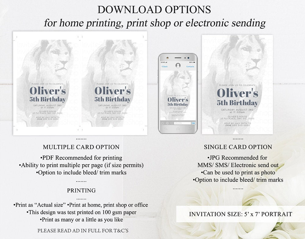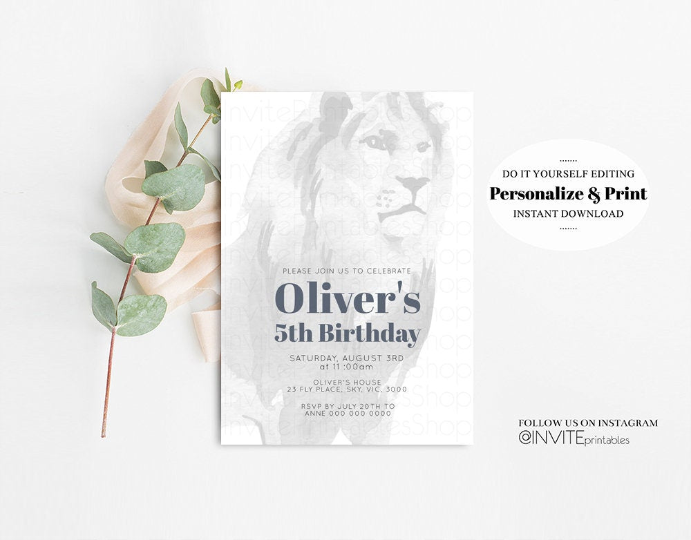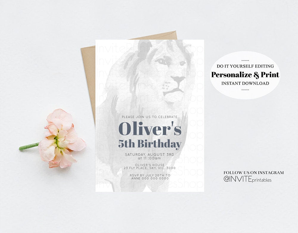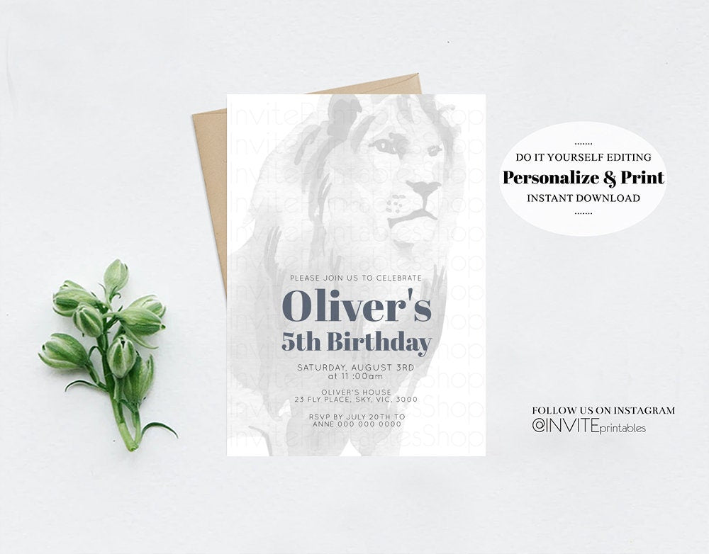 Lion Birthday Invitation Watercolor Lion Invite Tropical Palms Jungle Safari Adventure Zoo Party Wild Party Animal Custom Editable