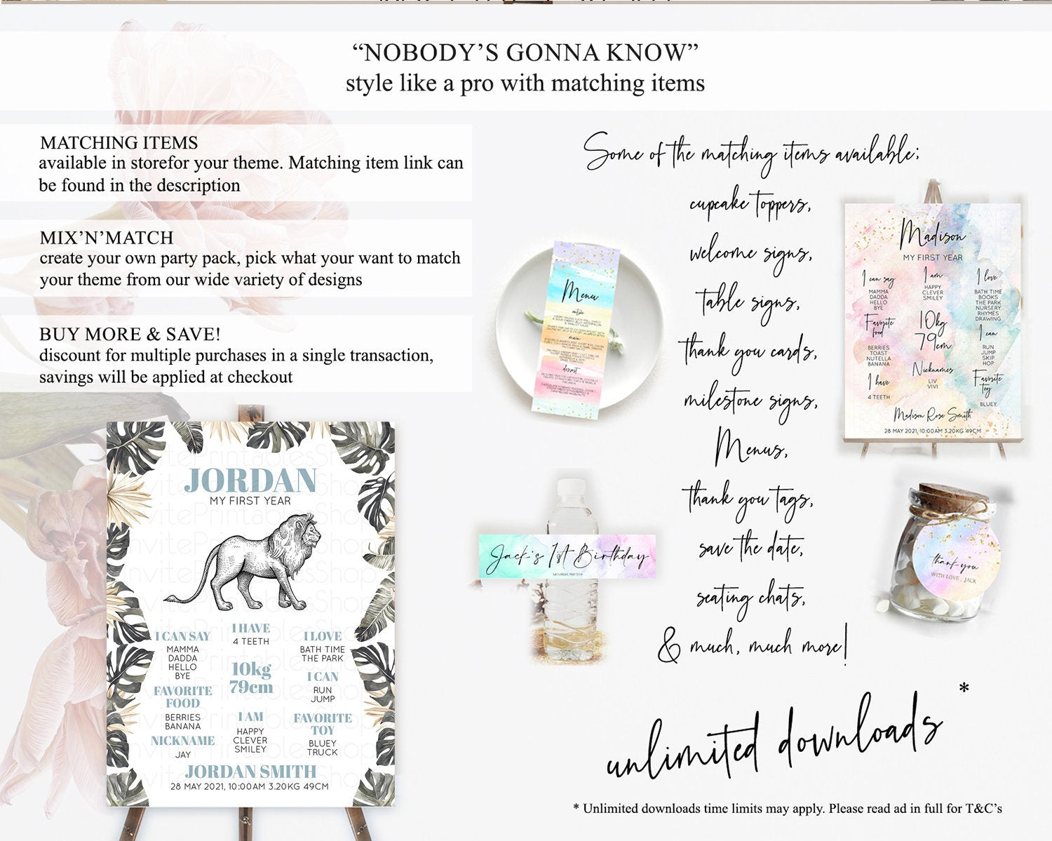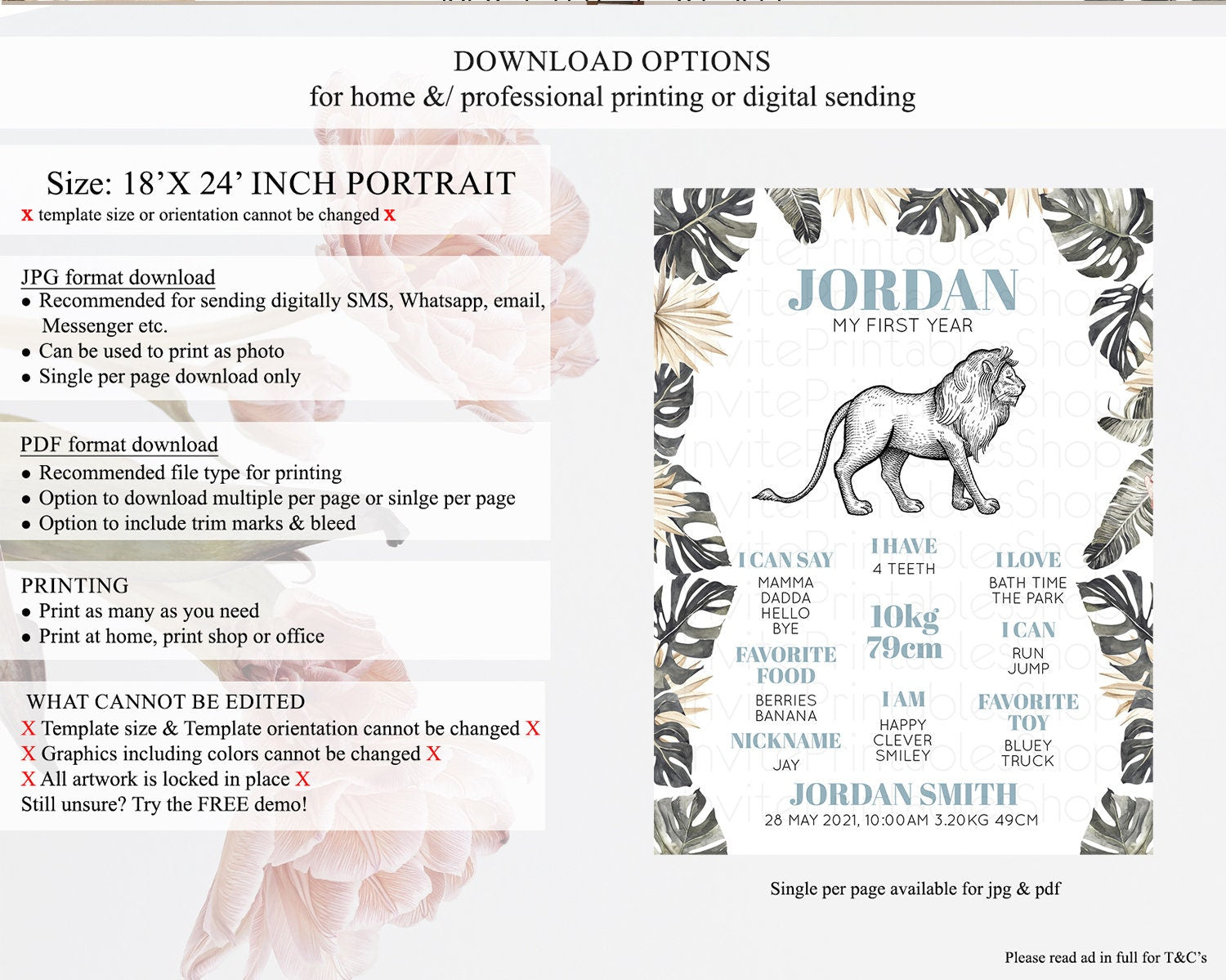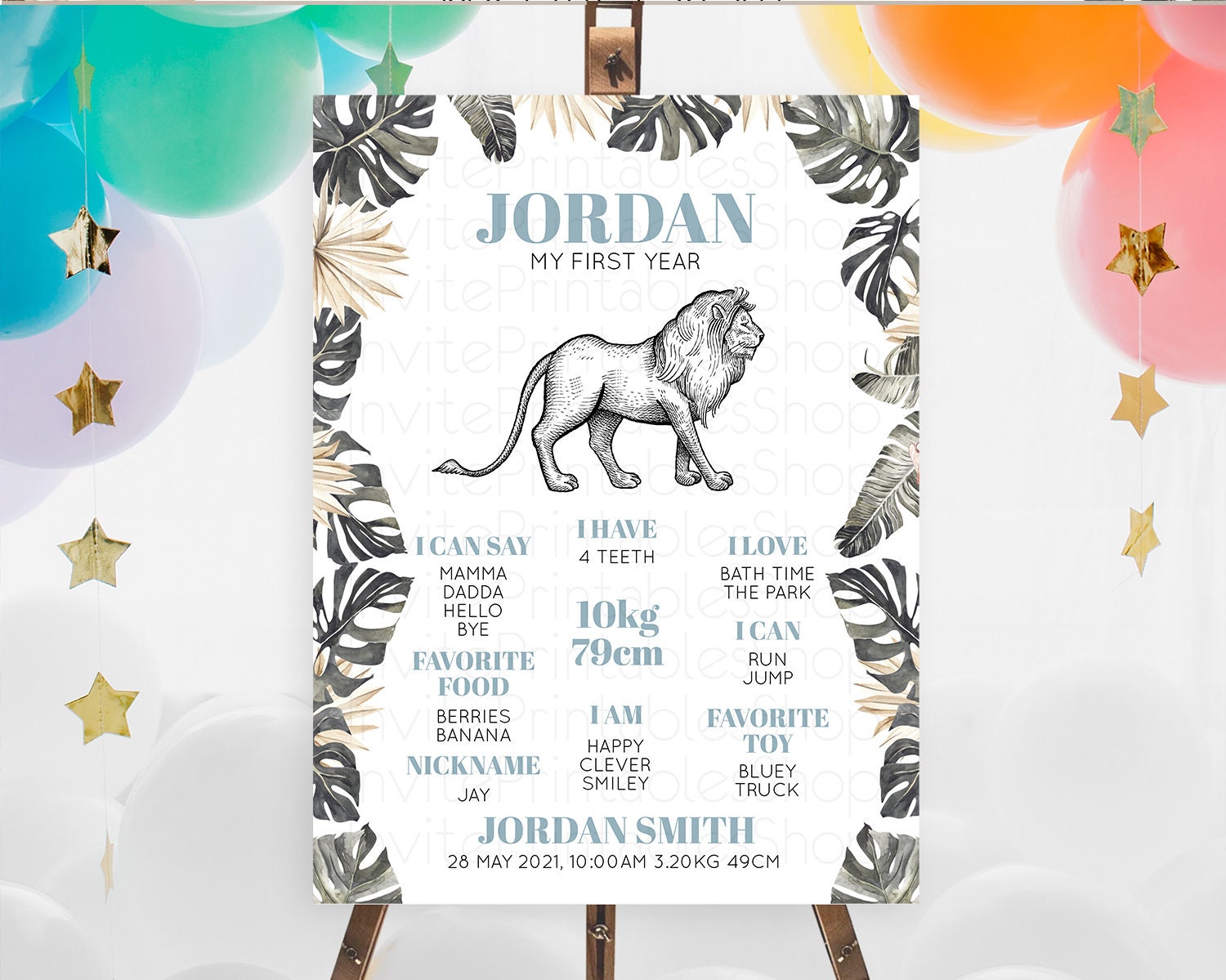 Lion First Birthday Milestone Board Lion Milestone Poster Lion Decor Safari Adventure Palm Leaf Lion First Birthday Welcome Sign D10807
