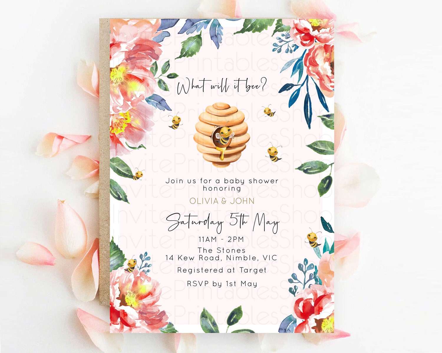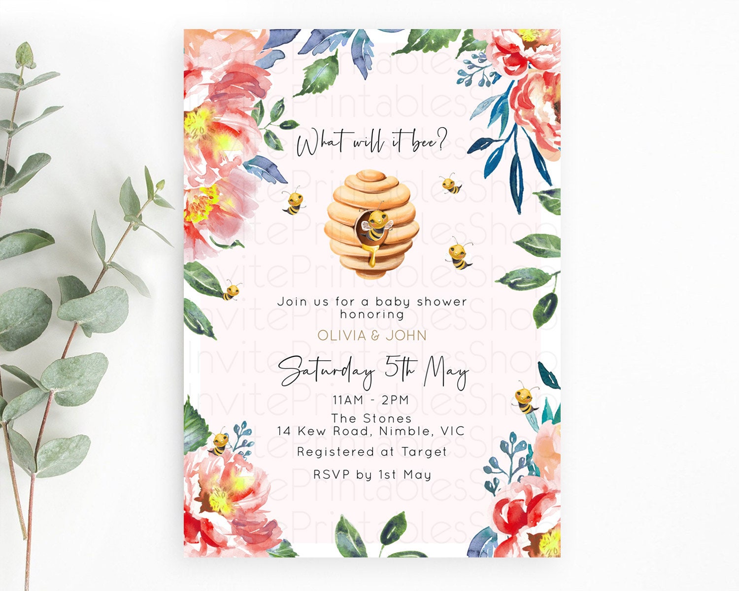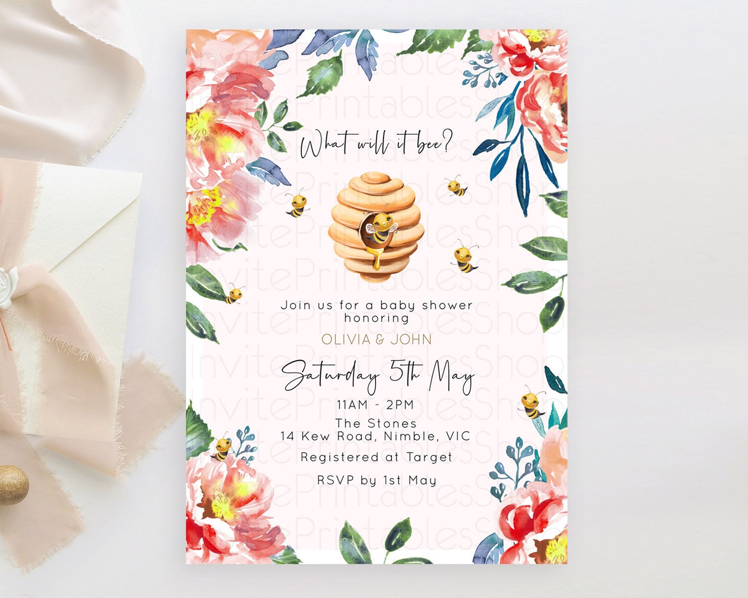 Momma Bee Baby Shower Invitation, Sweet Honey Bee, Floral Beehive, Red and Orange Flowers - Summery Yellow Bee Theme Gender Reveal D11036