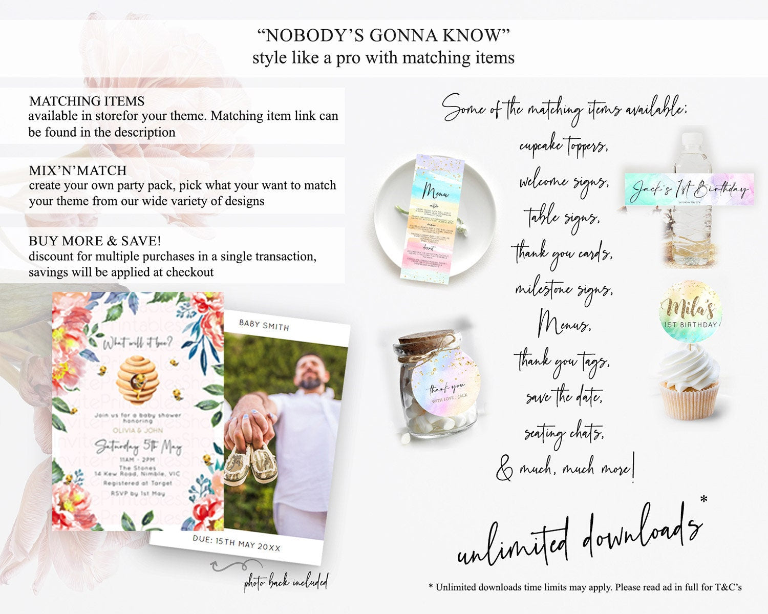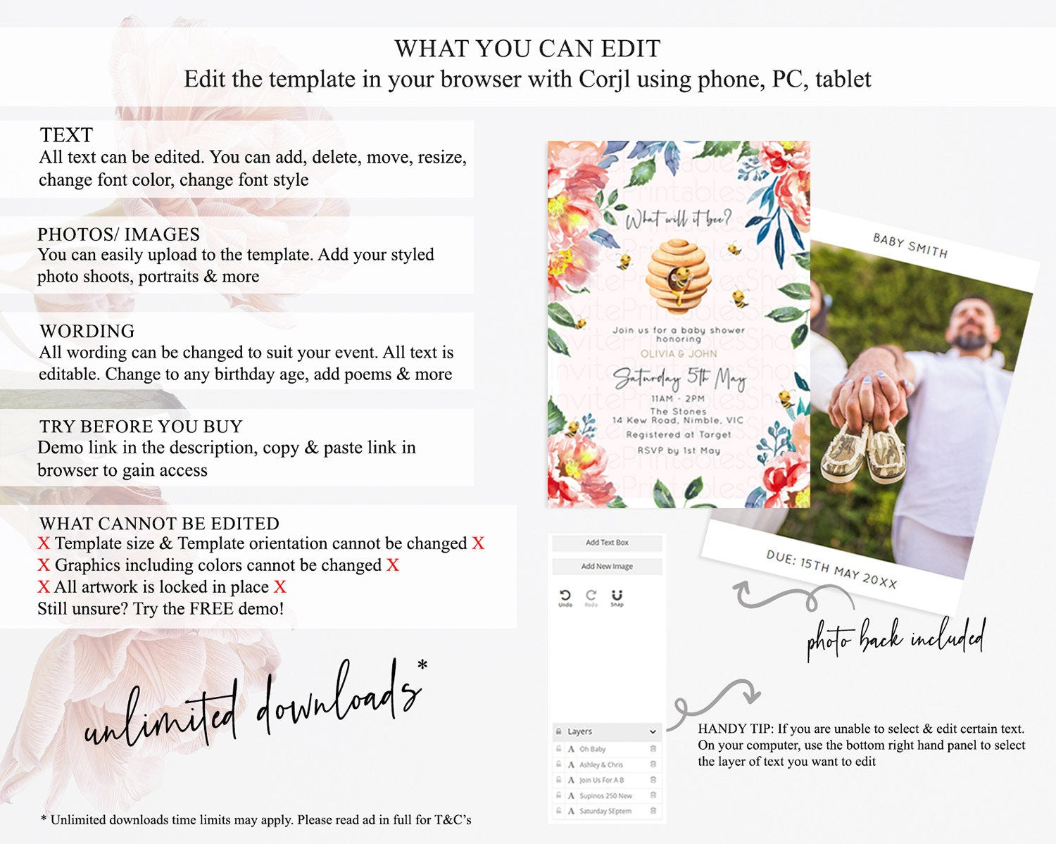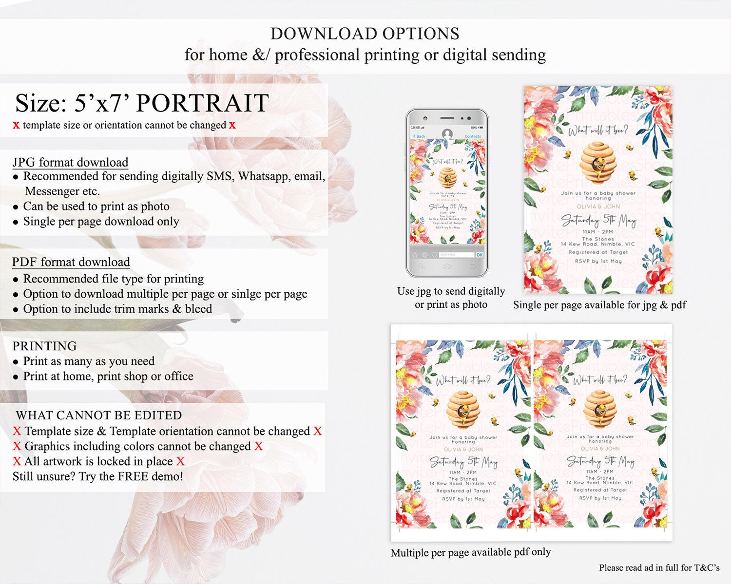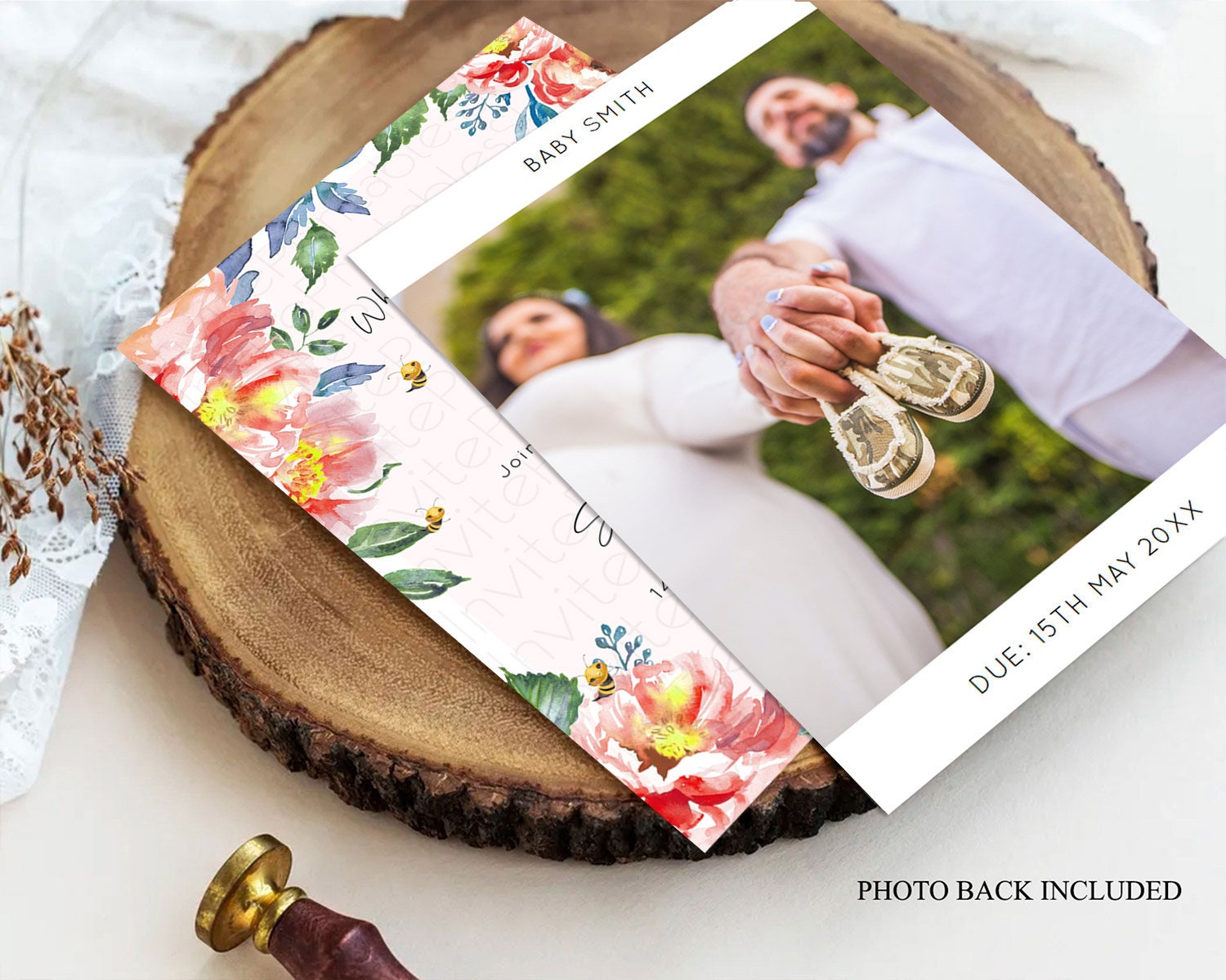 Momma Bee Baby Shower Invitation, Sweet Honey Bee, Floral Beehive, Red and Orange Flowers - Summery Yellow Bee Theme Gender Reveal D11036