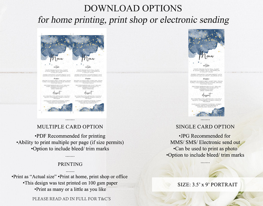 Navy Gold Menu Navy Splash Table Menu Blue Watercolor Plate Table Decor Wedding Menu Birthday Menu Bridal Shower Menu Baby Shower Menu 358