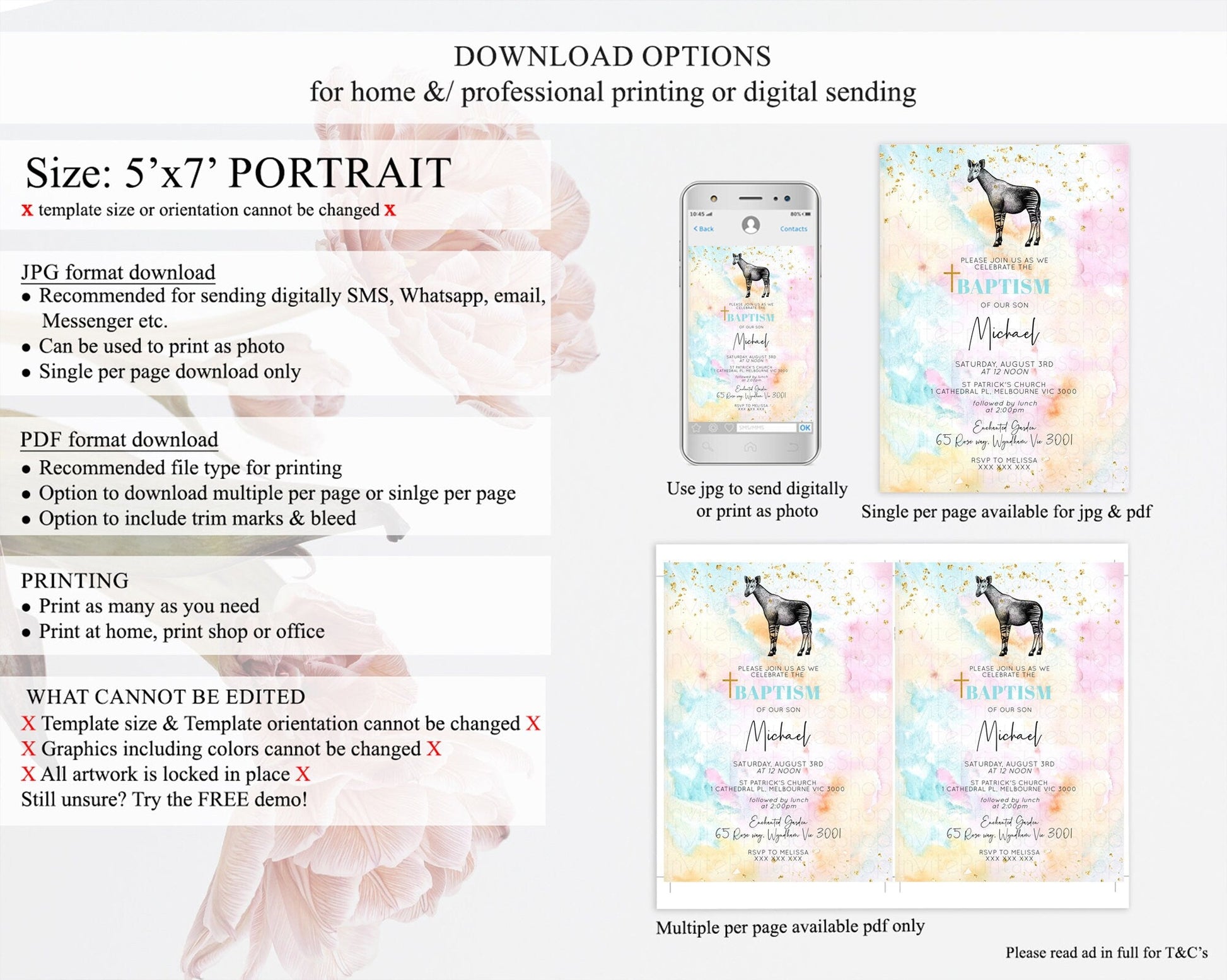 Okapi Baptism Invitation Okapi Baptism 1st Birthday Invitation Okapi Pastel Rainbow Watercolor Christening Invitation Holy Communion D10282