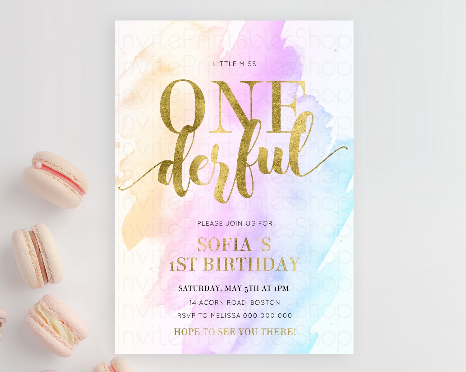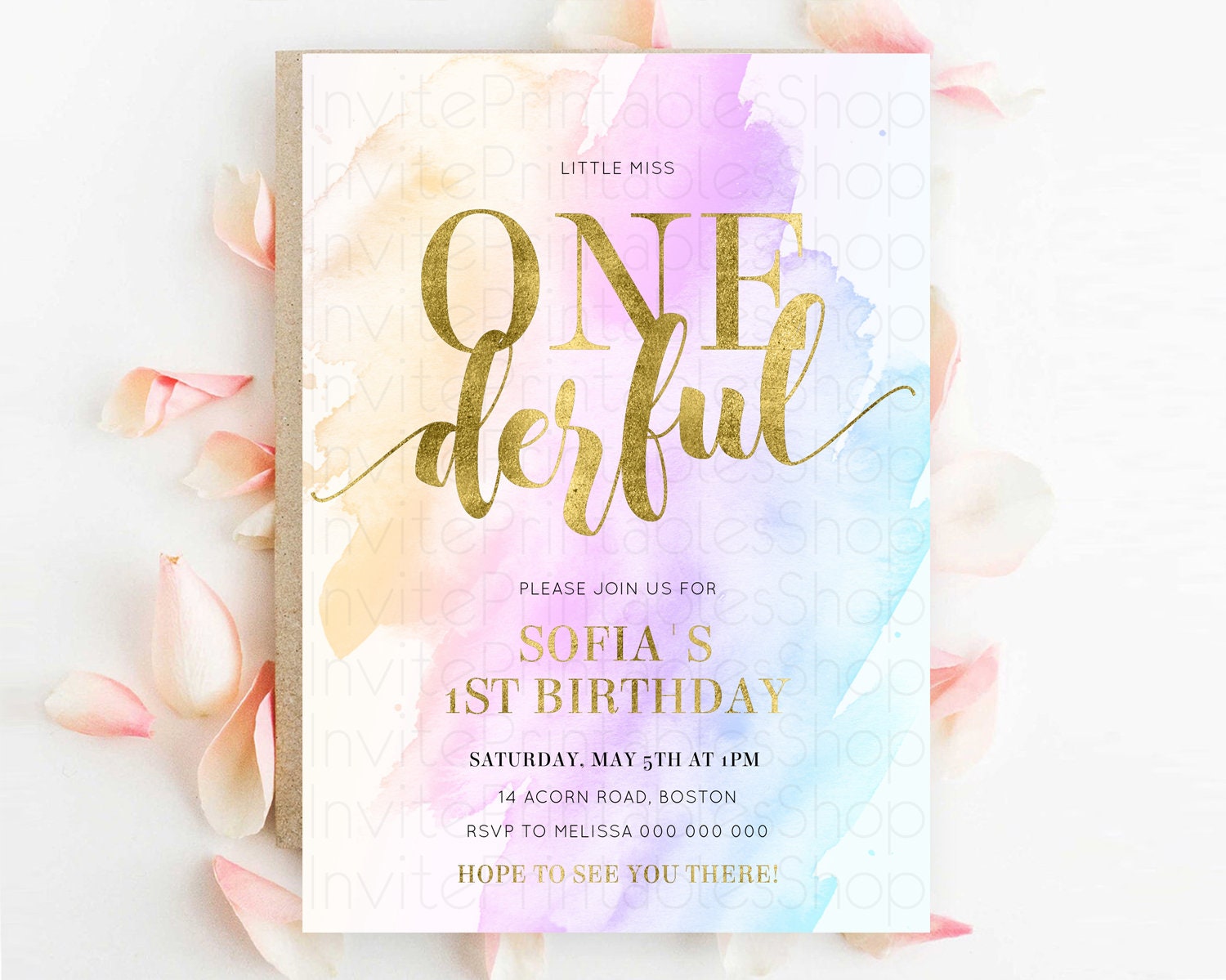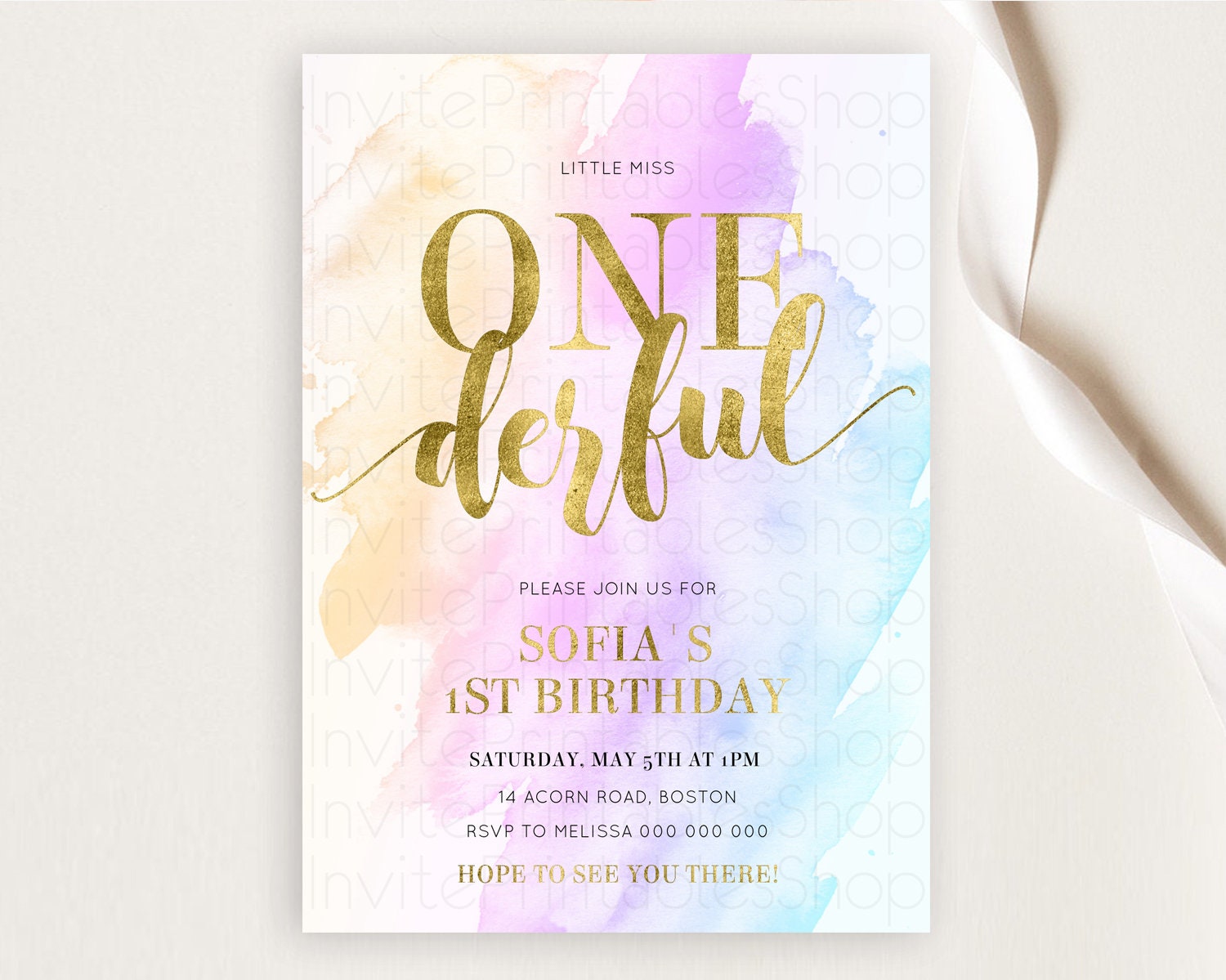 ONEderful Rainbow Birthday Invitation Colorful Pastel Watercolor Invitation Gold Glitter Sprinkles Ombre Pastel 1st Birthday D11027