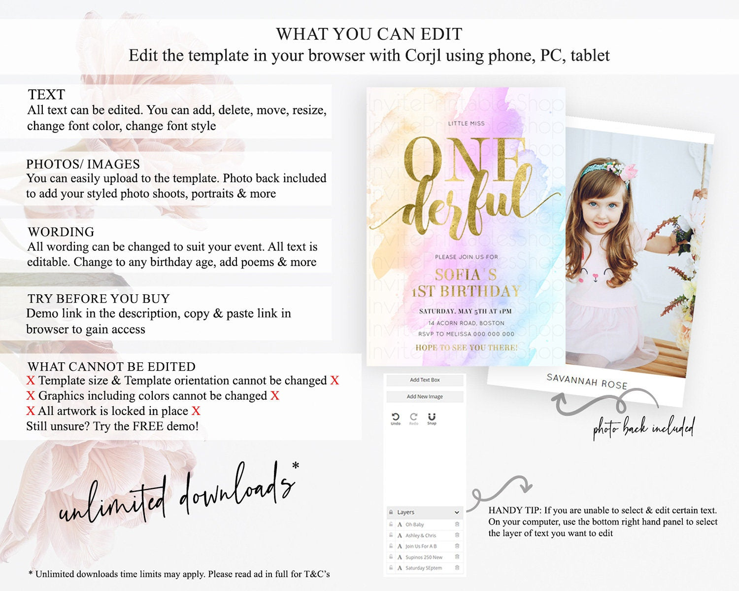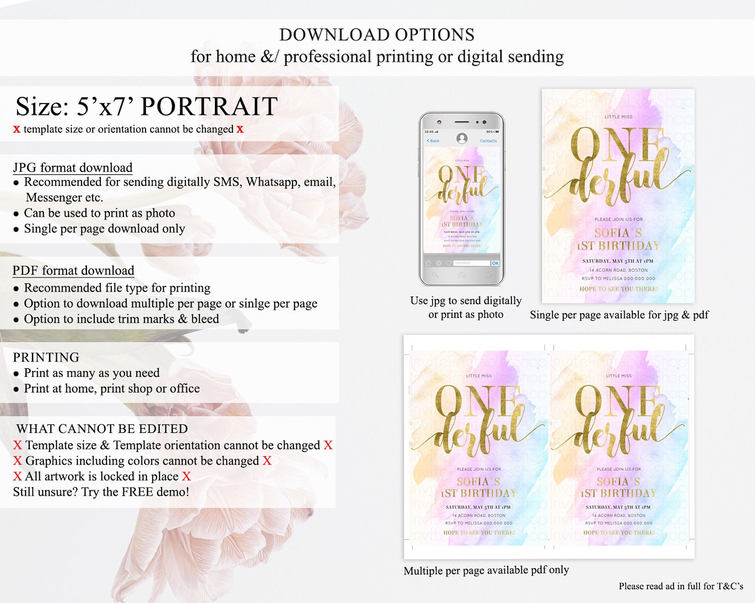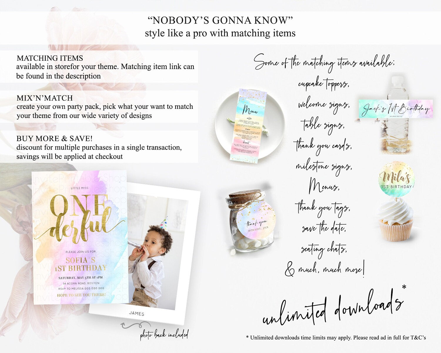 ONEderful Rainbow Birthday Invitation Colorful Pastel Watercolor Invitation Gold Glitter Sprinkles Ombre Pastel 1st Birthday D11027