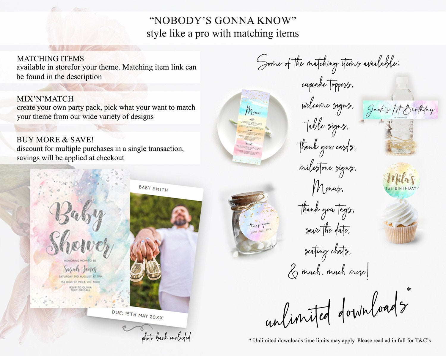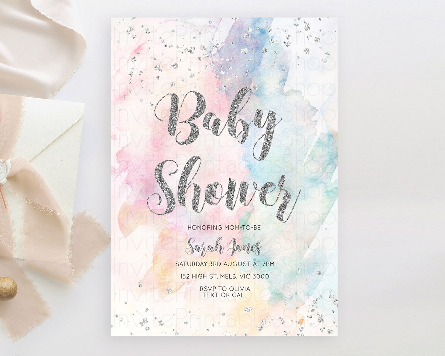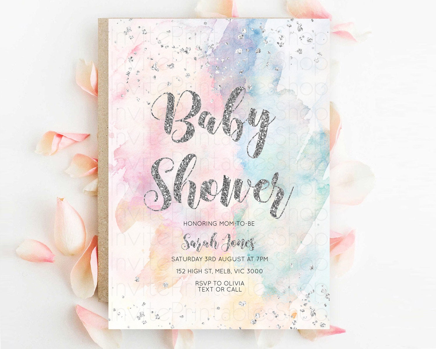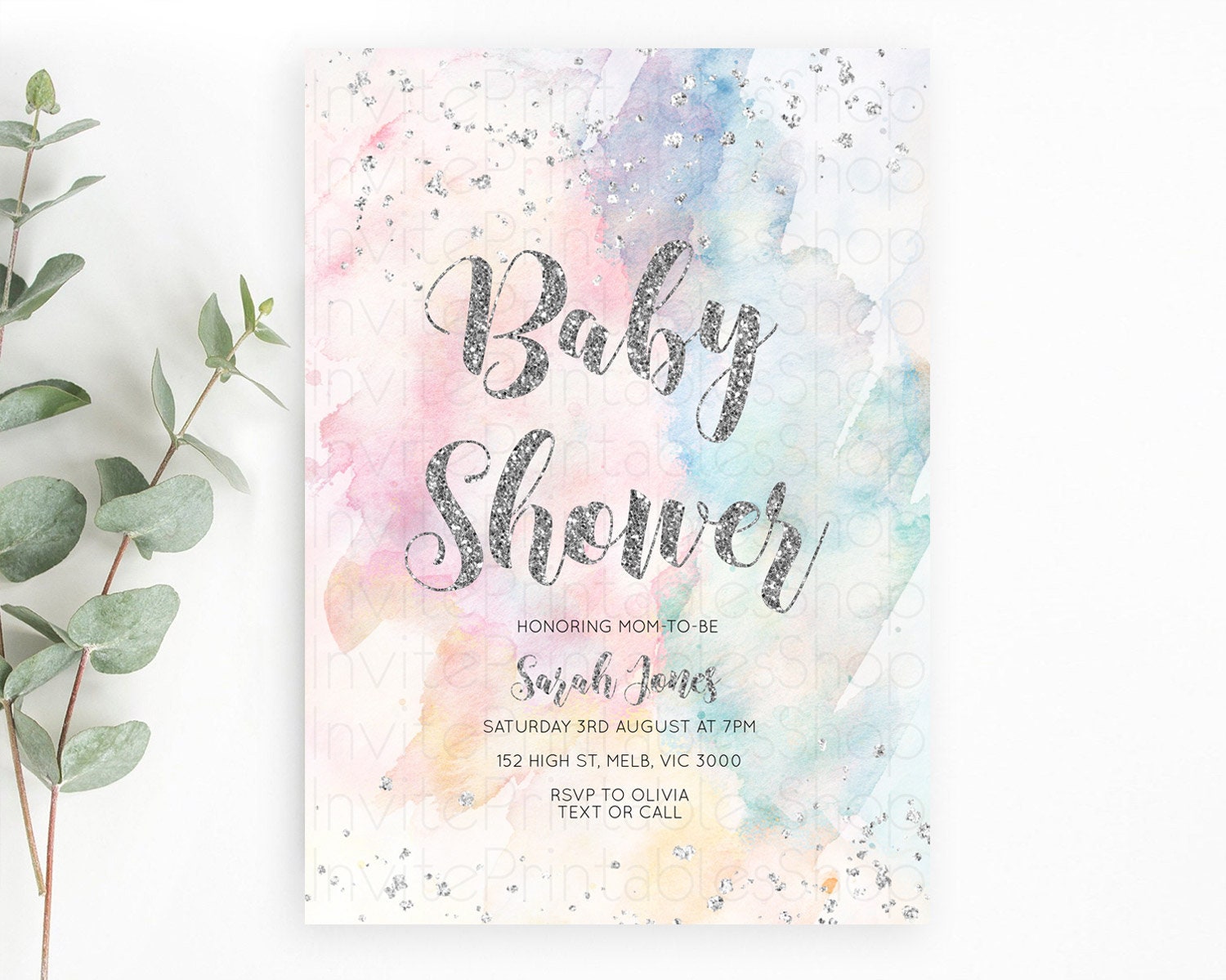 Pastel Baby Shower Invitation Pastel Rainbow Baby Invitation Pastel Watercolor Invitation Colorful Ombre Silver Glitter Sprinkle D10944