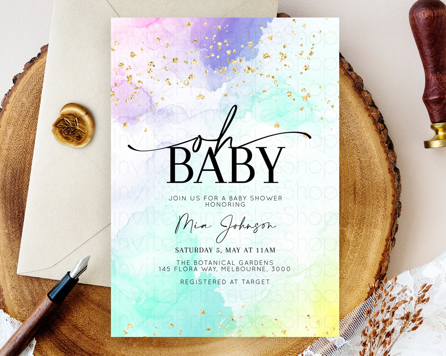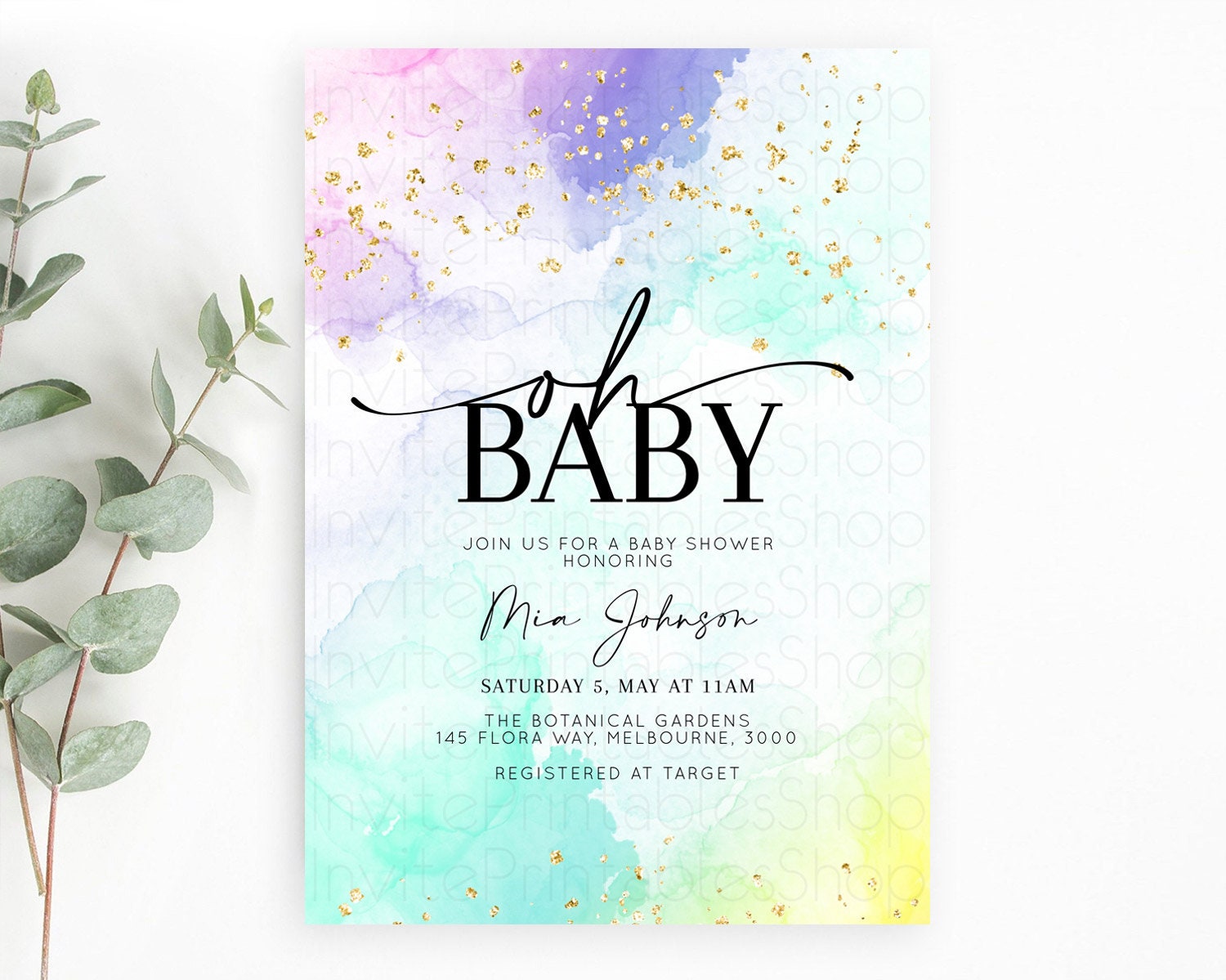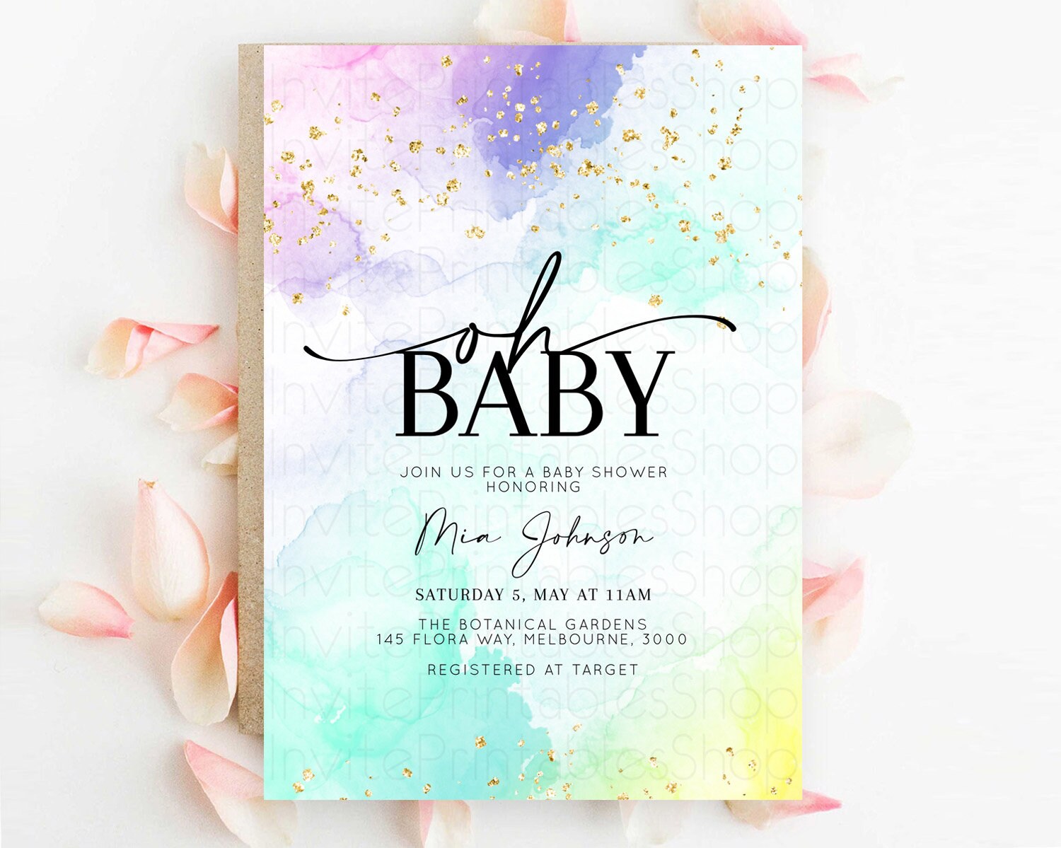 Pastel Baby Shower Invitation Rainbow Baby Shower Invitation Colorful Pastel Watercolor Invitation Gold Glitter Sprinkles Ombre D10157