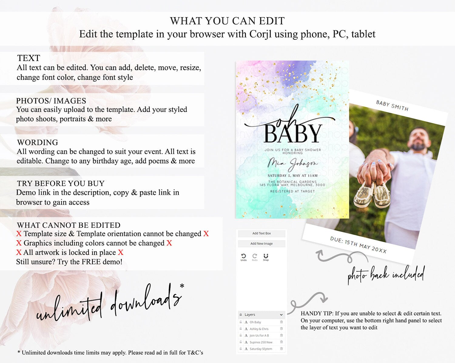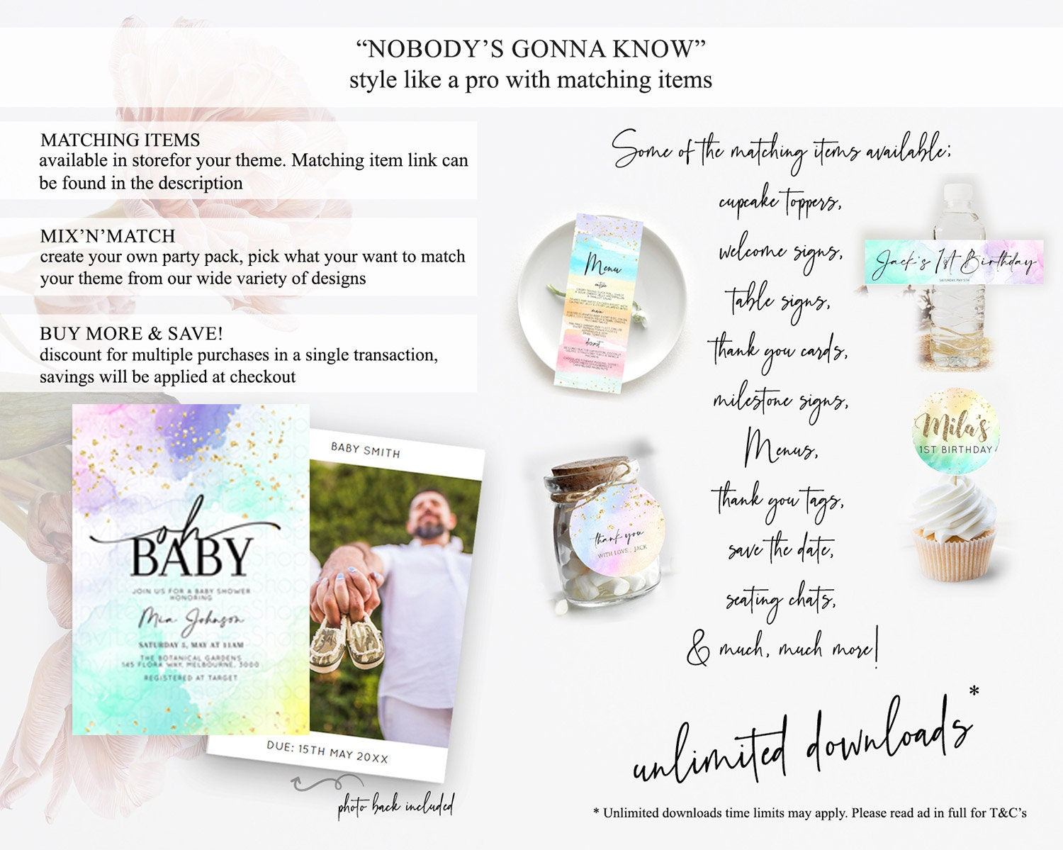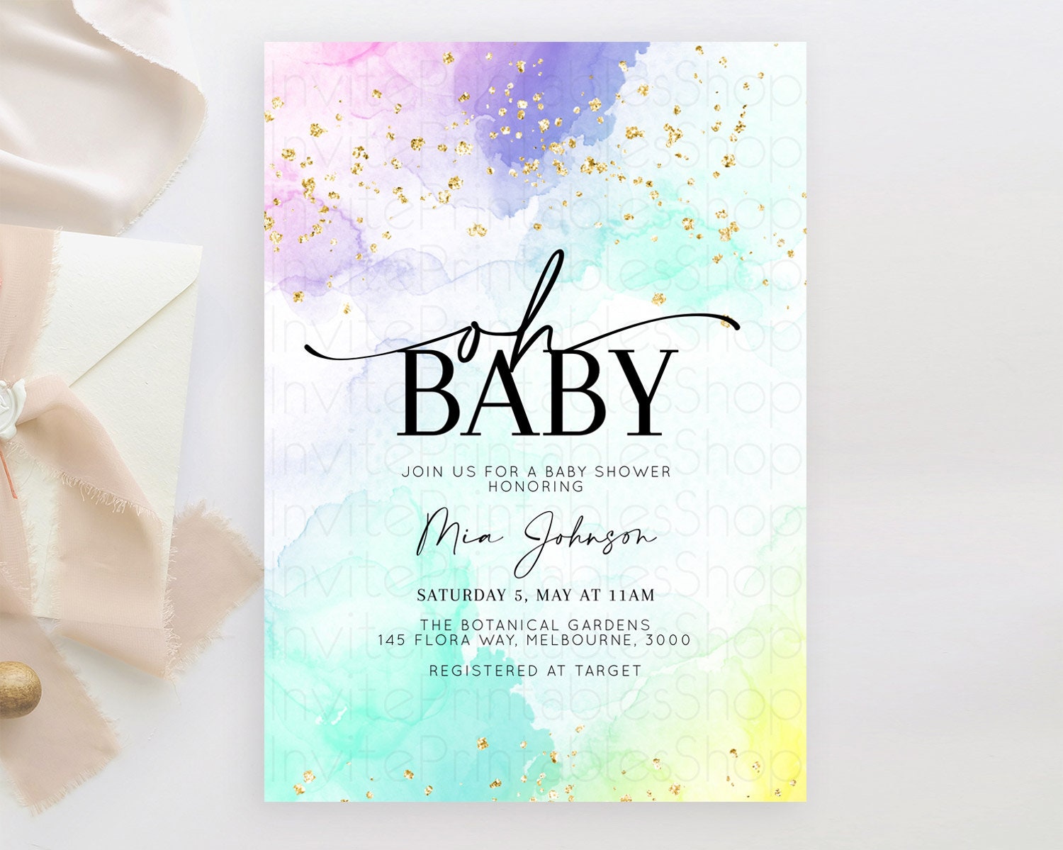 Pastel Baby Shower Invitation Rainbow Baby Shower Invitation Colorful Pastel Watercolor Invitation Gold Glitter Sprinkles Ombre D10157