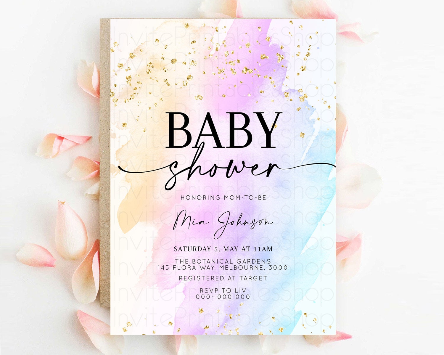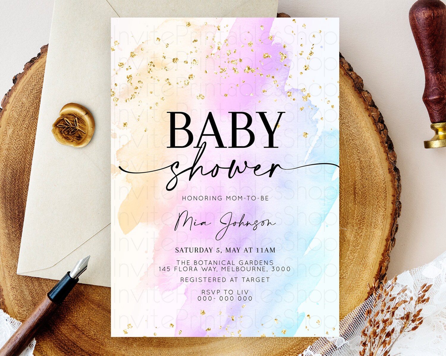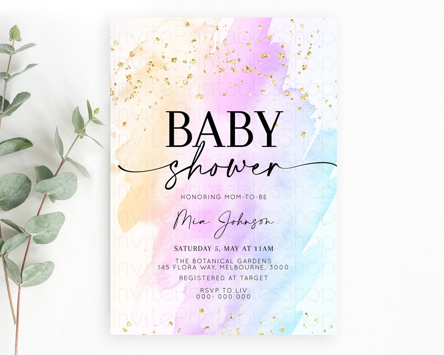 Pastel Baby Shower Invitation Rainbow Baby Shower Invitation Colorful Pastel Watercolor Invitation Gold Glitter Sprinkles Ombre D10175