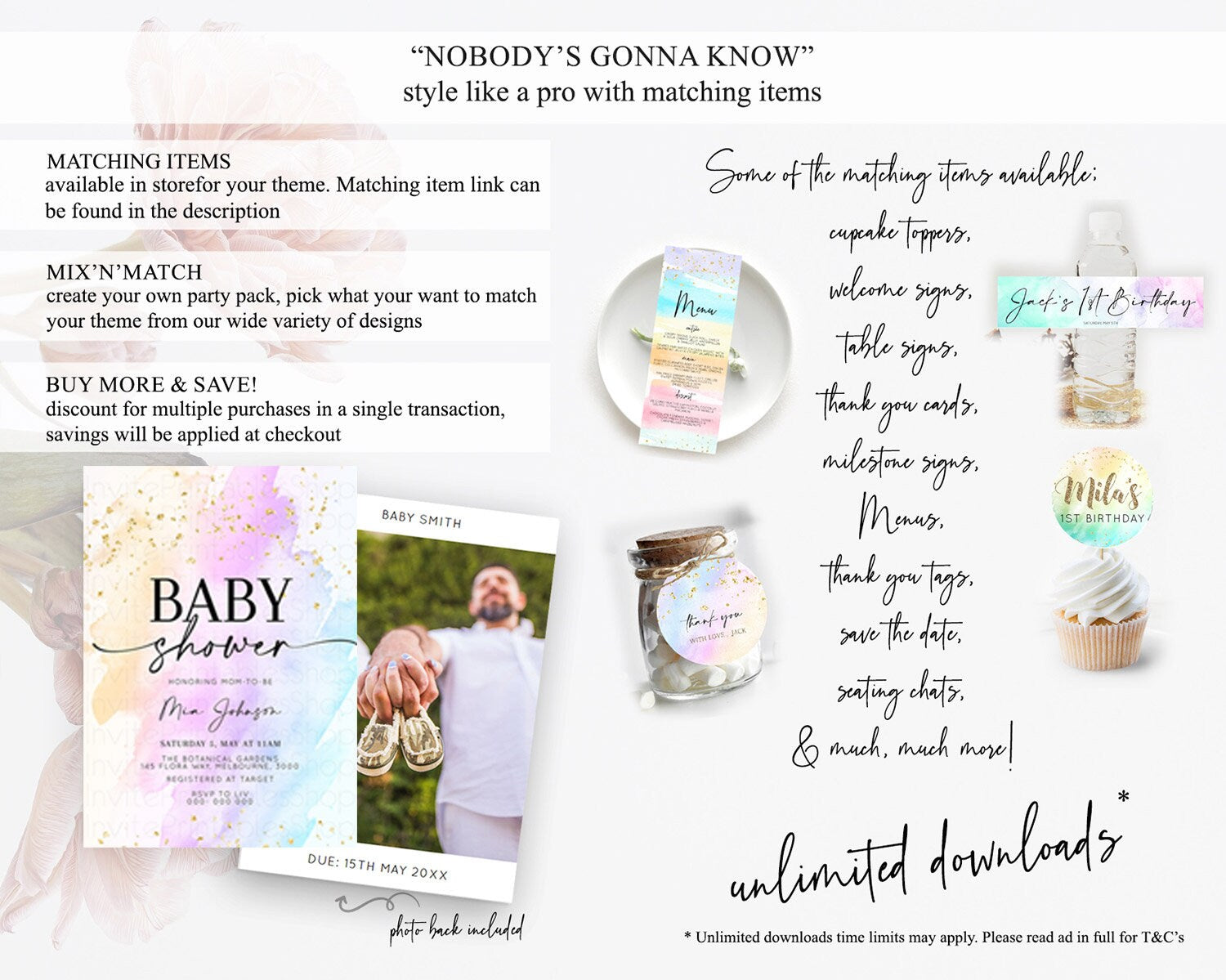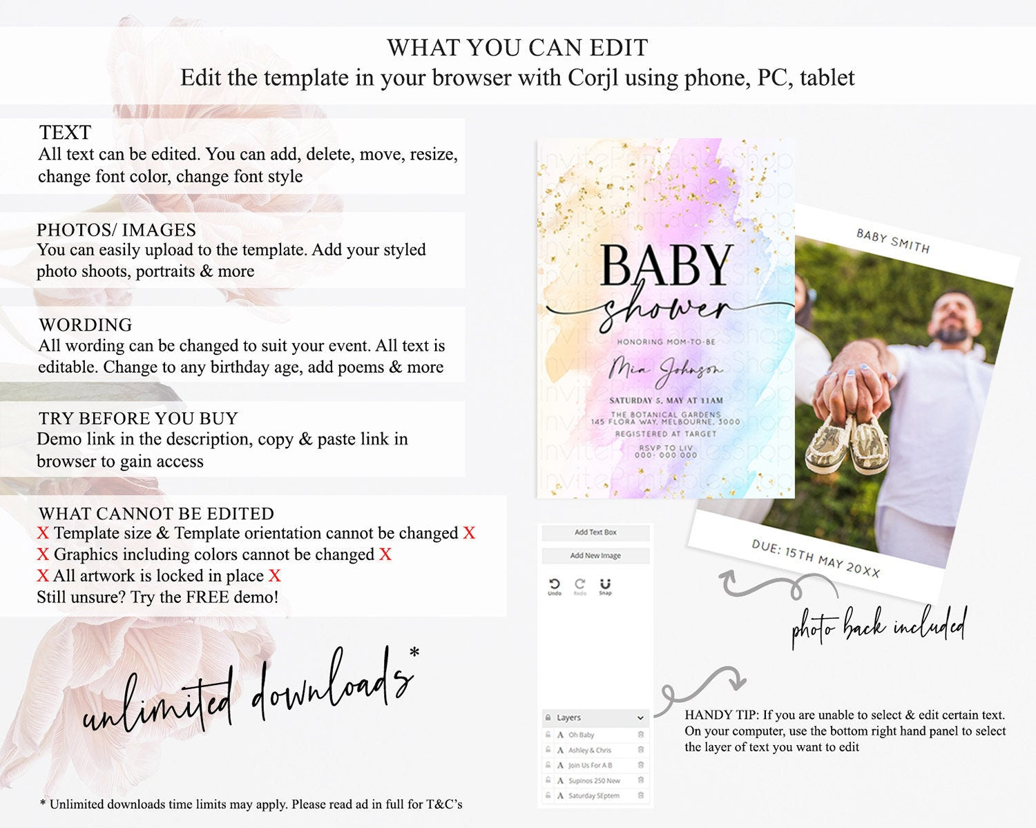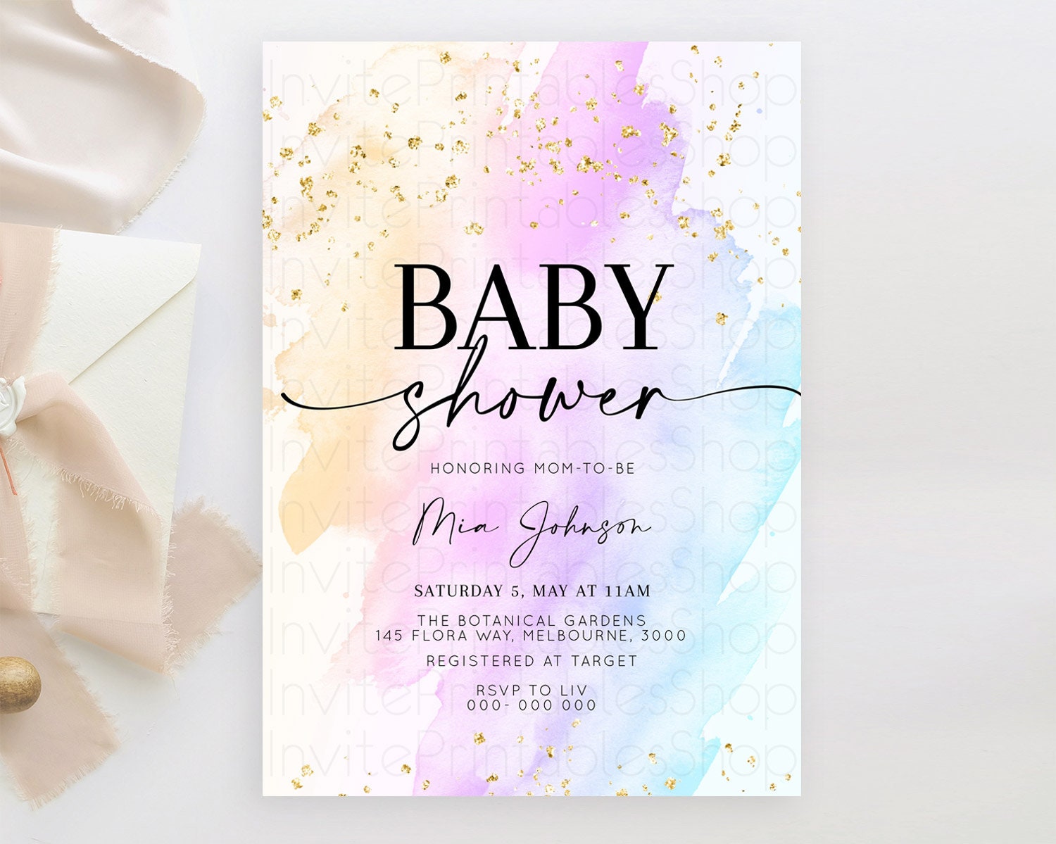 Pastel Baby Shower Invitation Rainbow Baby Shower Invitation Colorful Pastel Watercolor Invitation Gold Glitter Sprinkles Ombre D10175