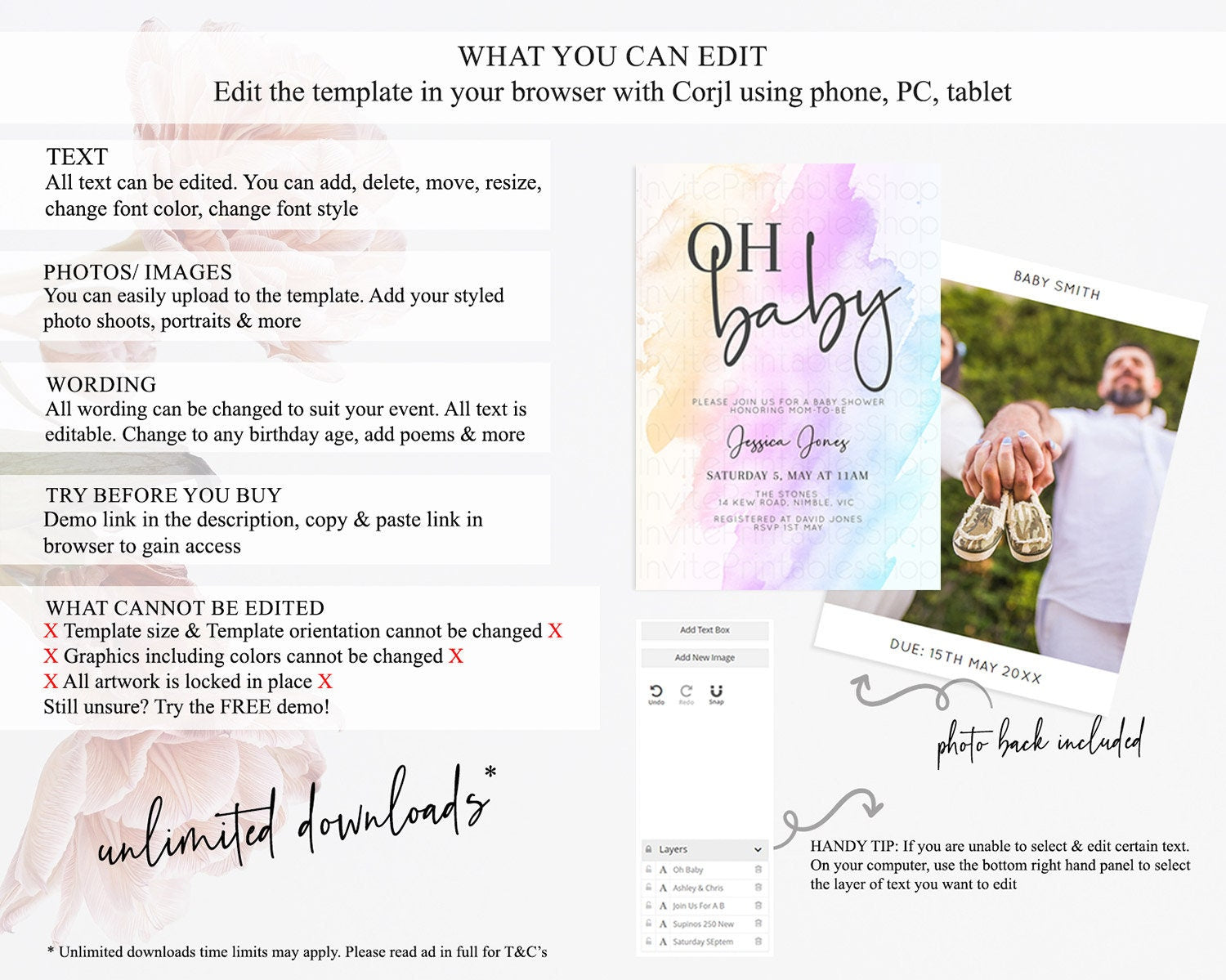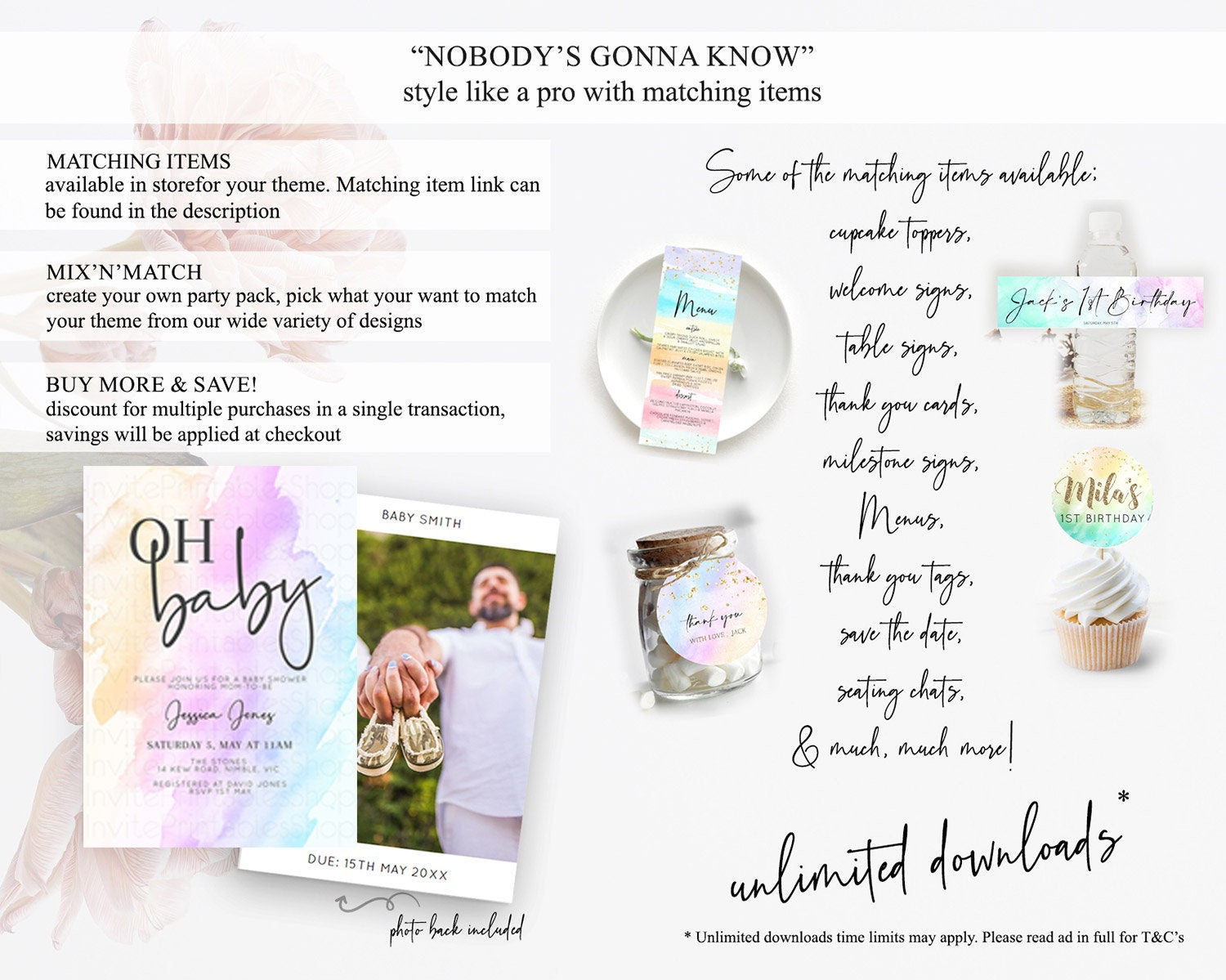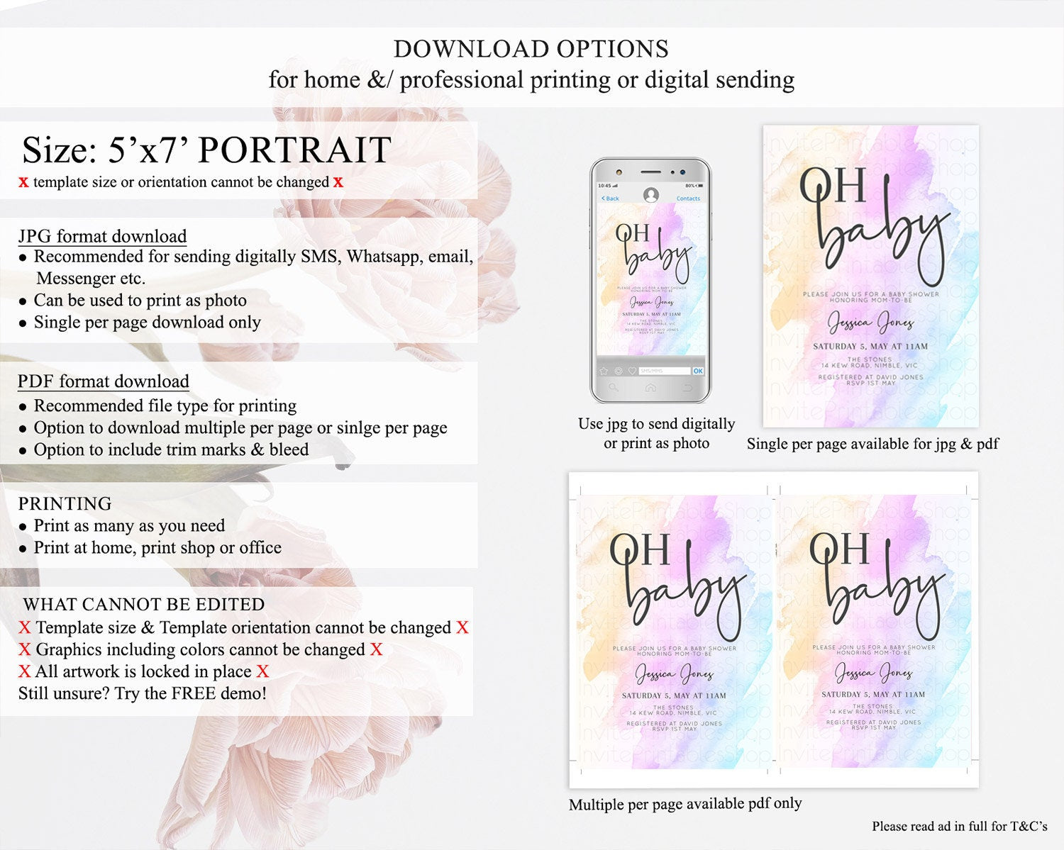 Pastel Baby Shower Invitation Rainbow Baby Shower Invitation Colorful Pastel Watercolor Invitation Gold Glitter Sprinkles Ombre D10177