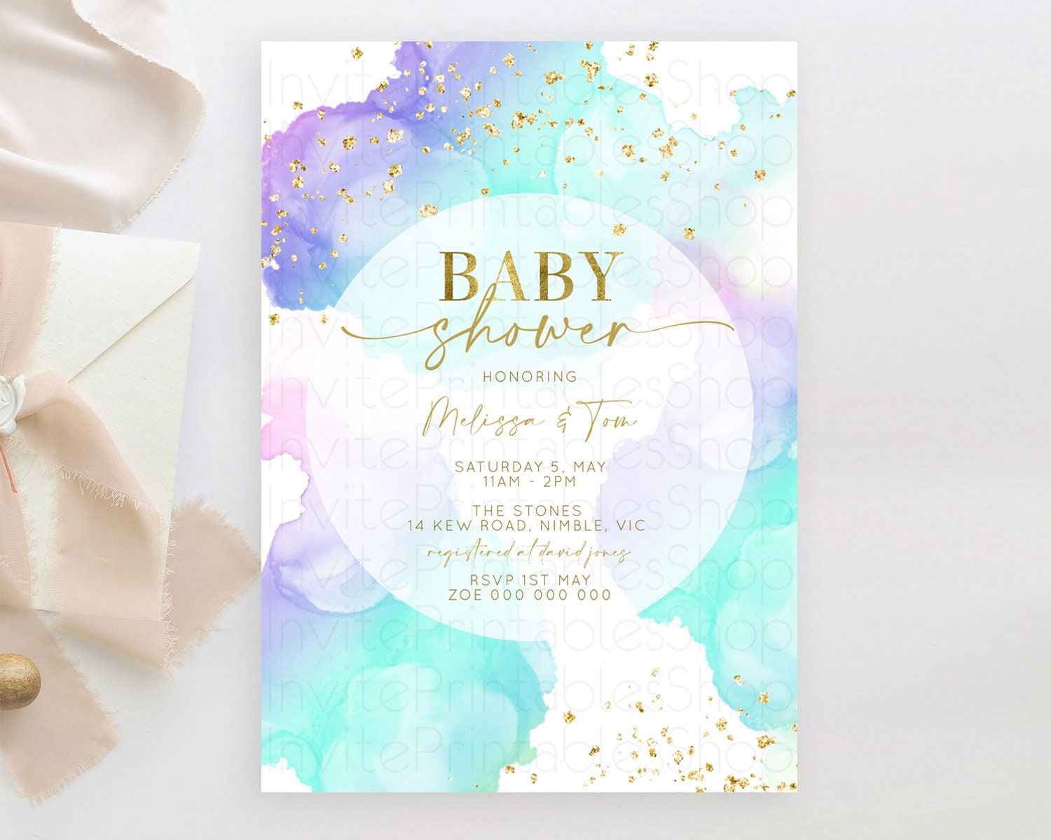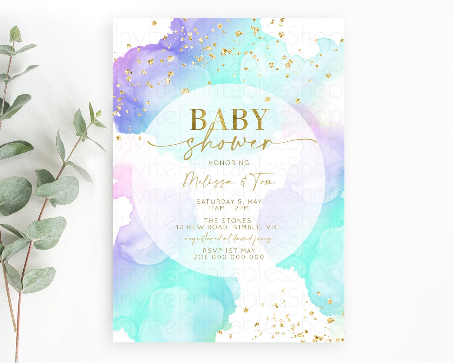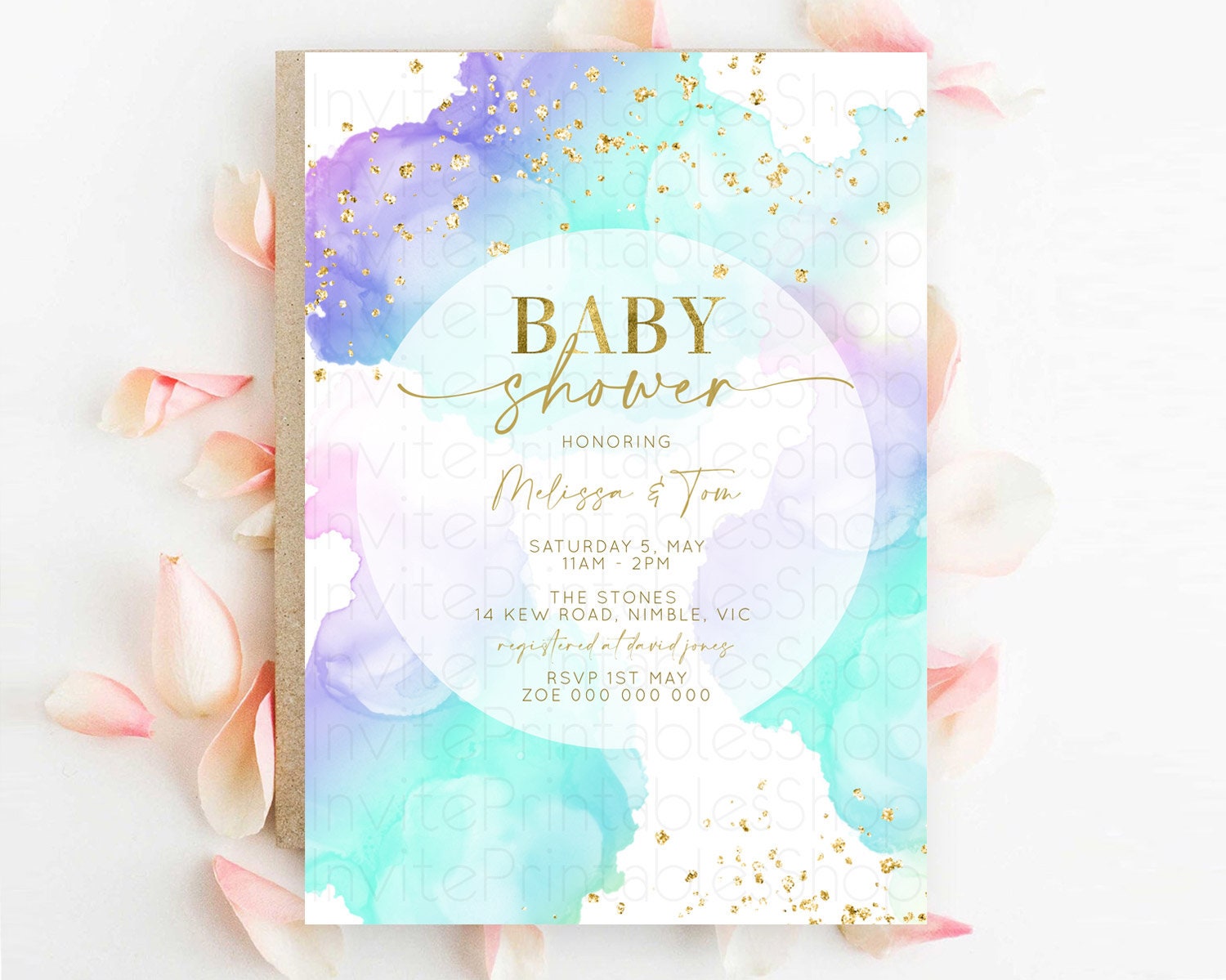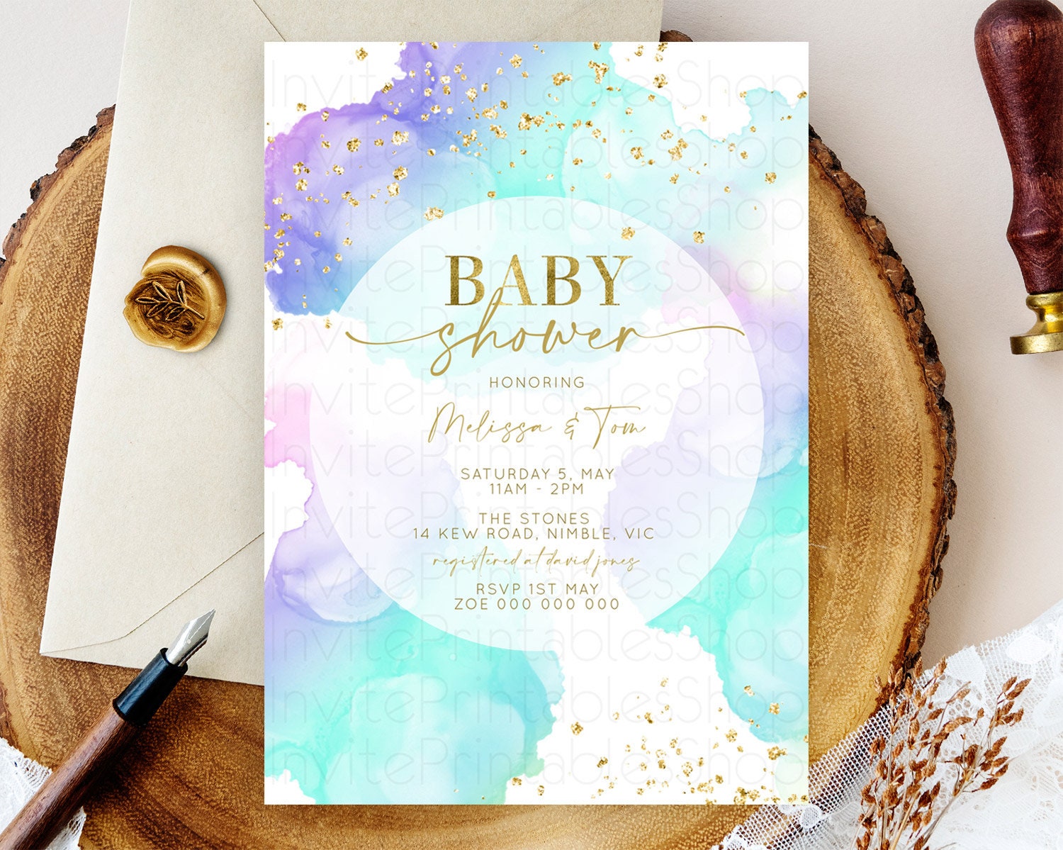 Pastel Baby Shower Invitation Rainbow Baby Shower Invitation Colorful Pastel Watercolor Invitation Gold Glitter Sprinkles Ombre D10212