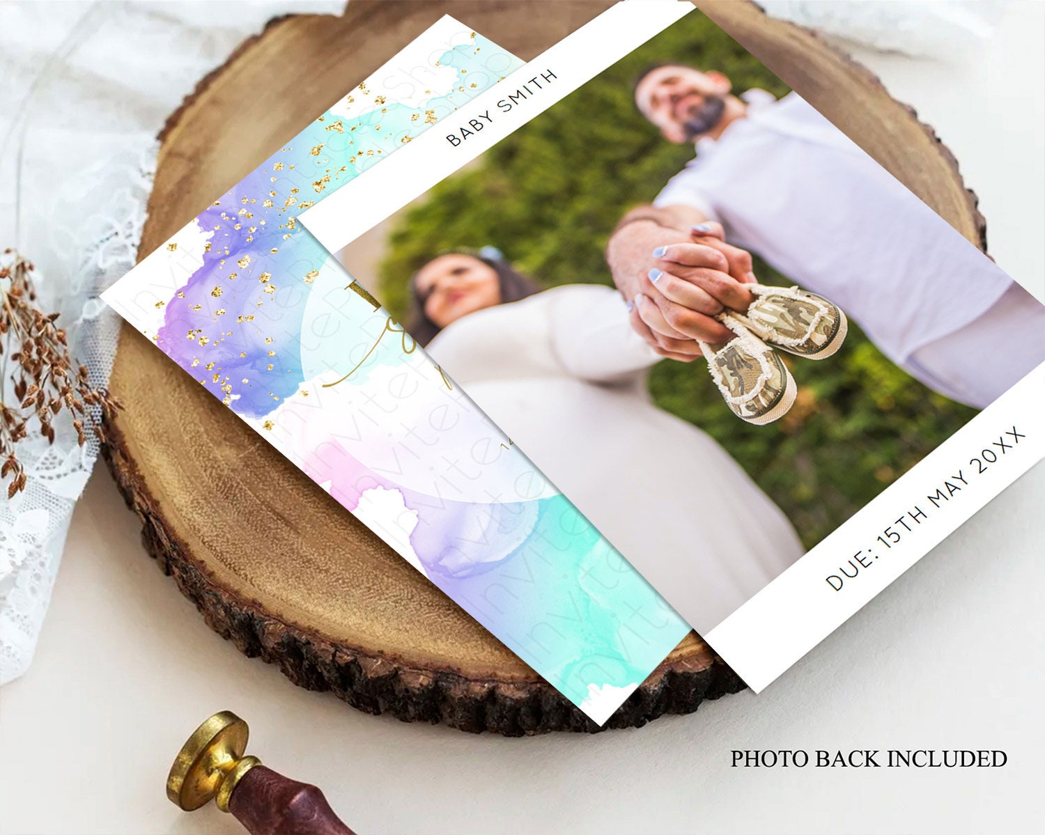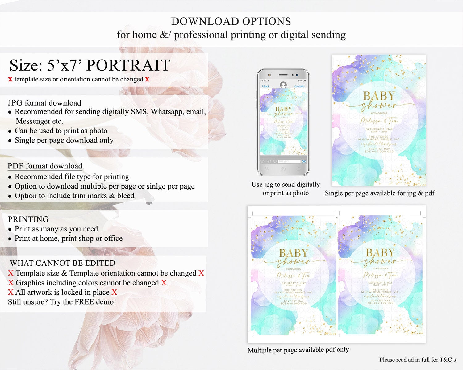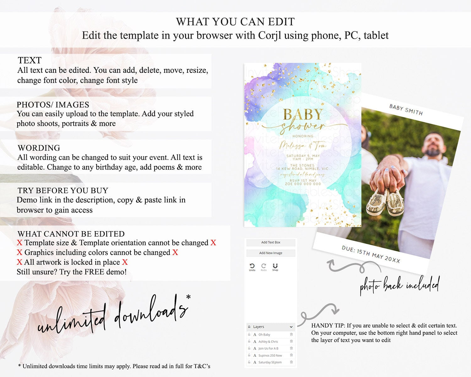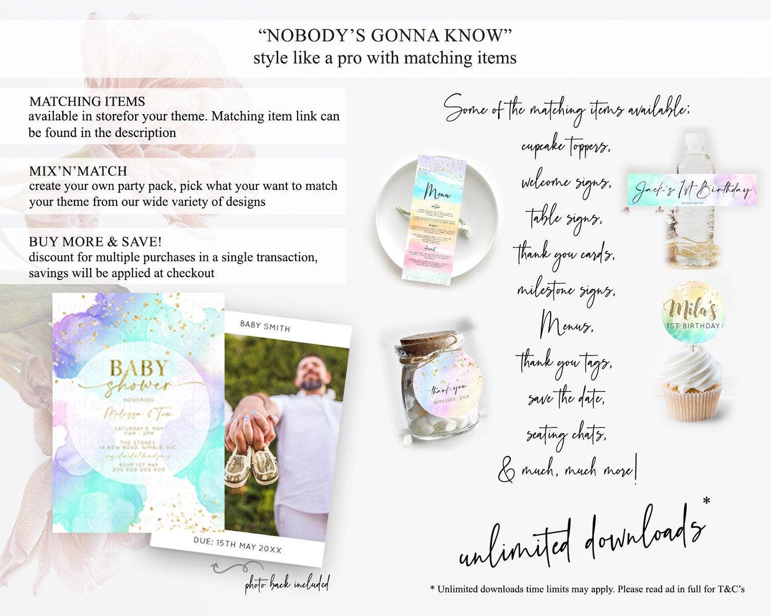 Pastel Baby Shower Invitation Rainbow Baby Shower Invitation Colorful Pastel Watercolor Invitation Gold Glitter Sprinkles Ombre D10212
